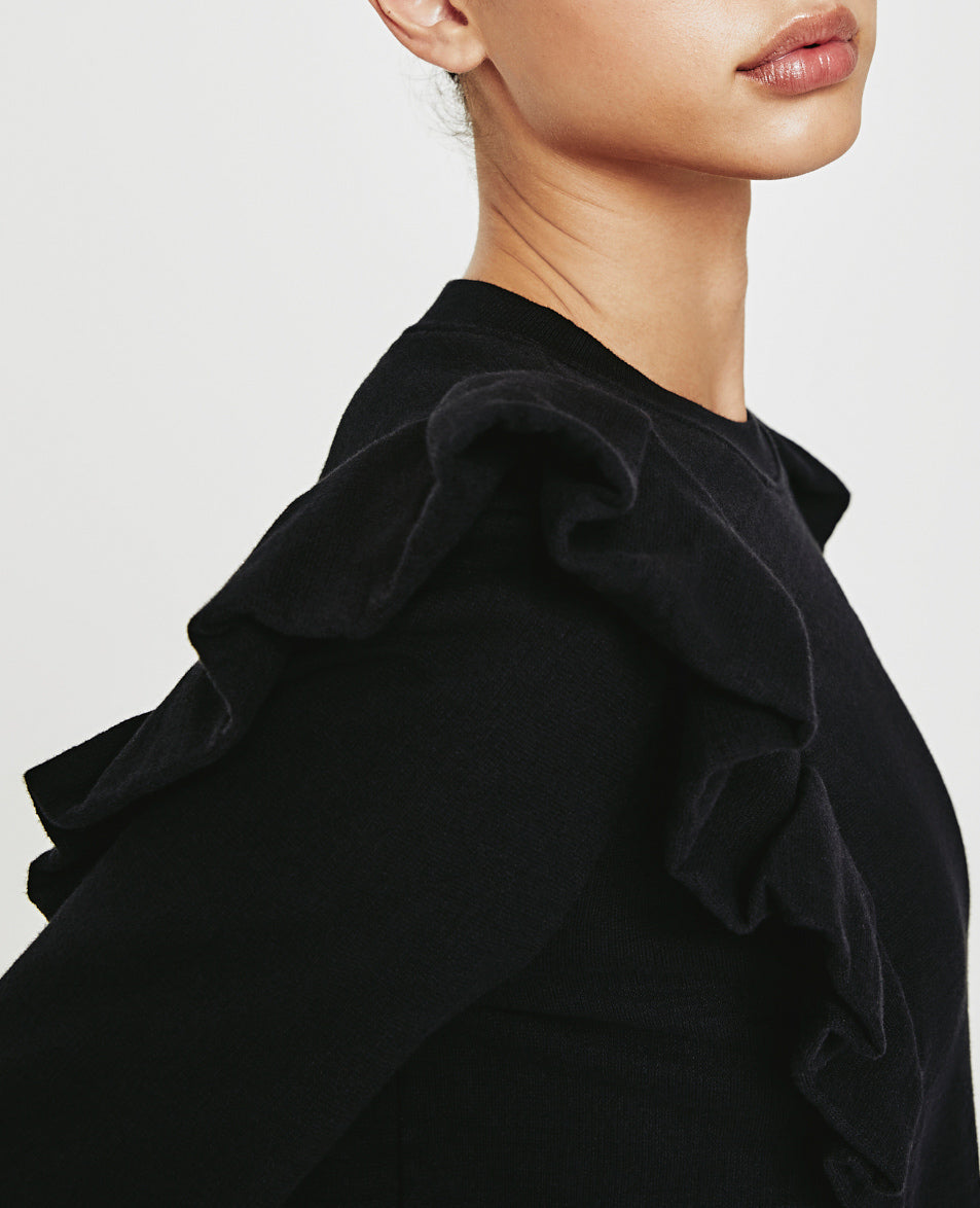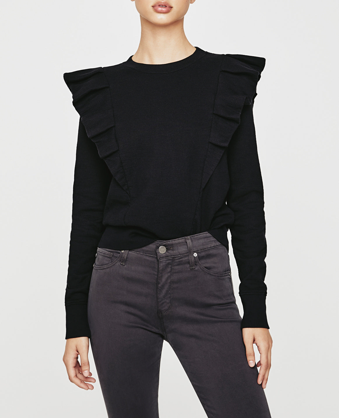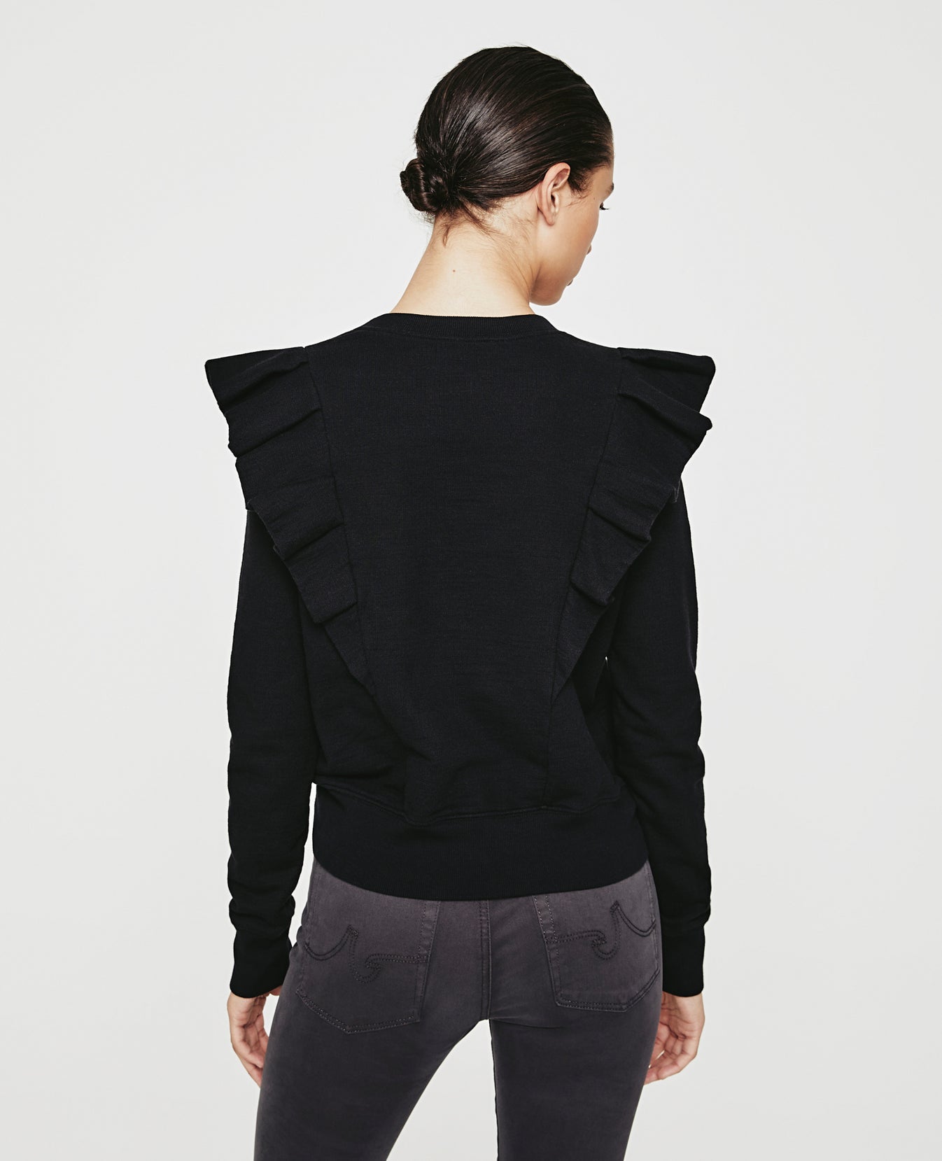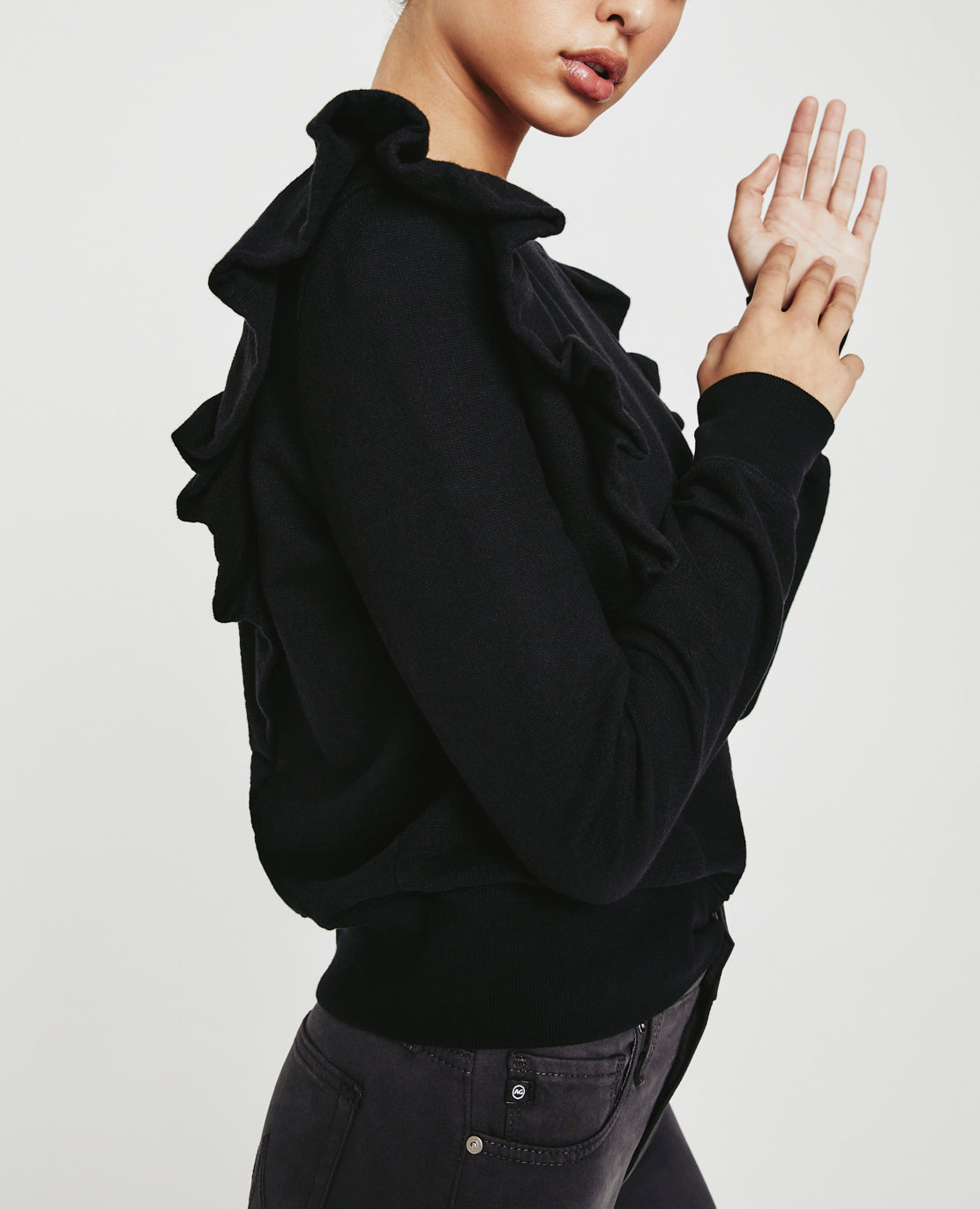 The Abott Sweatshirt for women offers a classic black hue on a not-so-classic silhouette. The Abott functions like any other sweatshirt-designed in Cotton Slub Loopback Terry for luxurious warmth and sophistication. Yet this sweater, complete with ribbed cuffs and hemline, remains unique with its wide, sharp, and ruched shoulders that taper in, offering a distinctive garment for your simplistic winter wardrobe.