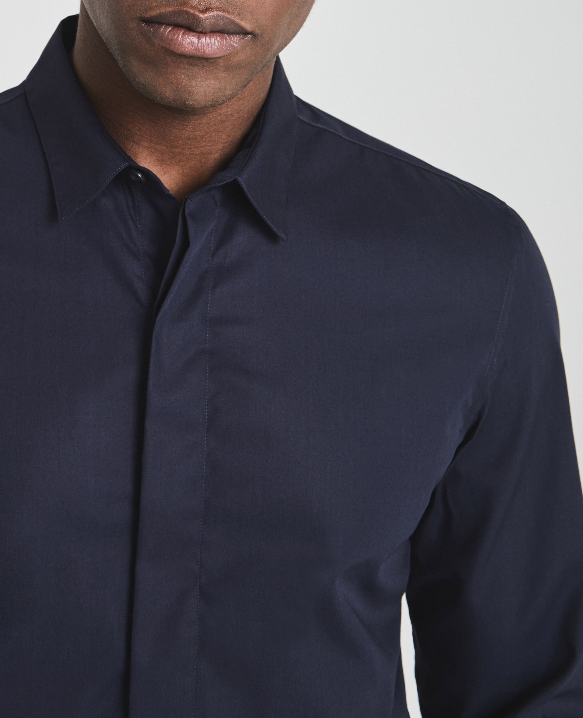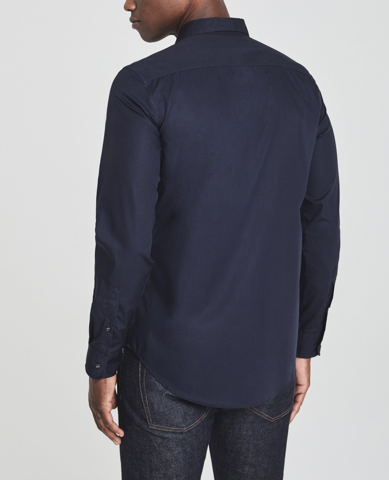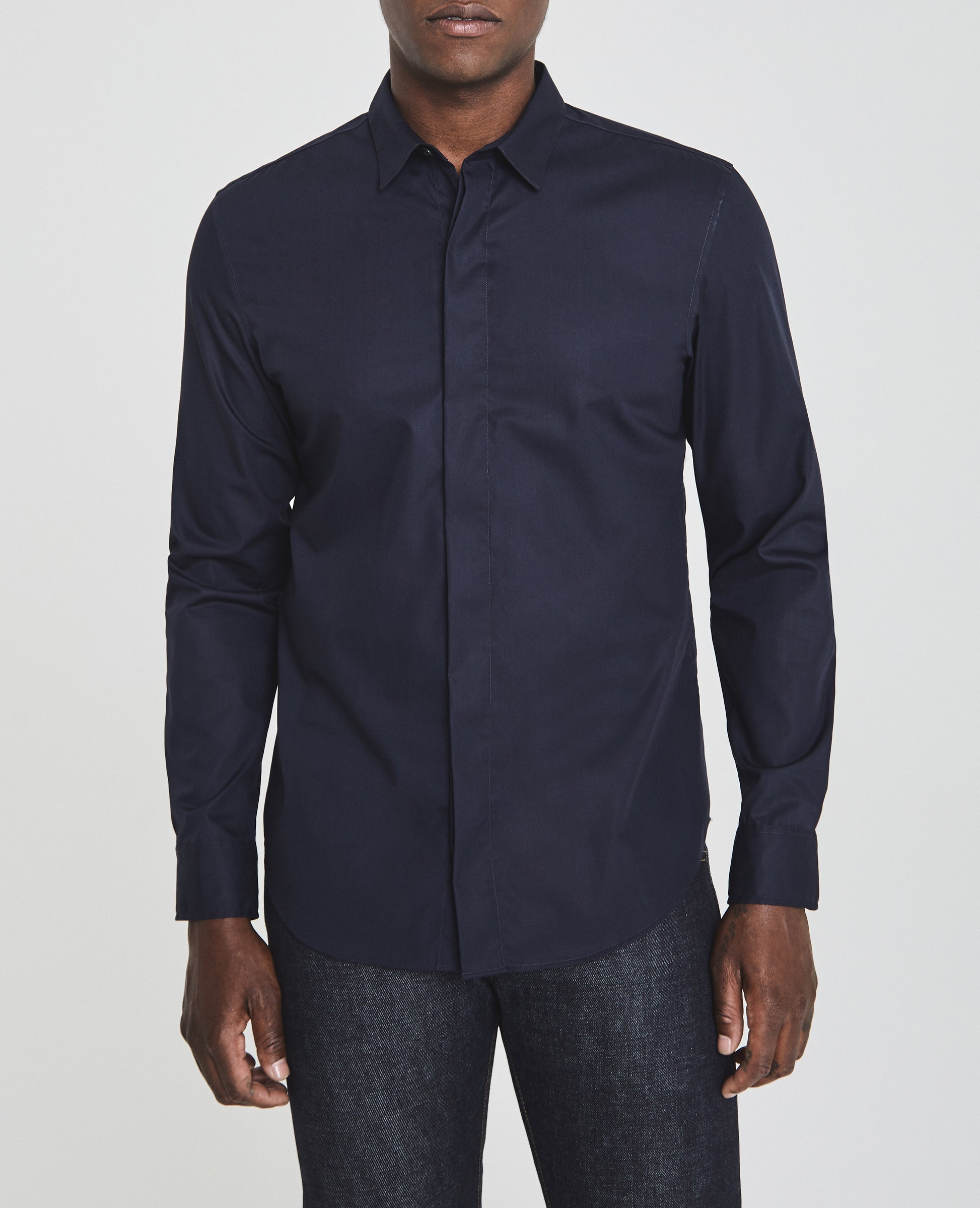 The Ace Dress Shirt is a classic button-up shirt for men featuring a classic navy hue and a sophisticated slim silhouette with long cuffed sleeves, straight collar, rounded hem, and a hidden button placket for added polish. This men's long sleeve is designed in 4 oz. Moxie Poplin for an eveningwear look and smooth feel.