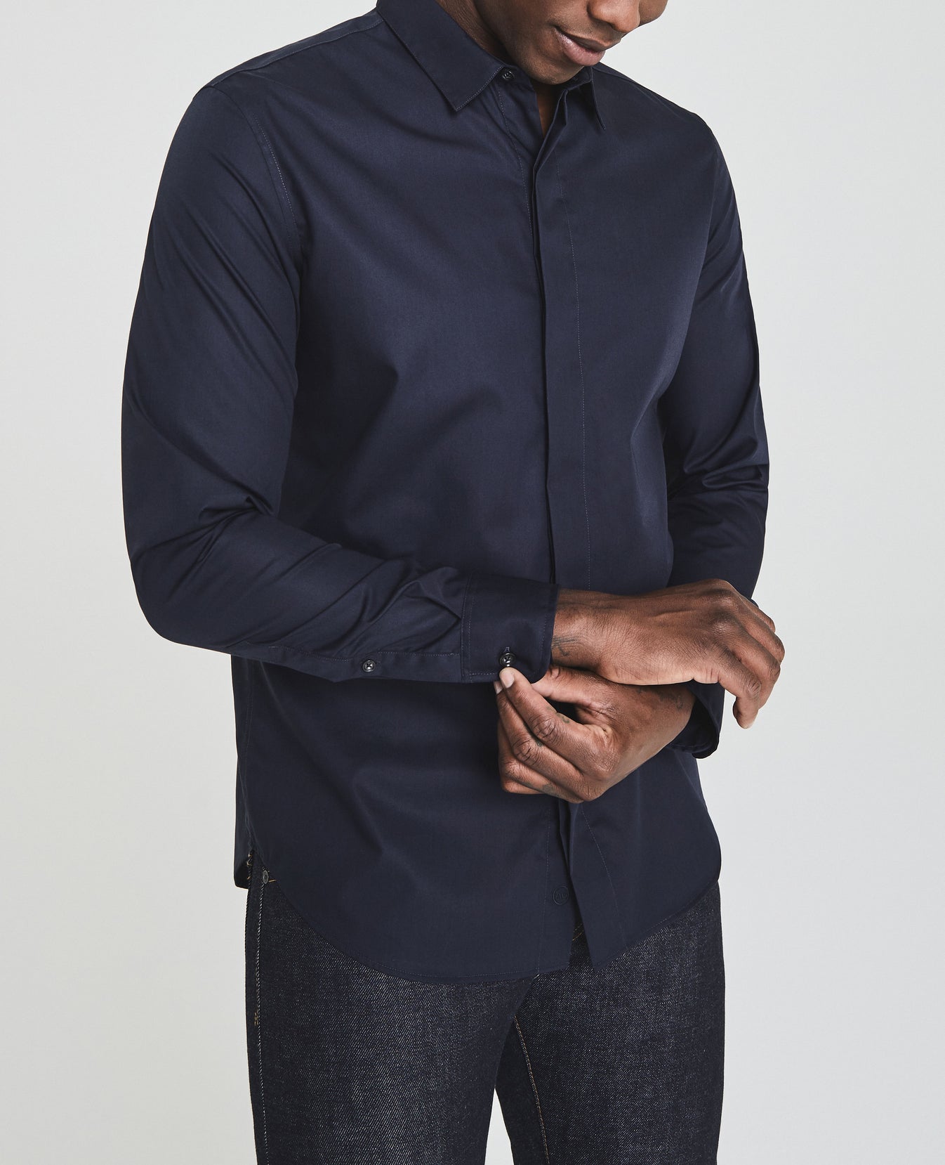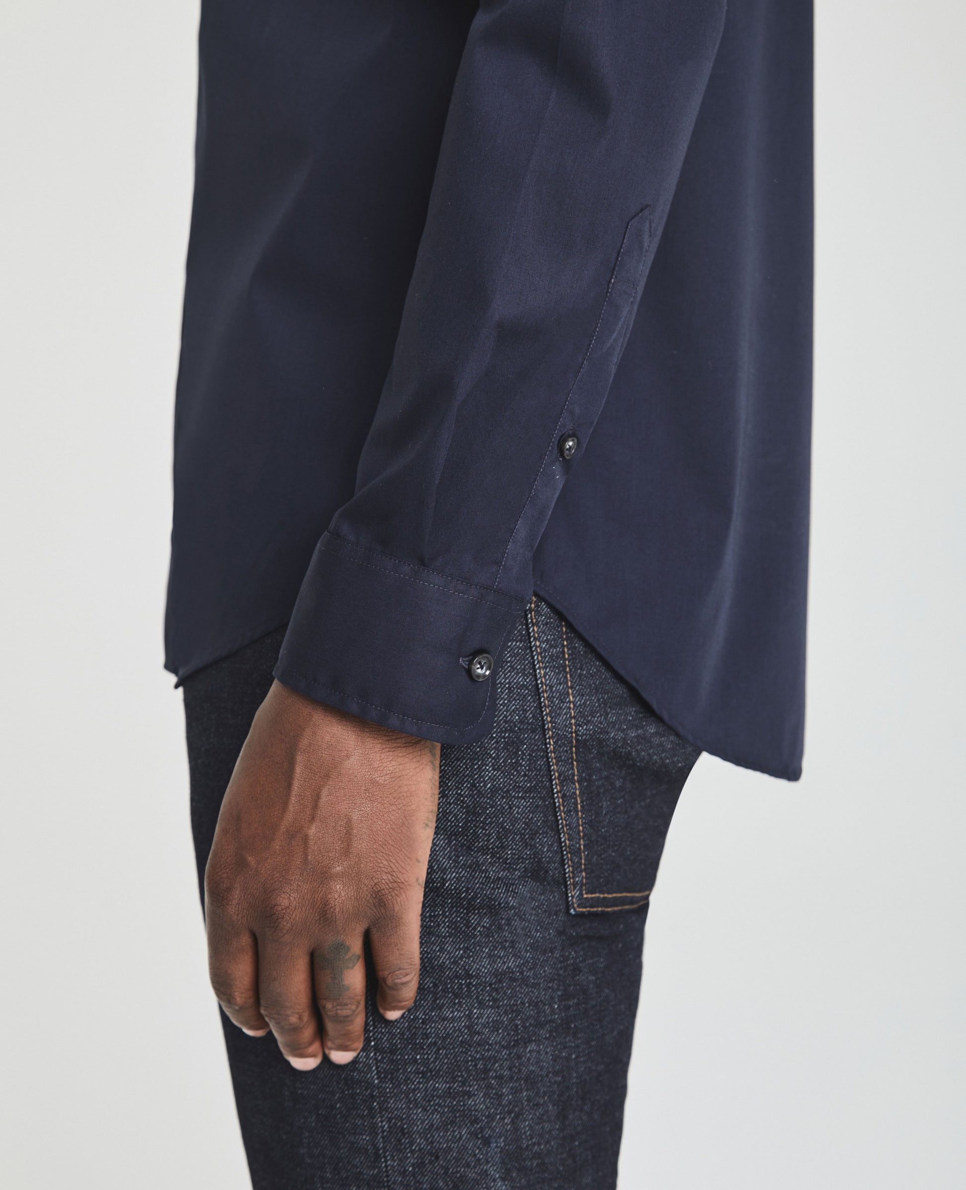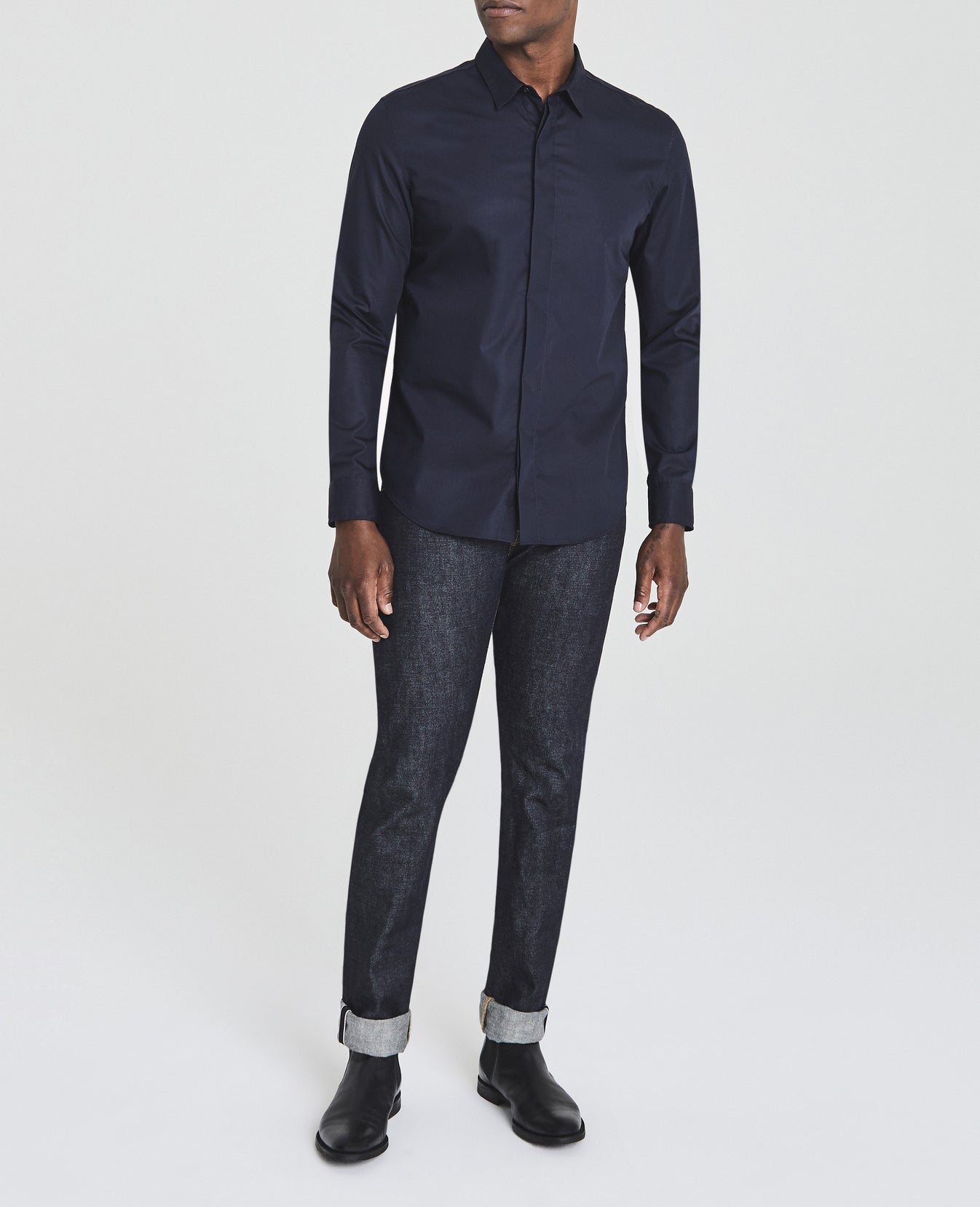 The Ace Dress Shirt is a classic button-up shirt for men featuring a classic navy hue and a sophisticated slim silhouette with long cuffed sleeves, straight collar, rounded hem, and a hidden button placket for added polish. This men's long sleeve is designed in 4 oz. Moxie Poplin for an eveningwear look and smooth feel.