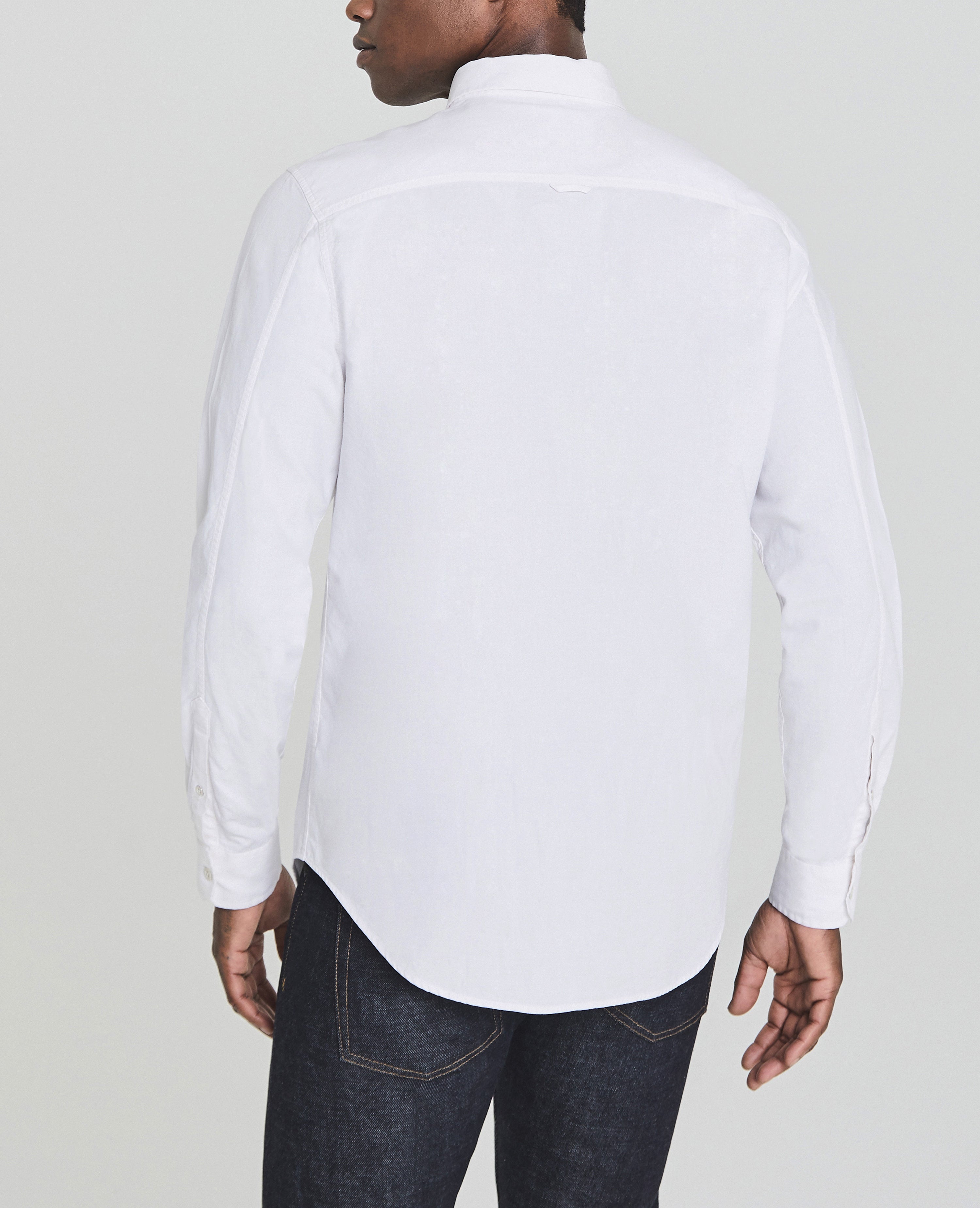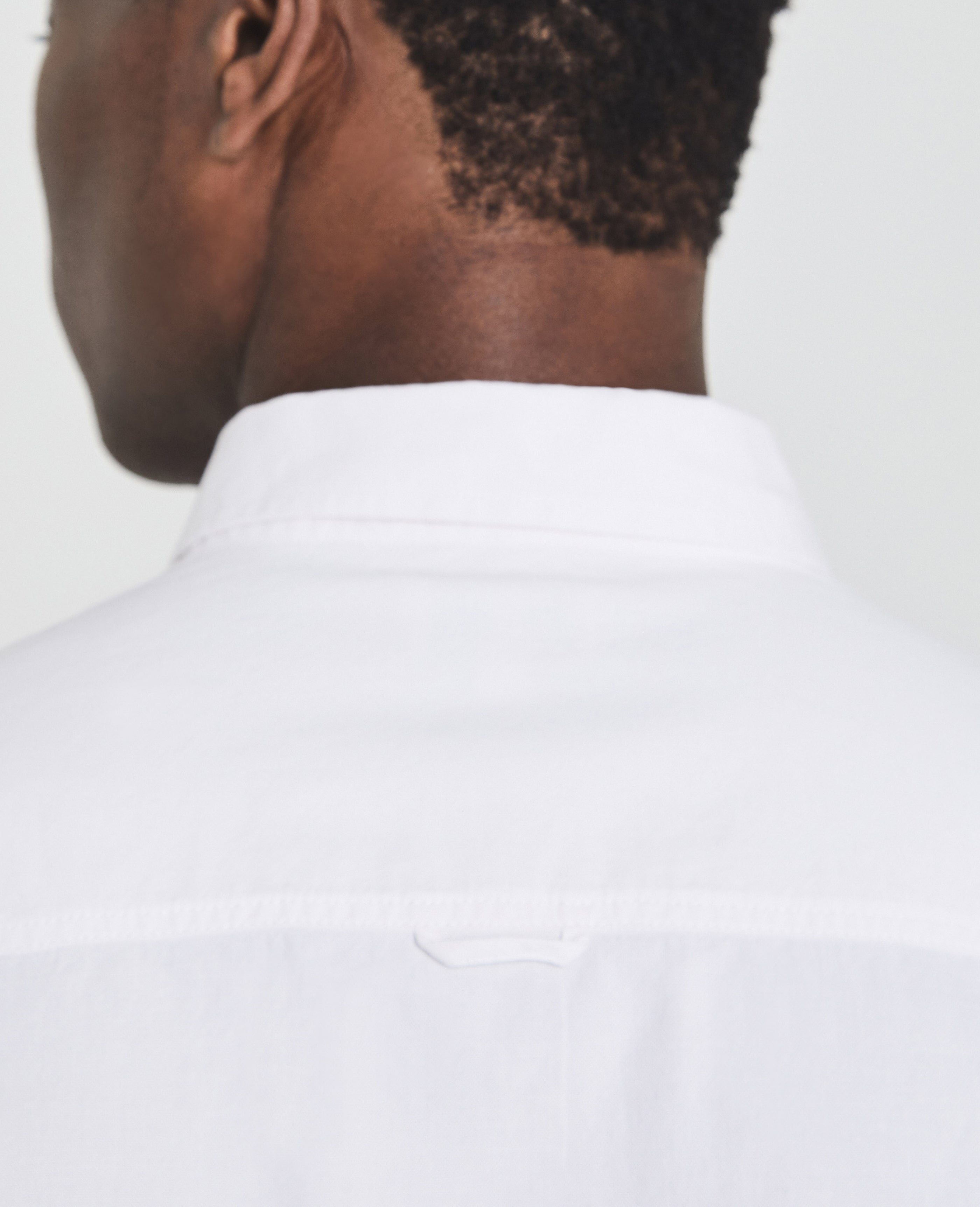 The Ace Shirt is a casual button-up shirt for men featuring an off-white hue and a sophisticated slim silhouette with long cuffed sleeves, button-down collar, and rounded hem, and finished with an ivy league-inspired locker loop at the back. This men's long sleeve is designed in a thick cotton oxford fabrication for day to night wear with classic appeal.