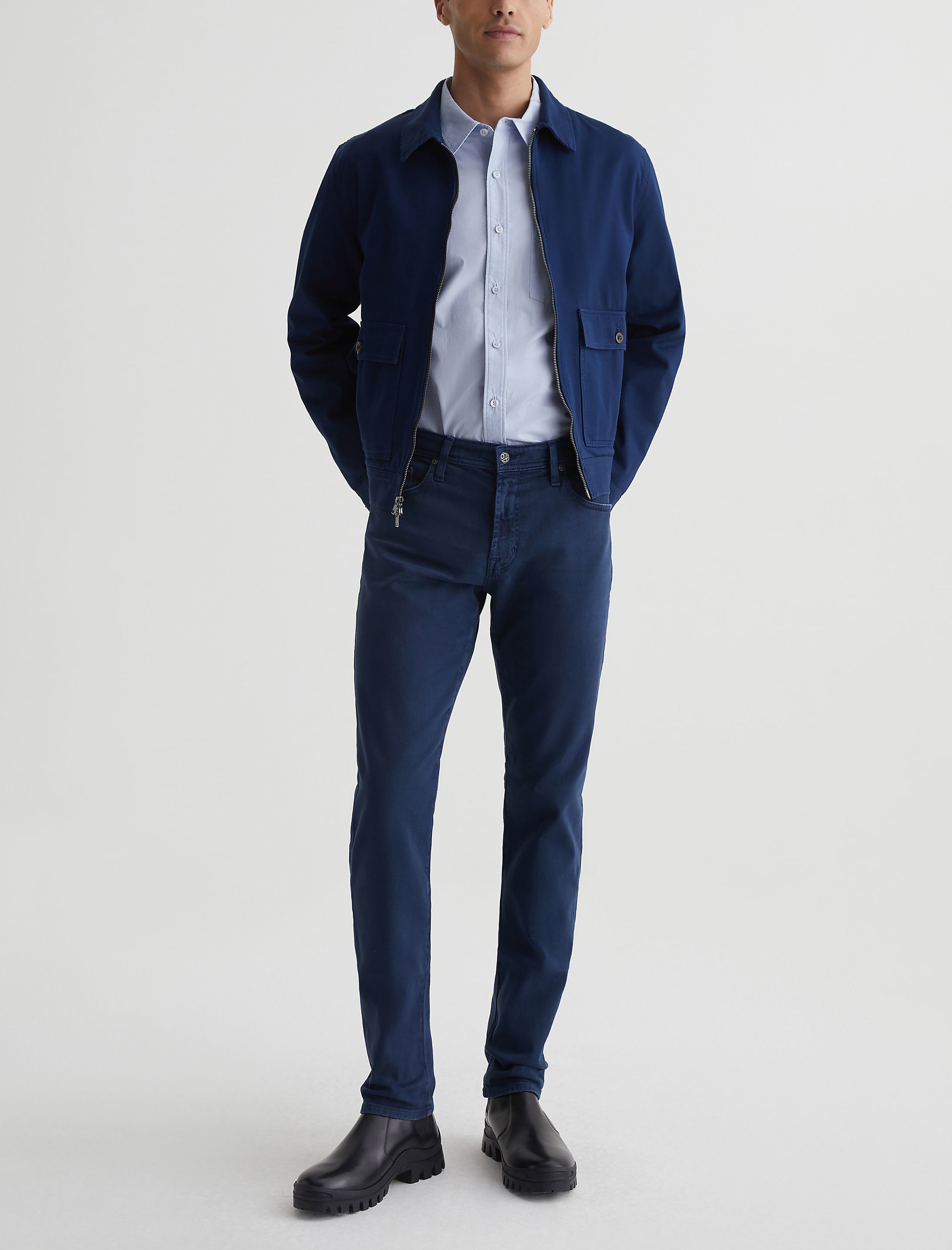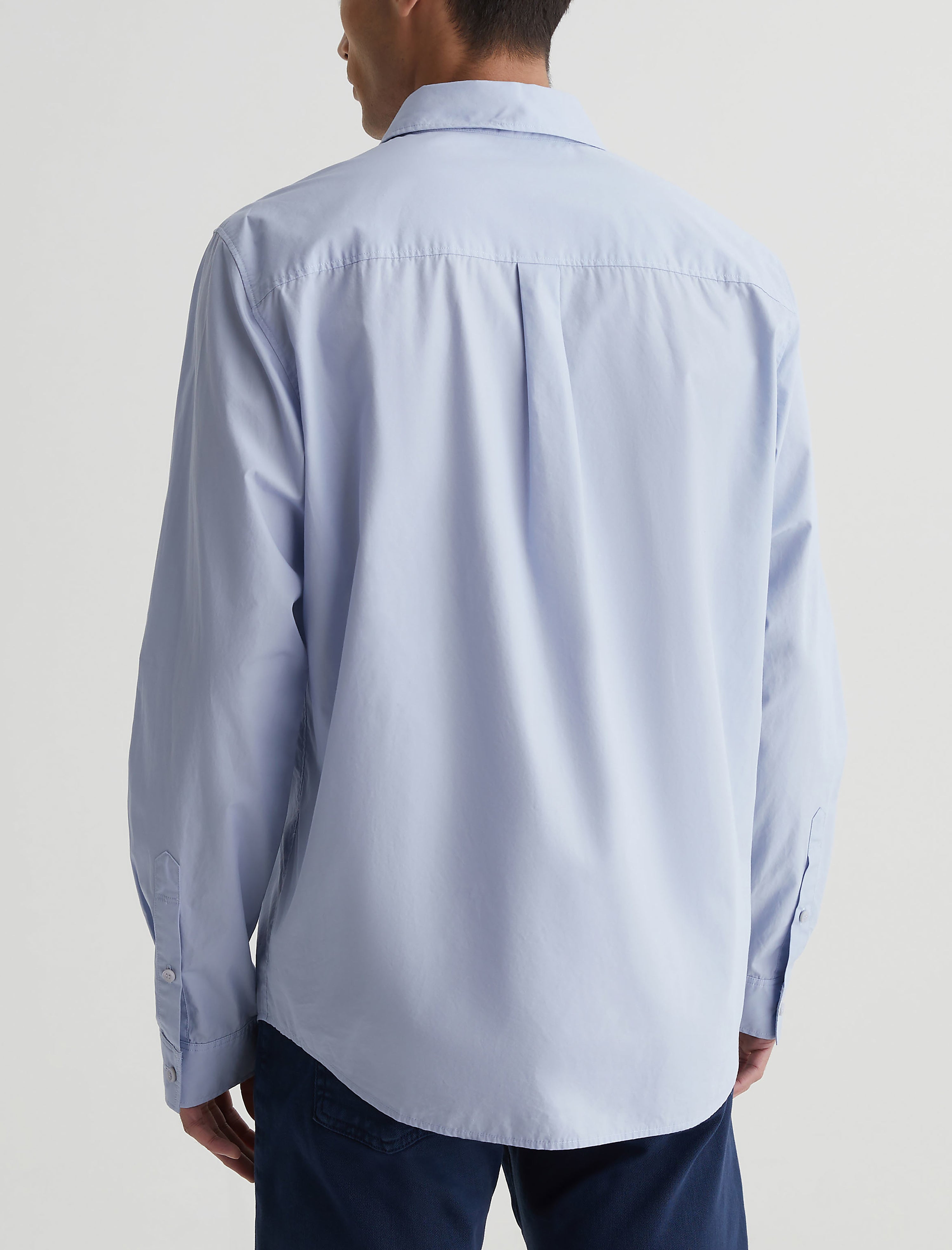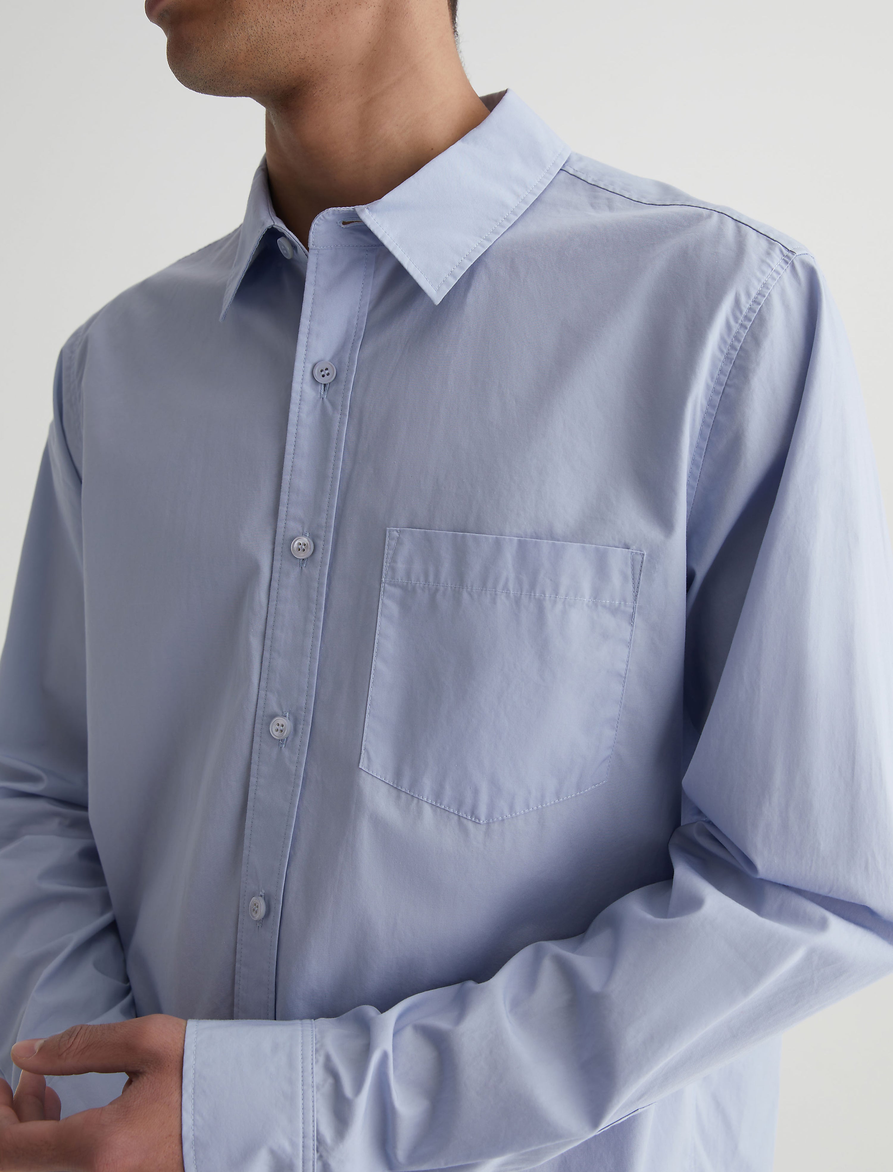 The Aiden Shirt is cut from crisp cotton poplin in a pale blue shade. This men's shirt is cut for a classic fit with long sleeves, a pointed collar, and buttons down the front placket. It's got a shirttail hem, plus a single patch pocket at the chest.
