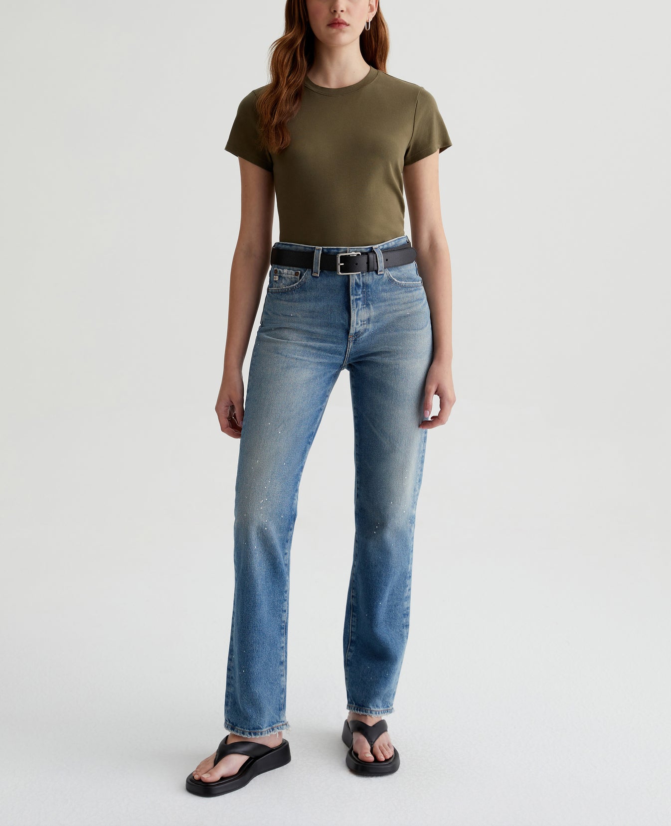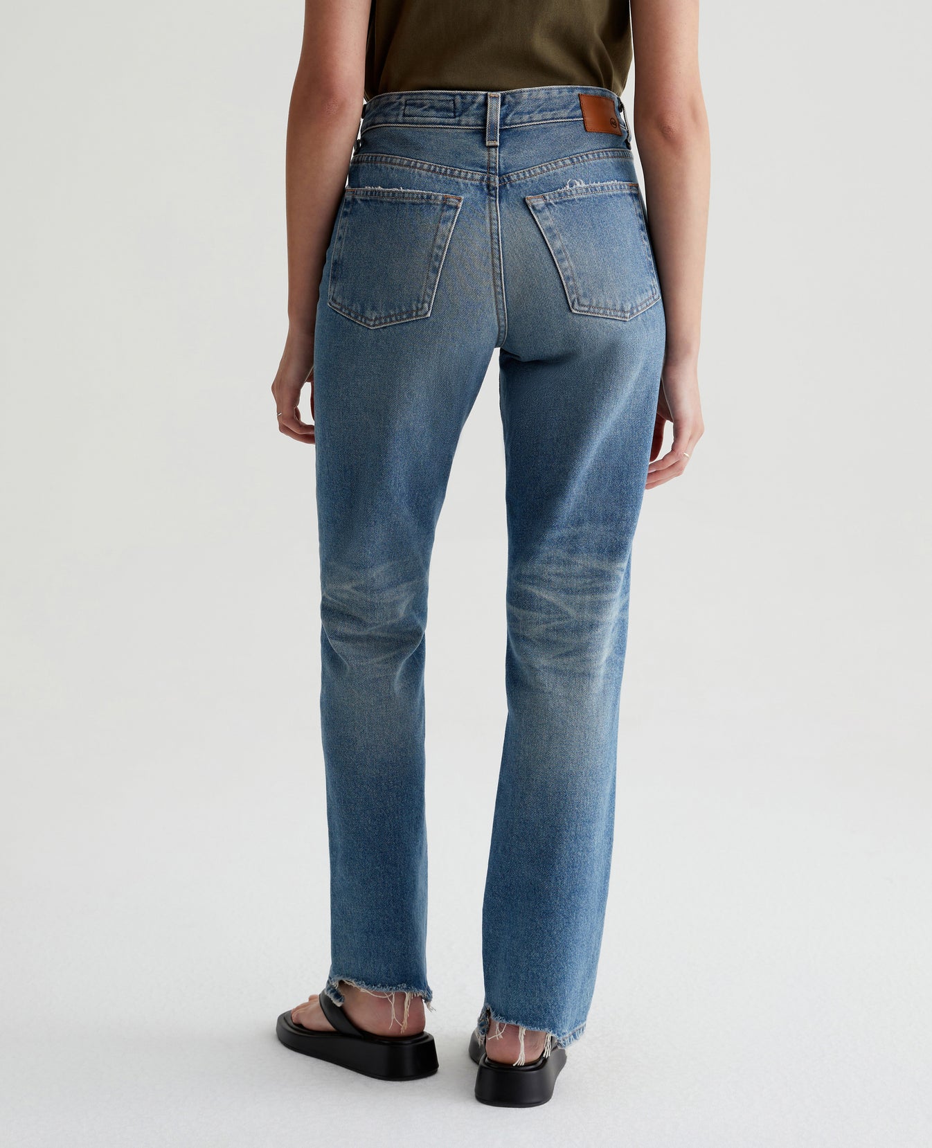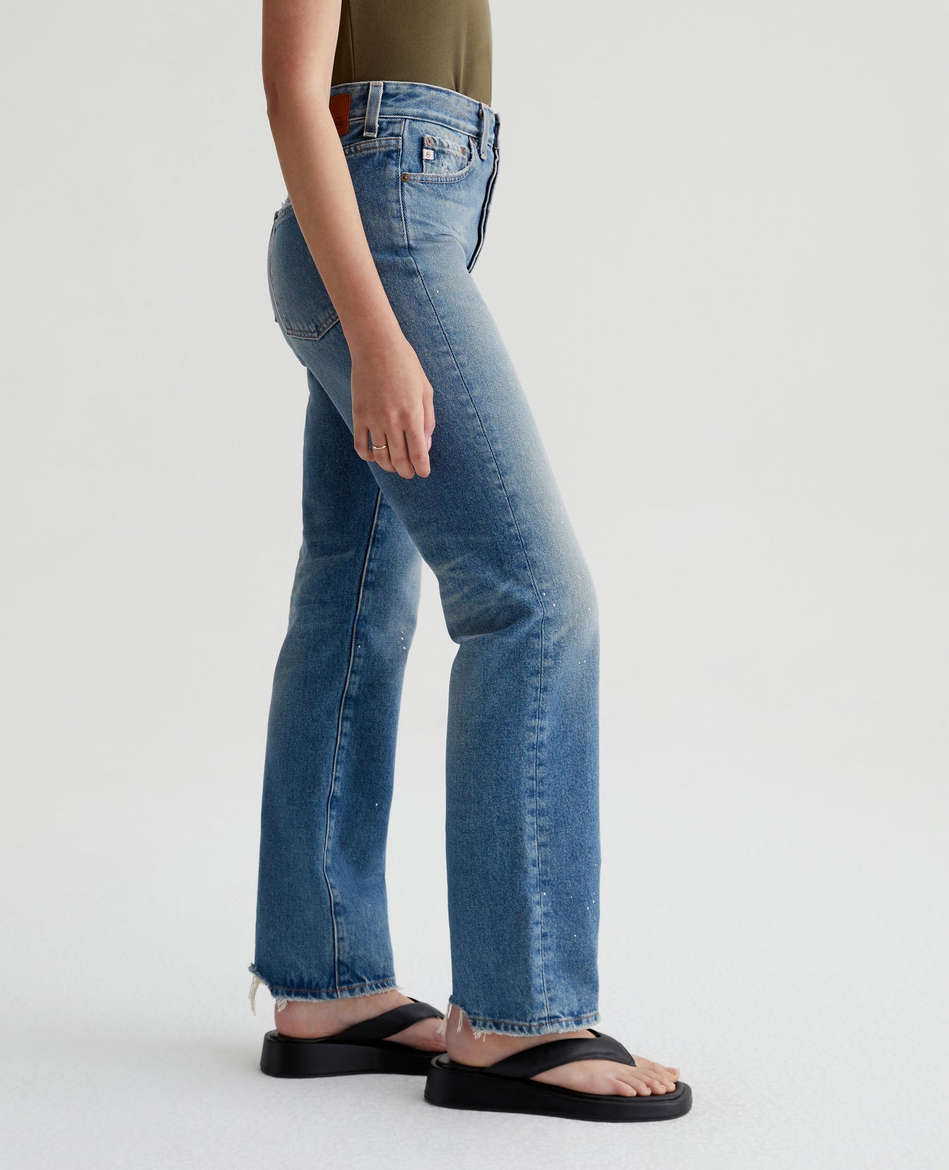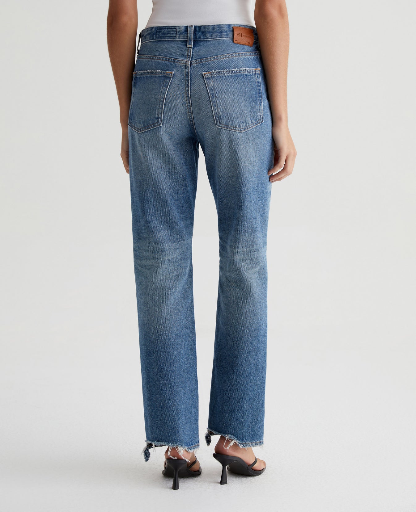 Alexxis is a vintage straight jean for women, updated here in a 15-year medium wash with vintage-inspired fading, distressing, and white paint flecks. The pair has worn hems that are torn up at the back. Designed with a retro high waist and a button fly, the Alexxis features a fitted silhouette through the hips and a straight fit down the legs. This women's jean is crafted from 12.75 oz. Savior Rigid Denim in 100% cotton.