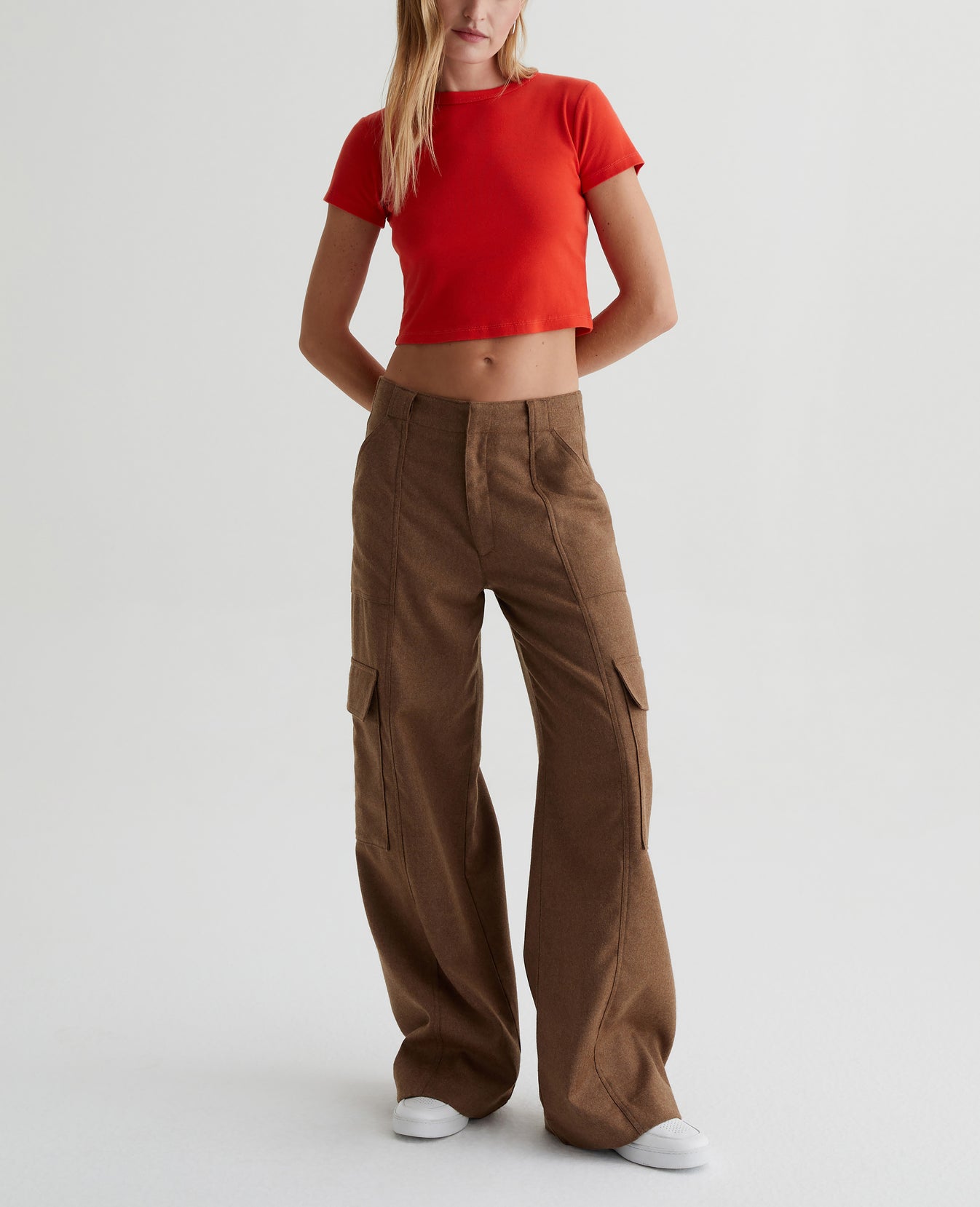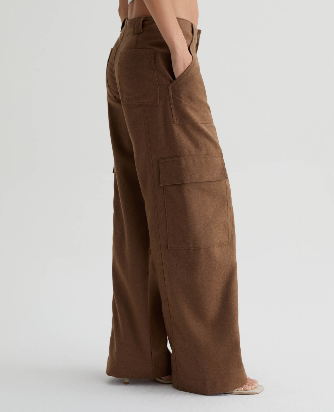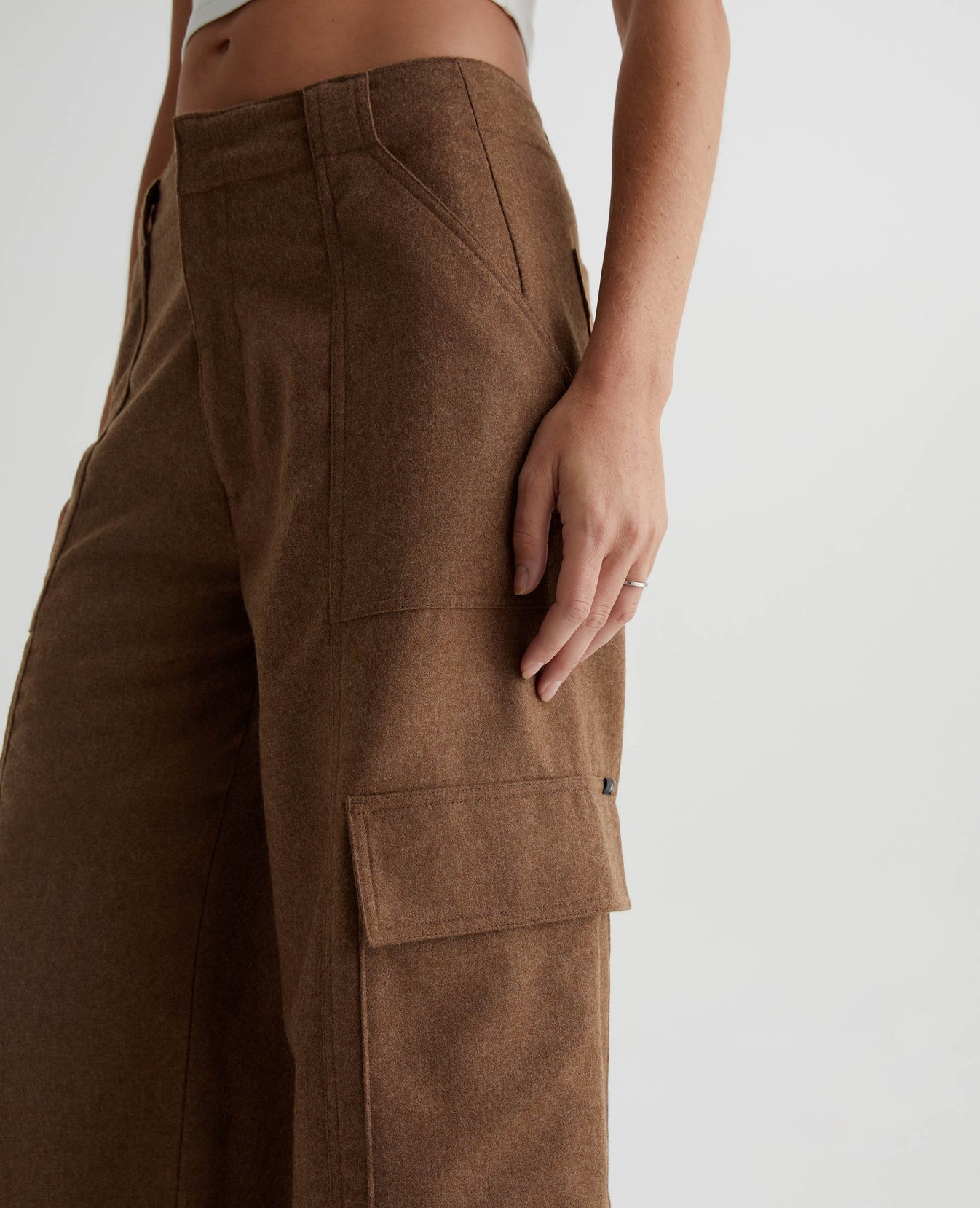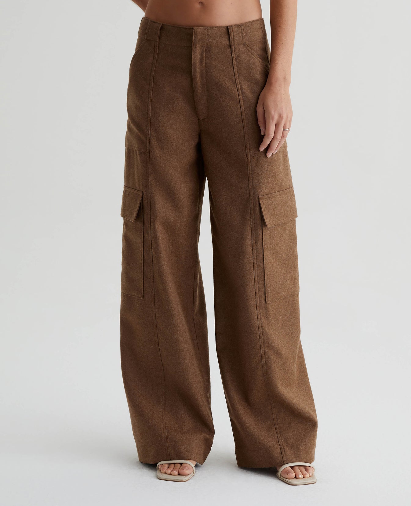 The EmRata x AG Amia in Umber is a wide-leg cargo trouser with attitude. Constructed from a structured melange wool twill that elevates this trouser’s sophistication and quality. Its relaxed fit with oversized pockets makes it enticing for everyday wear. The long inseam lengthens the leg and pools at the hems for a chic and flattering ensemble. The vertical seam detailing, wide belt loops, and a zip fly with hook-and-bar closure tie this classic pant together with refined details. Designed in partnership with Emily Ratajkowski, the EmRata x AG capsule reflects the model's personal style with a curated collection of versatile pieces able to pair effortlessly together for everyday elevated appeal.