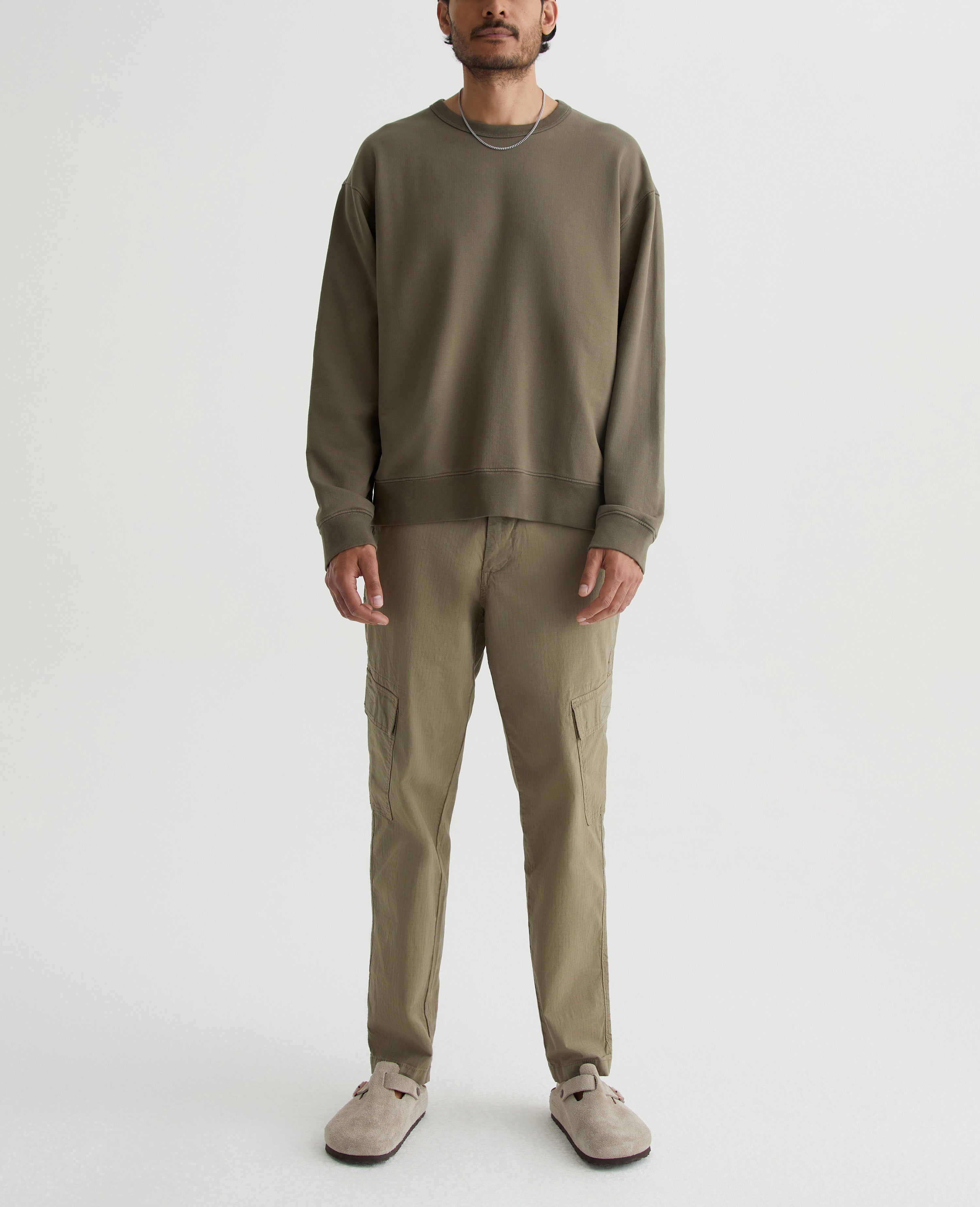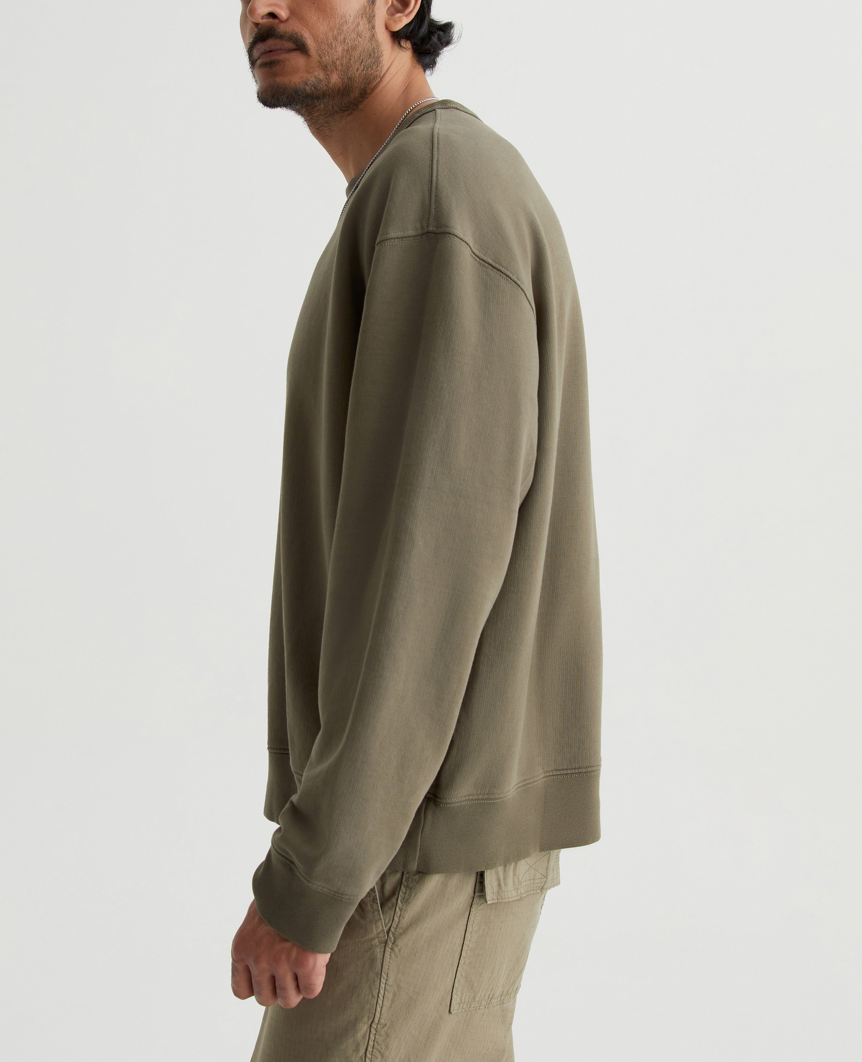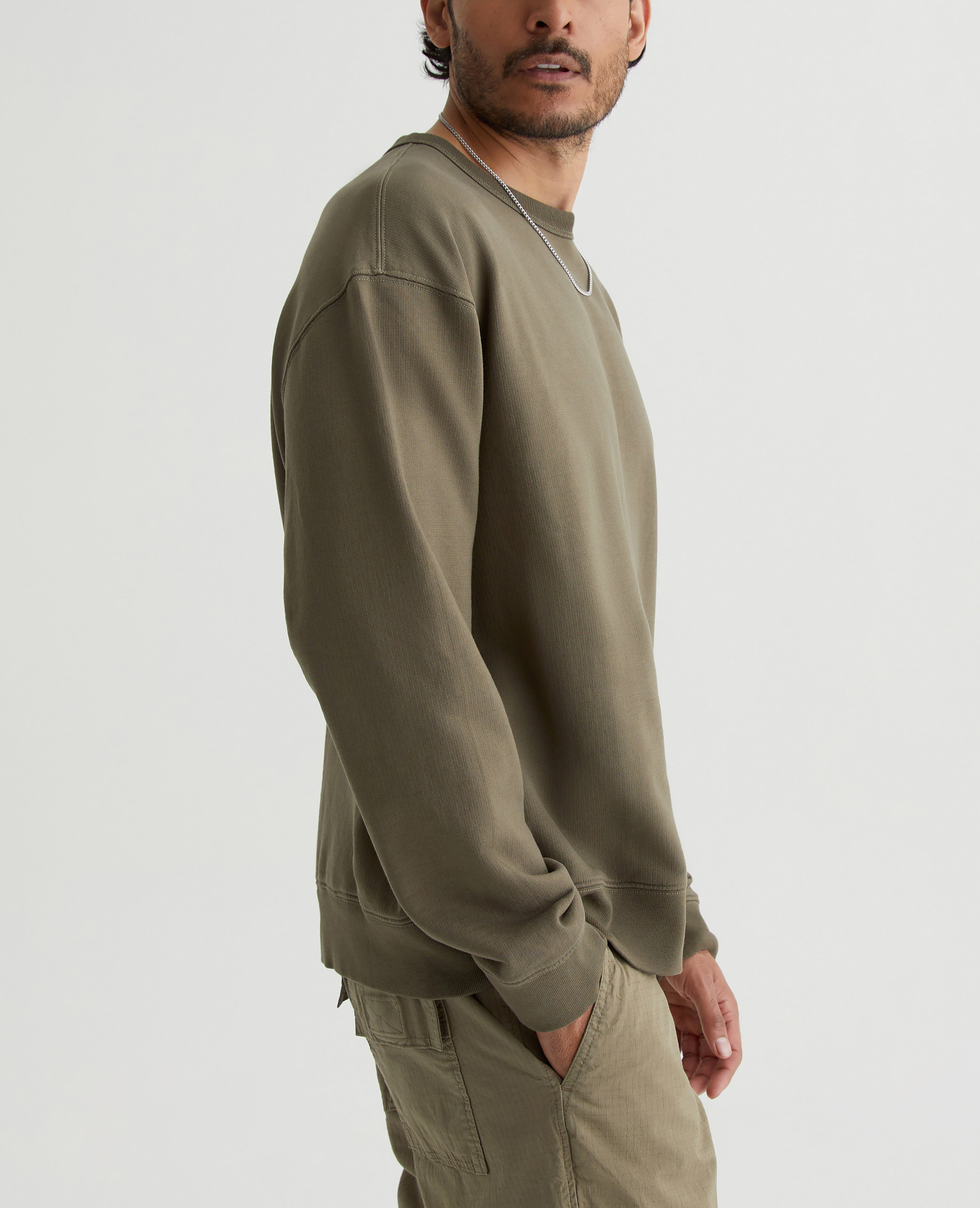 The Arc Crew is our classic crewneck sweatshirt in a relaxed fit. Featuring a subdued green color, this men’s long-sleeve style has an extra-comfortable feel in AG's Essential Luxe Terry, which has been specially knitted with pima cotton to prevent torquing, shrinking, and color loss. Ribbed trim finishes the look.