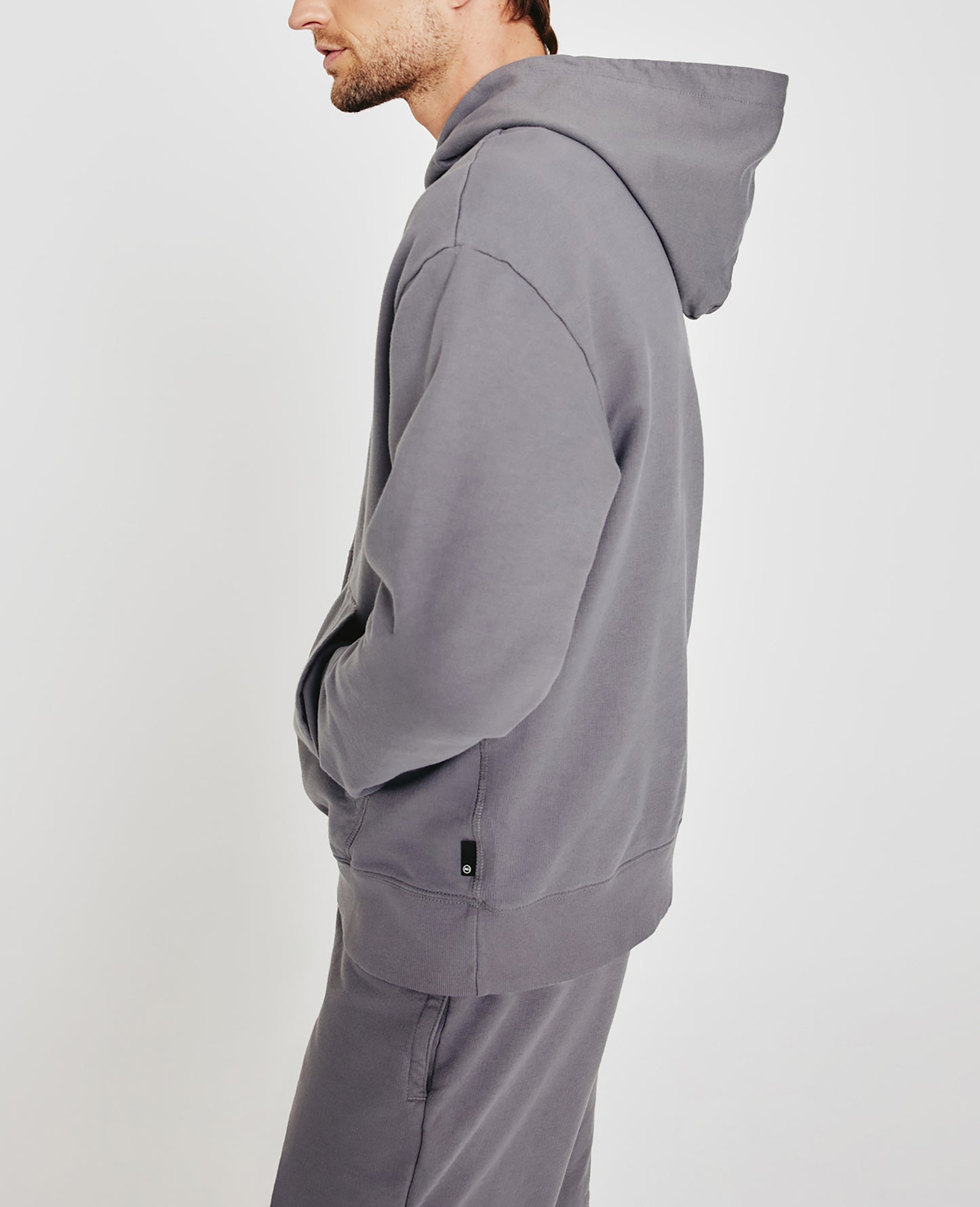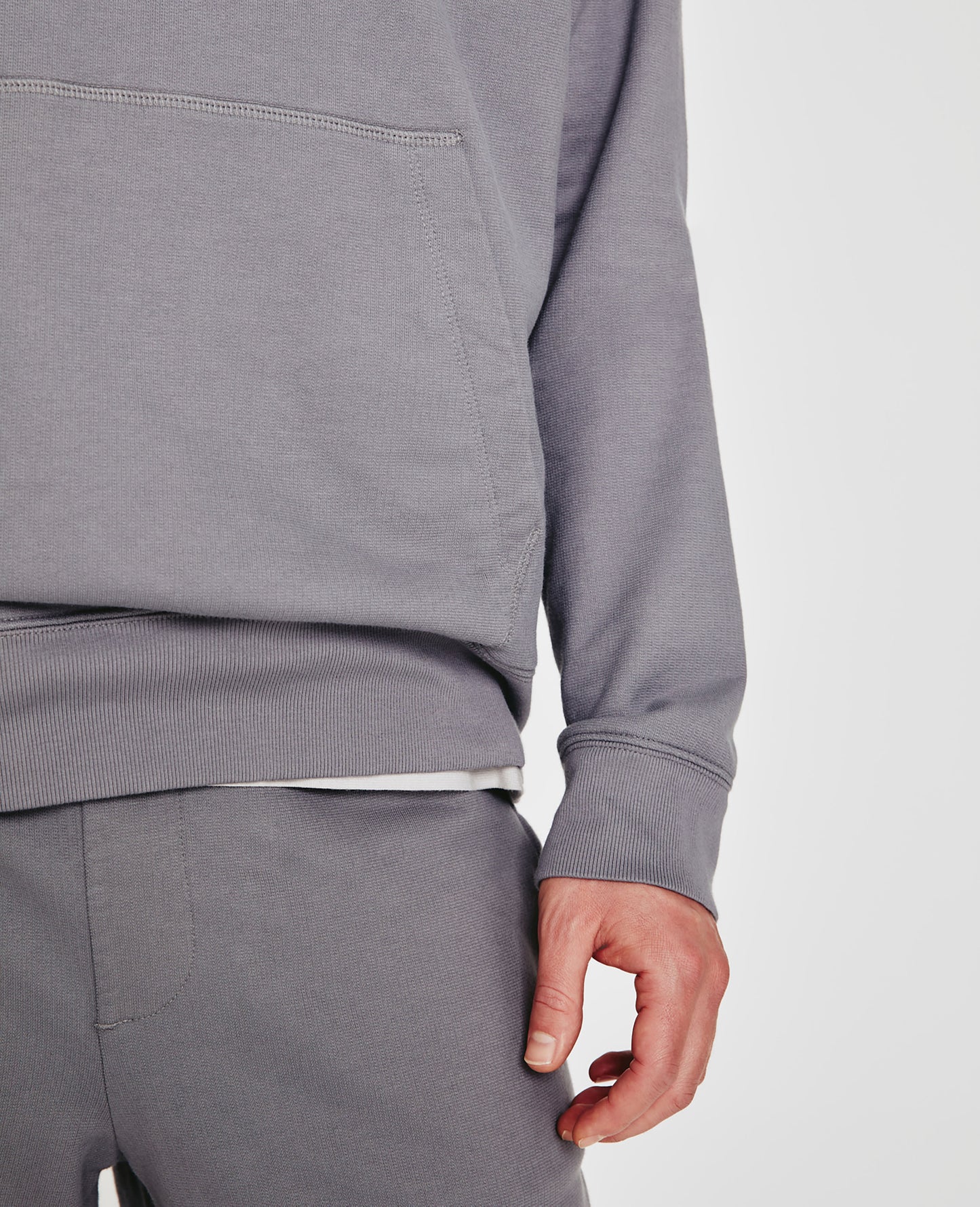 The new Arc Hoodie for men features a soft gray hue, designed with an easy, relaxed fit, front kangaroo pocket, vintage-inspired ribbed sleeve cuffs and waistband, and a comfortable hood. This men's hoodie is designed in an exclusive AG-made Essential Luxe Terry, featuring a lightweight feel, ultra-soft touch, and a color-rich finish. The Arc Hoodie is thoughtfully knitted with pima cotton to prevent torqueing, shrinking, and color loss.