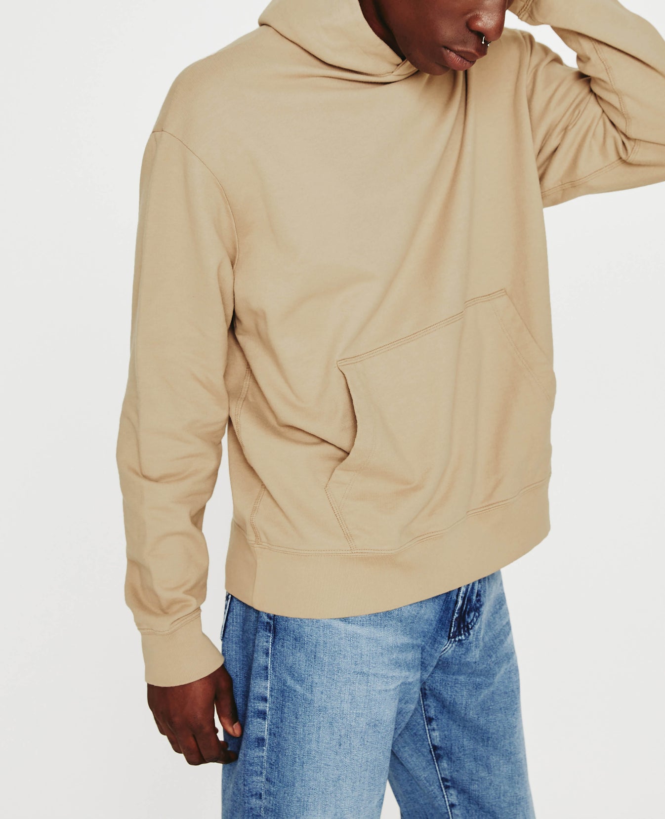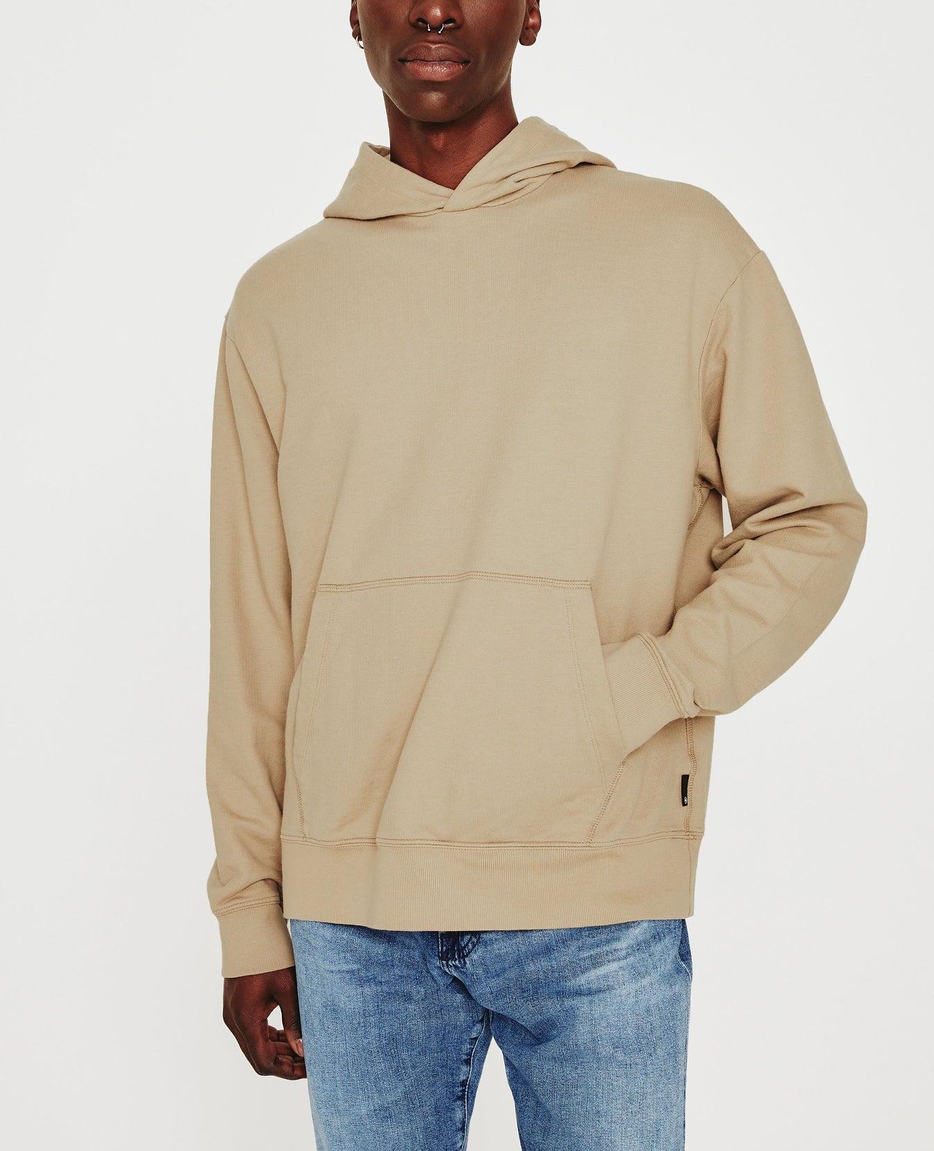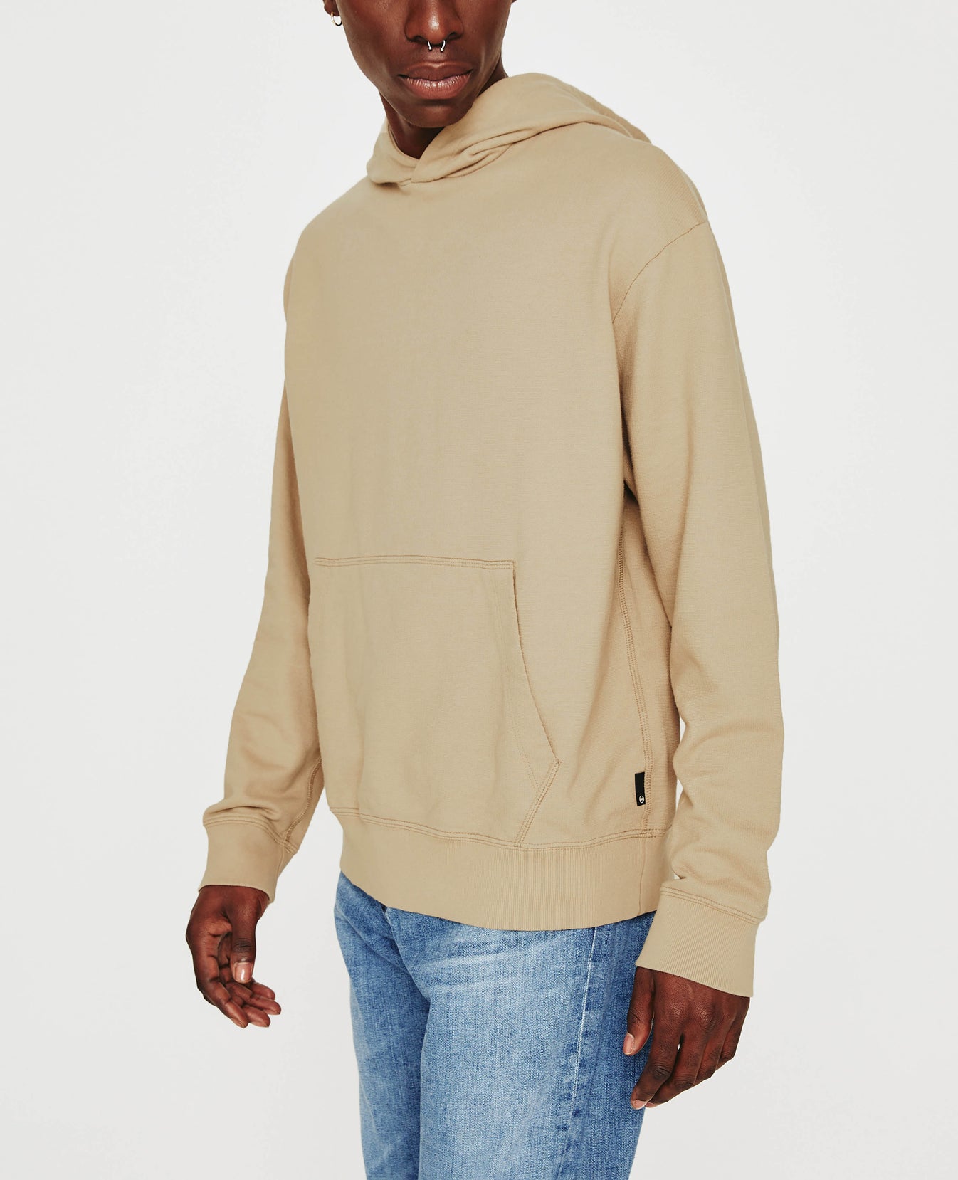 The Arc Hoodie for men is a relaxed-fit pullover sweatshirt with a roomy hood and a pouch pocket at the front. Offered here in a neutral beige color, the style features AG's exclusive Essential Luxe Terry for a lightweight feel, ultra-soft touch, and color-rich finish. It's knitted with pima cotton to prevent torquing, shrinking, and color loss. Ribbed trim adds a classic and comfortable touch.