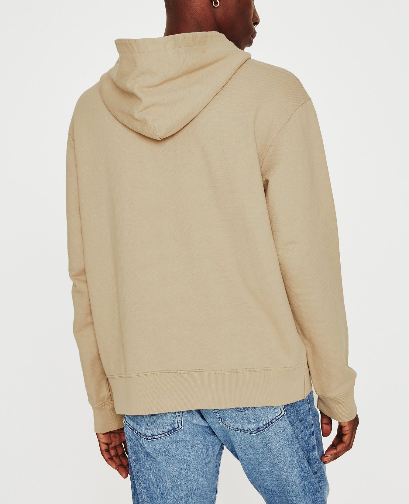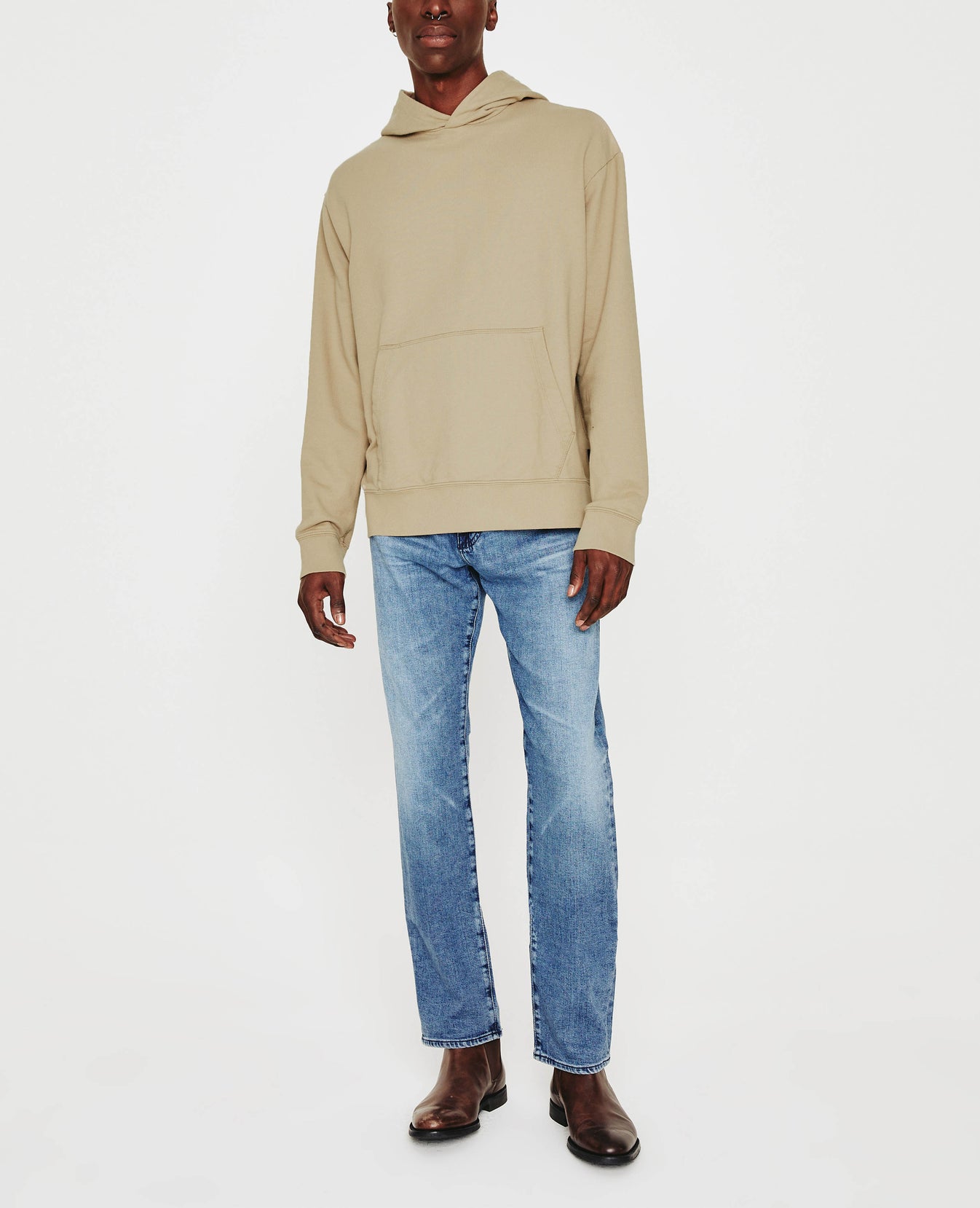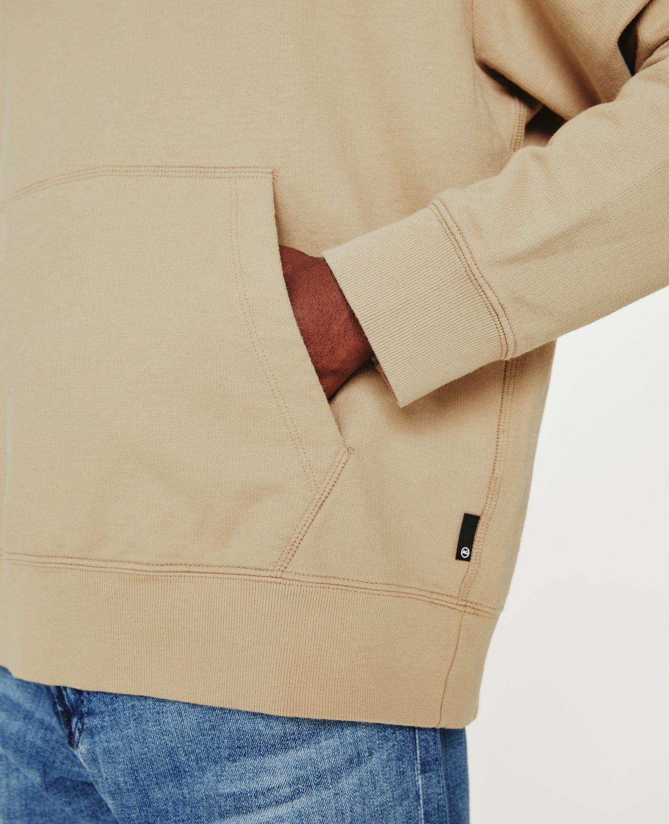 The Arc Hoodie for men is a relaxed-fit pullover sweatshirt with a roomy hood and a pouch pocket at the front. Offered here in a neutral beige color, the style features AG's exclusive Essential Luxe Terry for a lightweight feel, ultra-soft touch, and color-rich finish. It's knitted with pima cotton to prevent torquing, shrinking, and color loss. Ribbed trim adds a classic and comfortable touch.