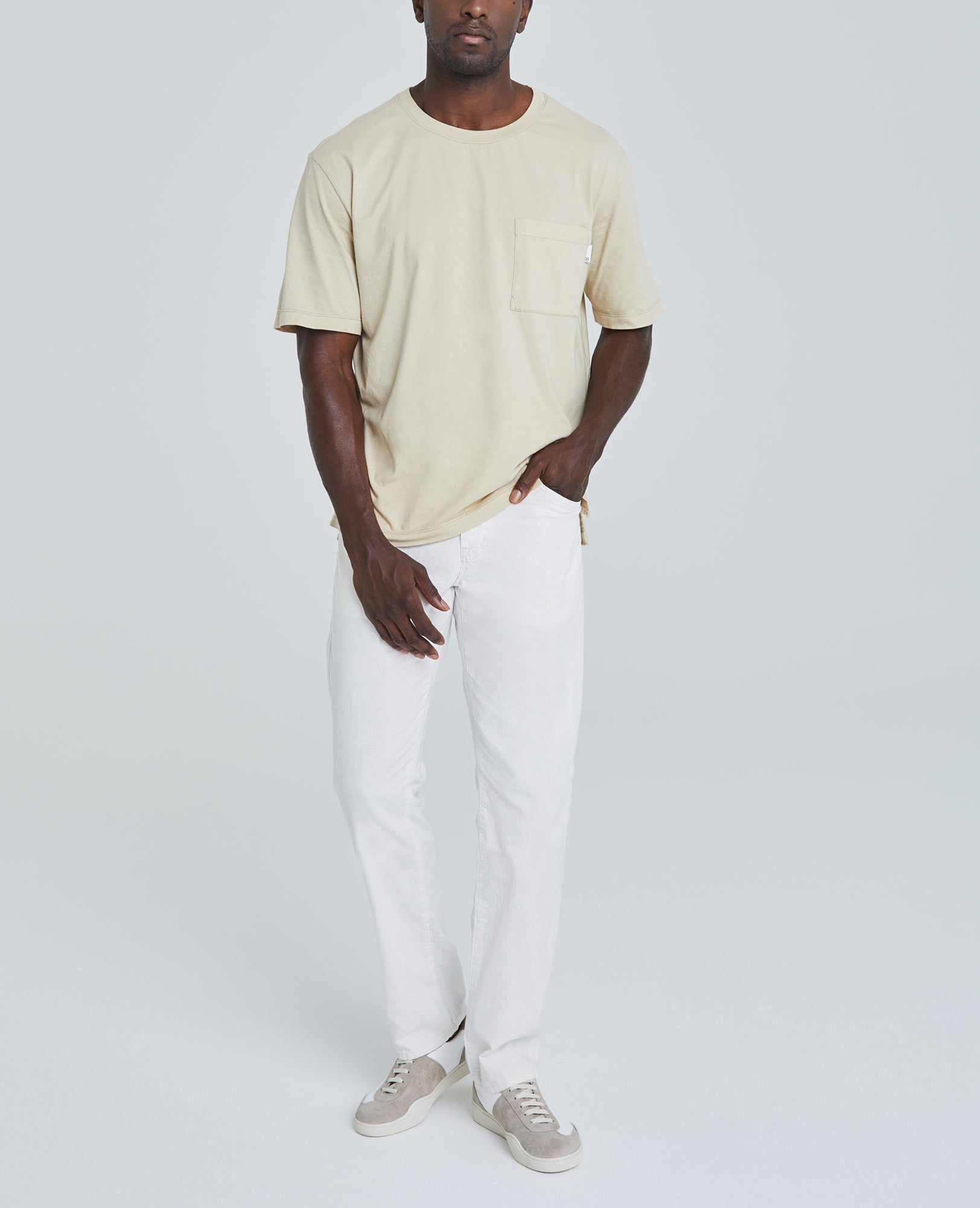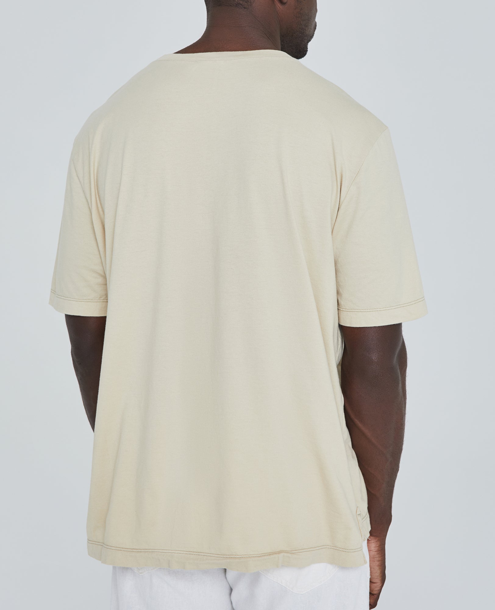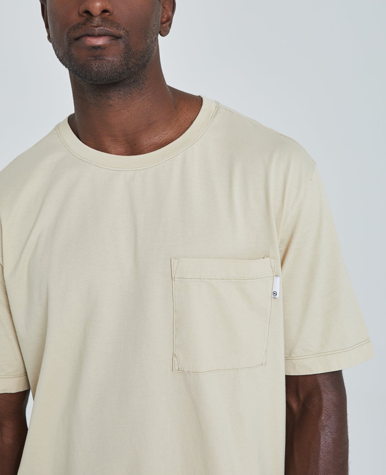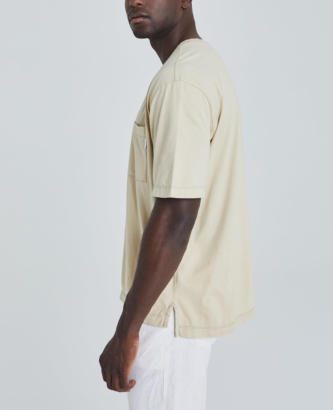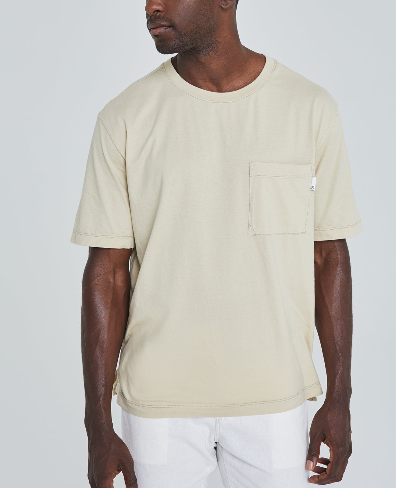 The Arc Pocket Tee for men features a sandy ivory hue, wide crew neck line with raw edge details, and exposed seamwork at the sleeves. This men’s t-shirt is designed in a lightweight, luxury jersey fabric made with pima cotton exclusively spun for extra color last, a well-worn vintage feel, and easy, relaxed fit.