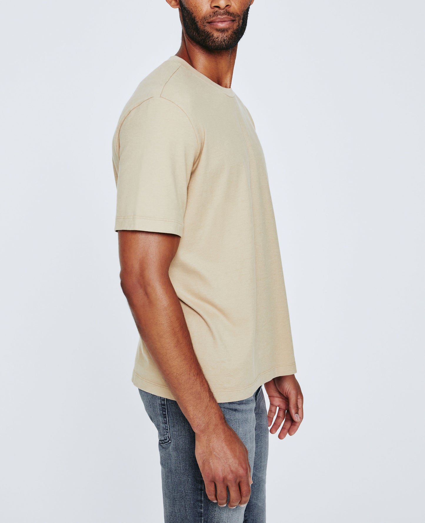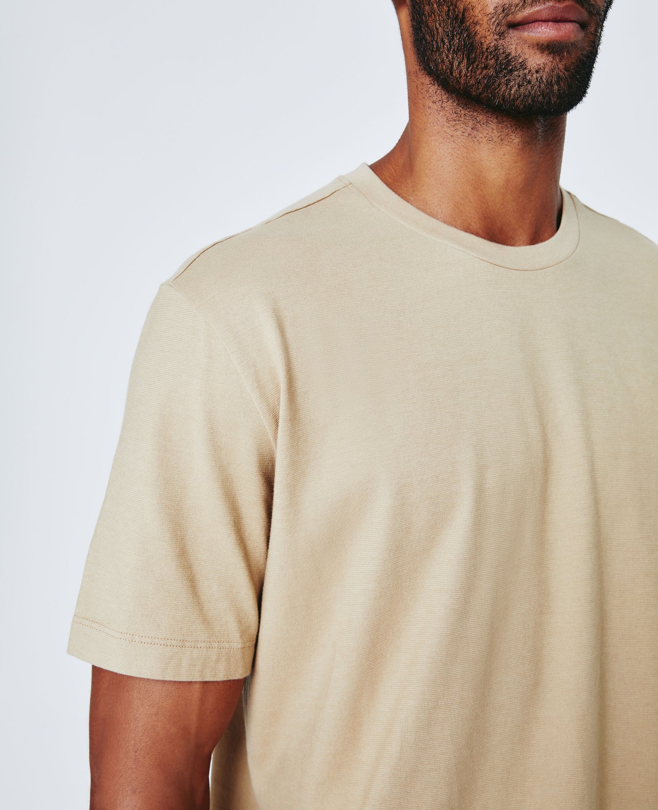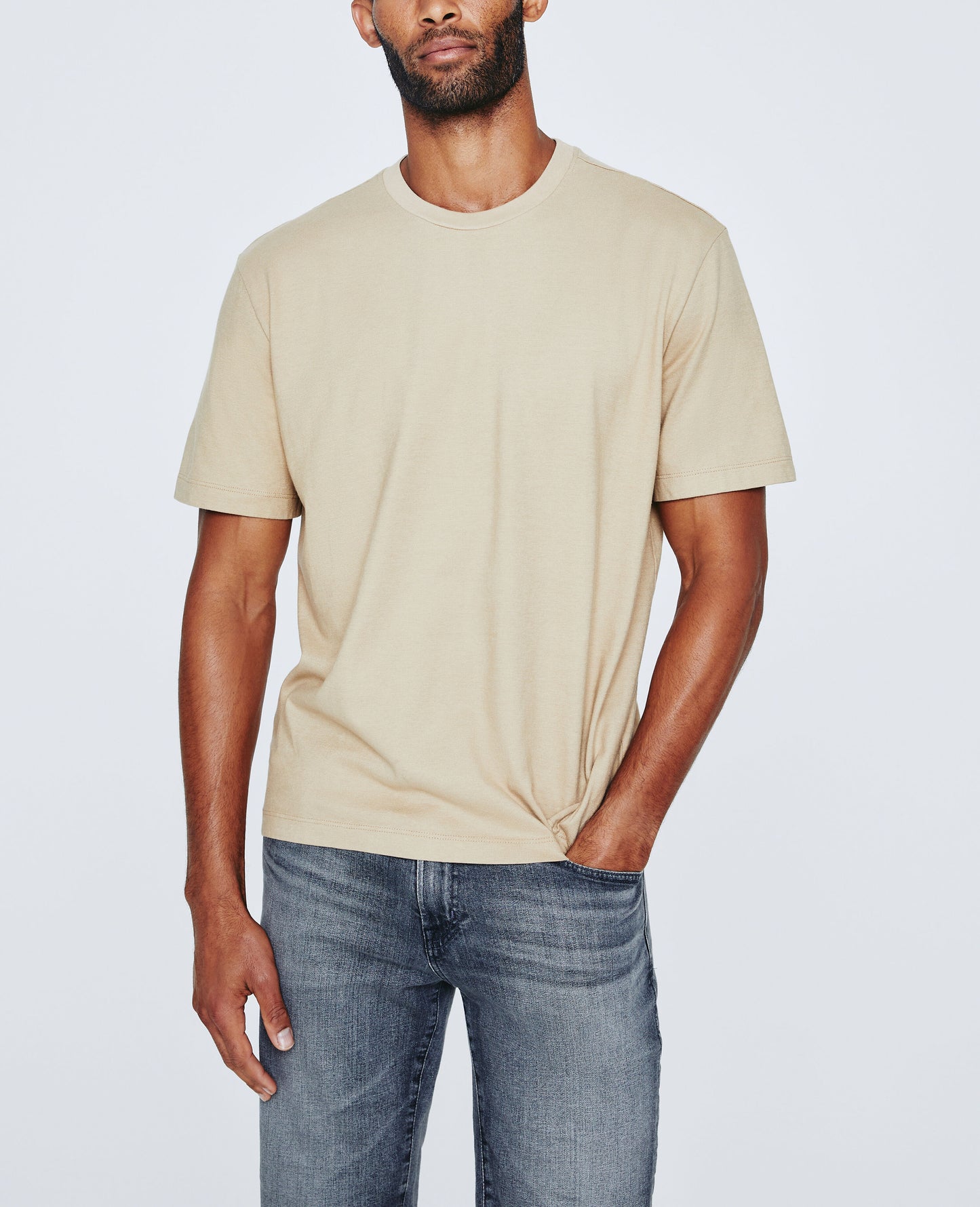 Arc Tee for men boasts a beige hue in an ultra-soft, lightweight jersey fabric. Blending style with practicality, The Arc Tee is astutely knitted to prevent torquing and presents an oversized, relaxed fit--an alternative to our traditional crews. Our jersey fabrication is knitted with both S-twist and Z-twist yarns, producing a garment that wears longevity well.