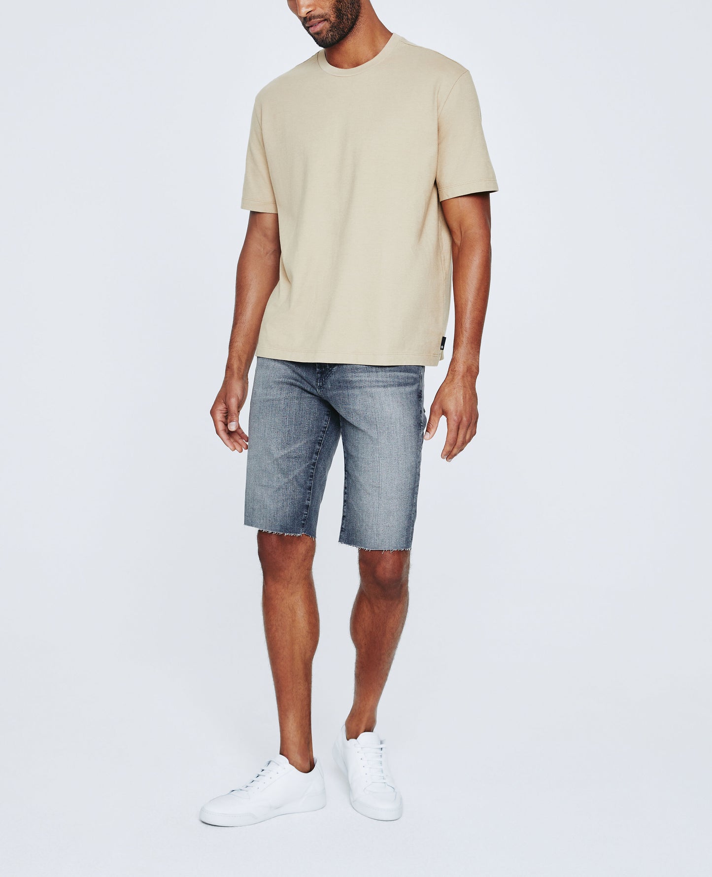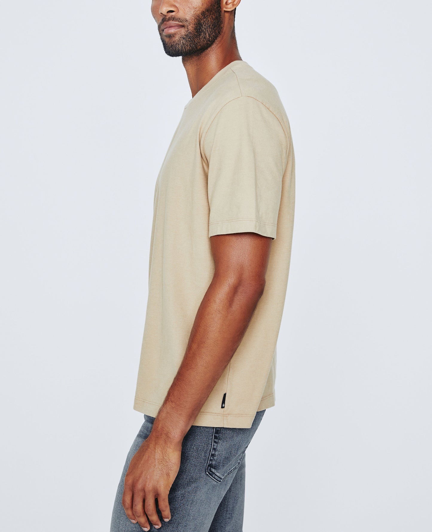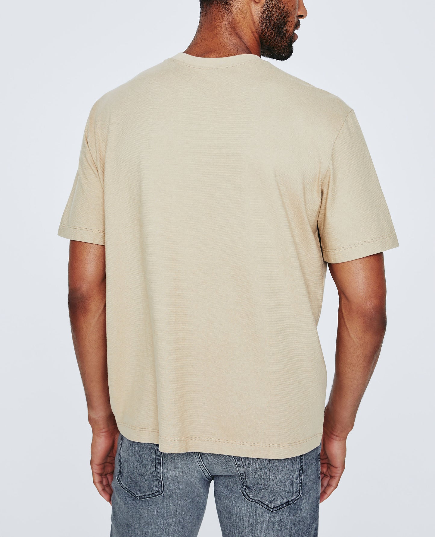 Arc Tee for men boasts a beige hue in an ultra-soft, lightweight jersey fabric. Blending style with practicality, The Arc Tee is astutely knitted to prevent torquing and presents an oversized, relaxed fit--an alternative to our traditional crews. Our jersey fabrication is knitted with both S-twist and Z-twist yarns, producing a garment that wears longevity well.