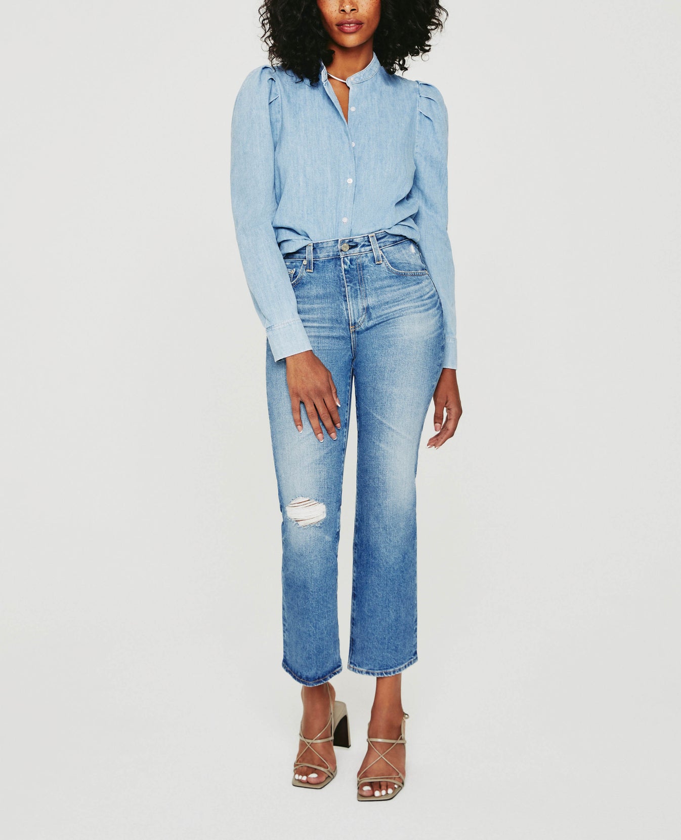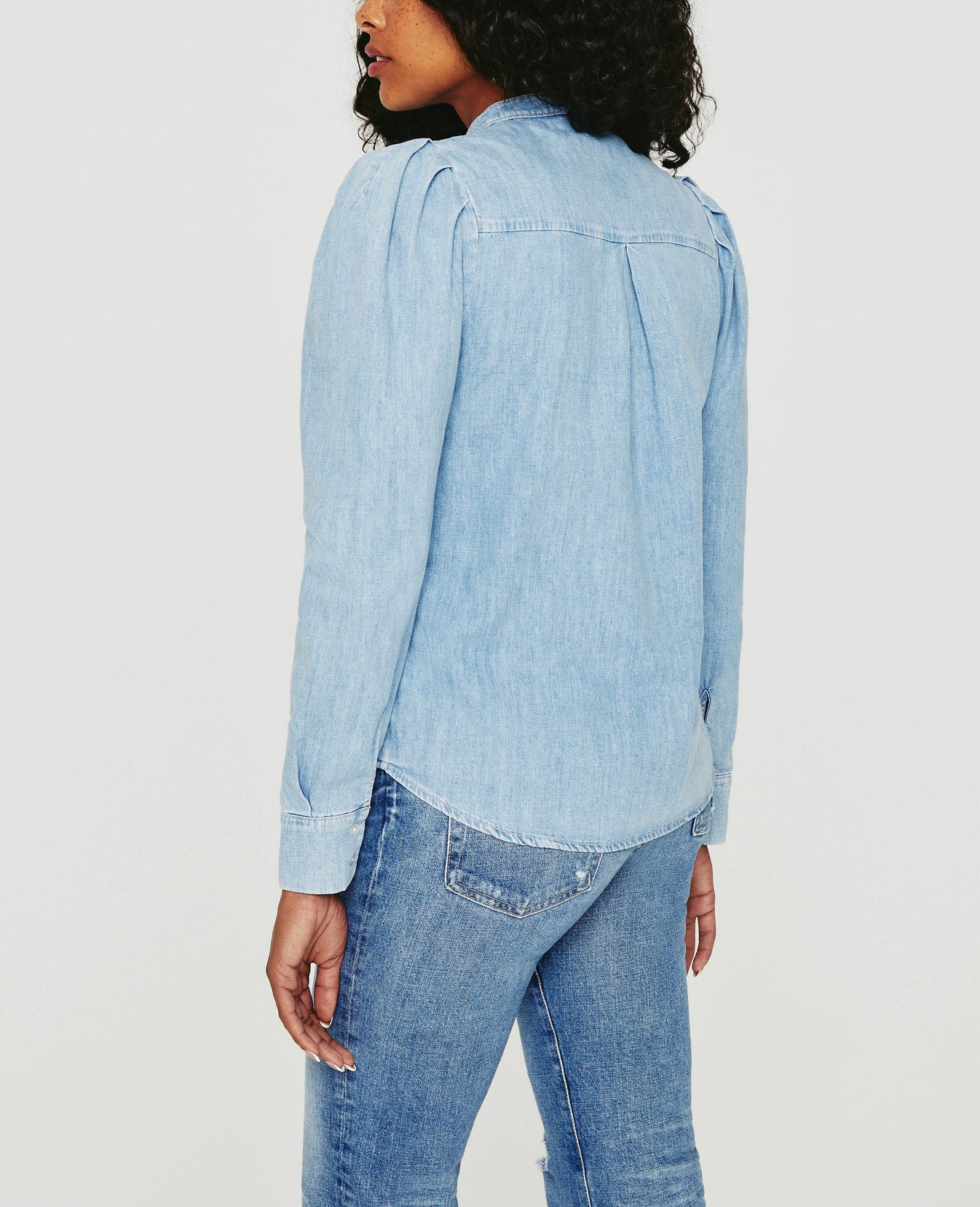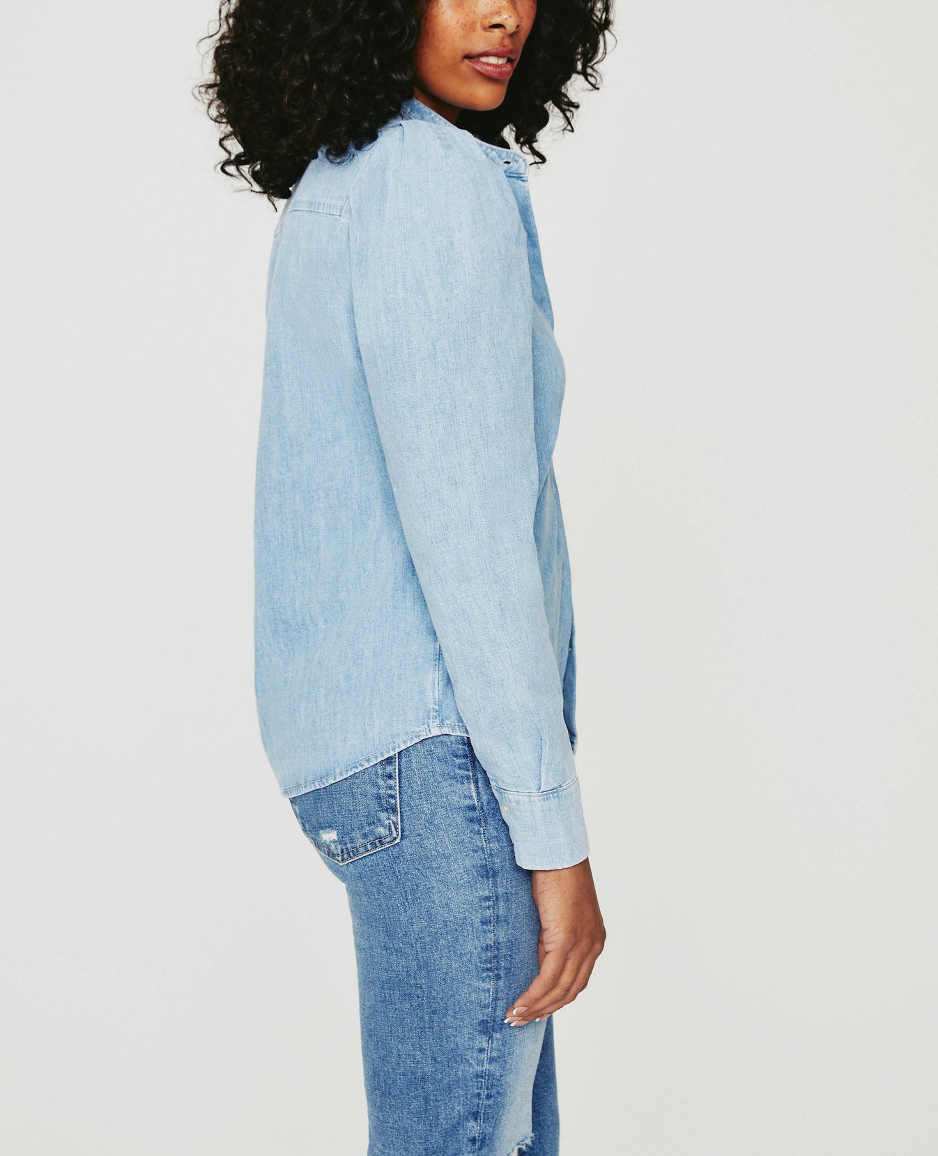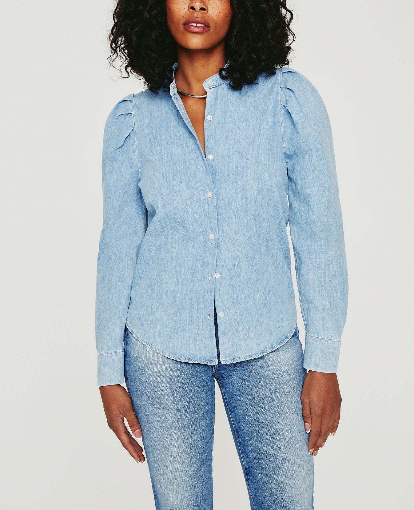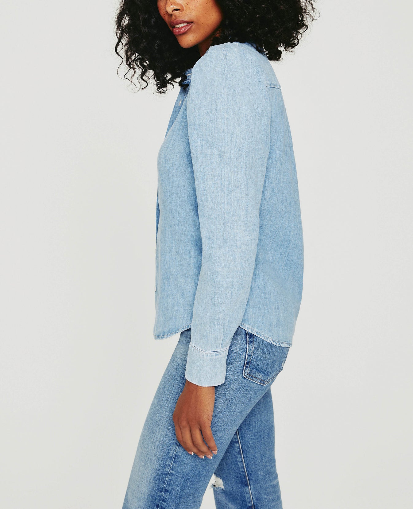 The Avery Shirt for women in a medium wash. Designed with our Teak Denim, chambray fabrication, this women's top is easy to wear, quick to style, and features a button-up placket without the hassle of a collar. The silhouette is reminiscent of our Walker tee—complete with understated puffed sleeves nostalgic of Victorian sophistication.