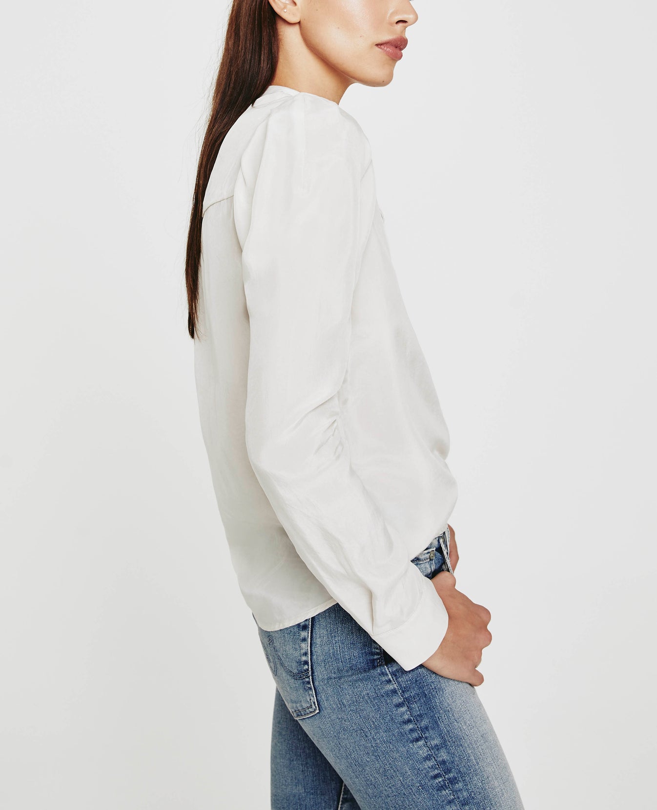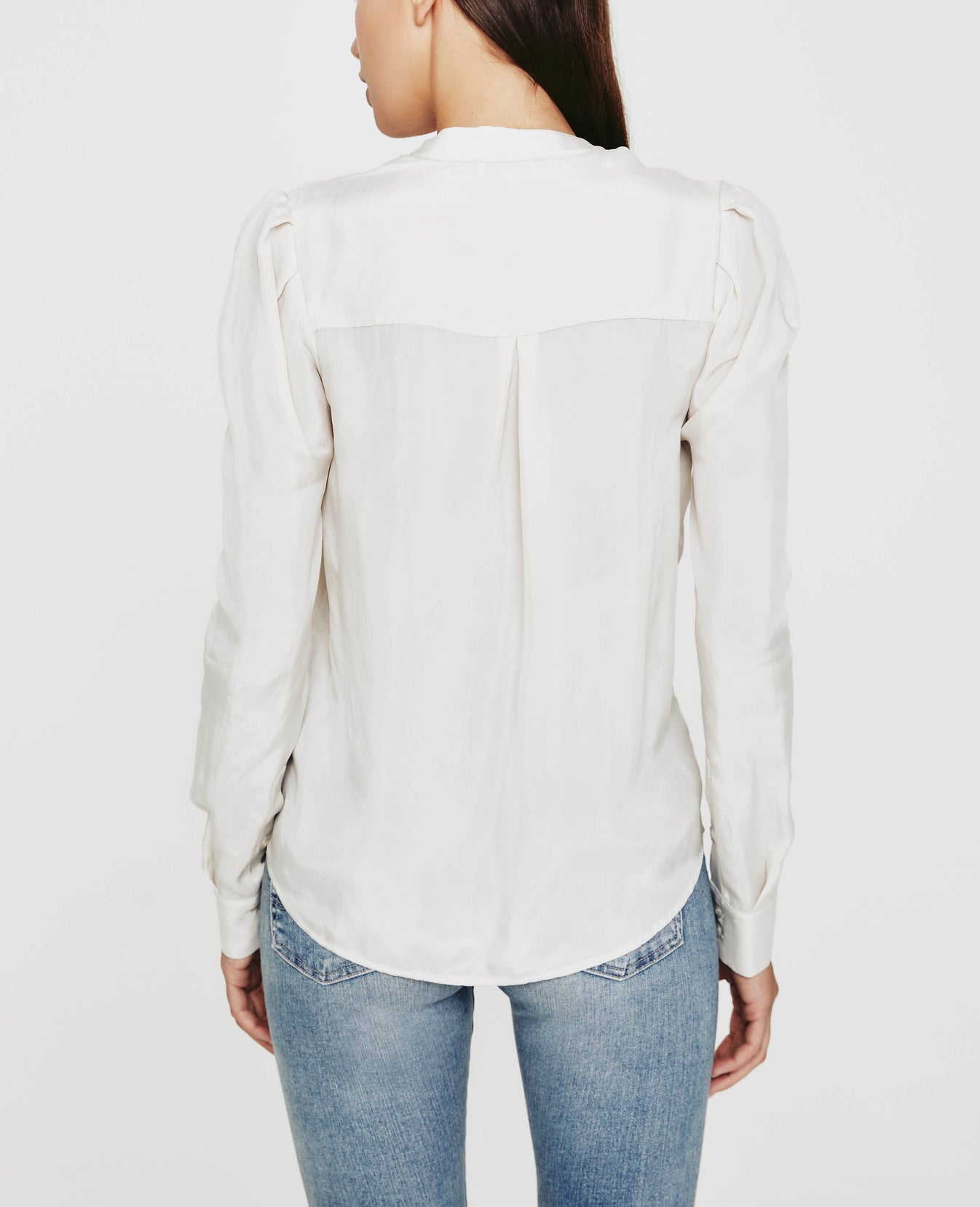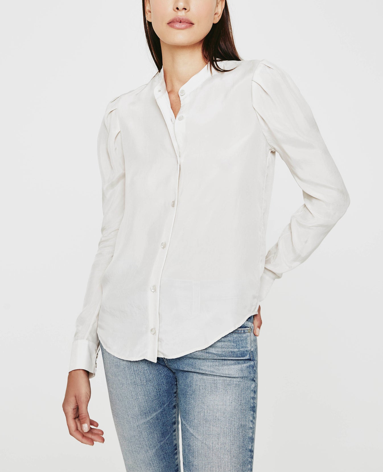 The Avery Shirt for women in an ivory hue, designed with an airy Cupro fabrication that features a button-up placket without the hassle of a collar. The silhouette is reminiscent of our Walker tee—complete with understated puffed sleeves nostalgic of Victorian sophistication.