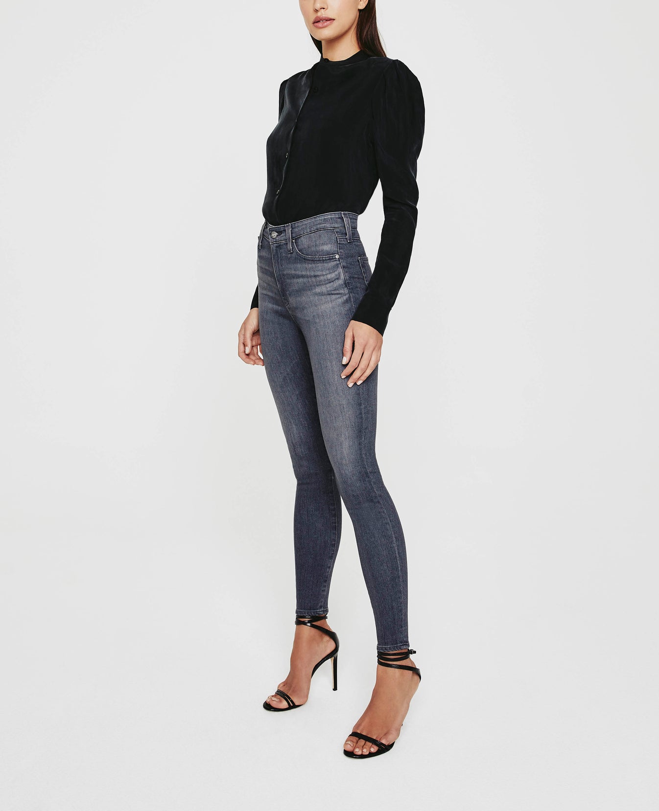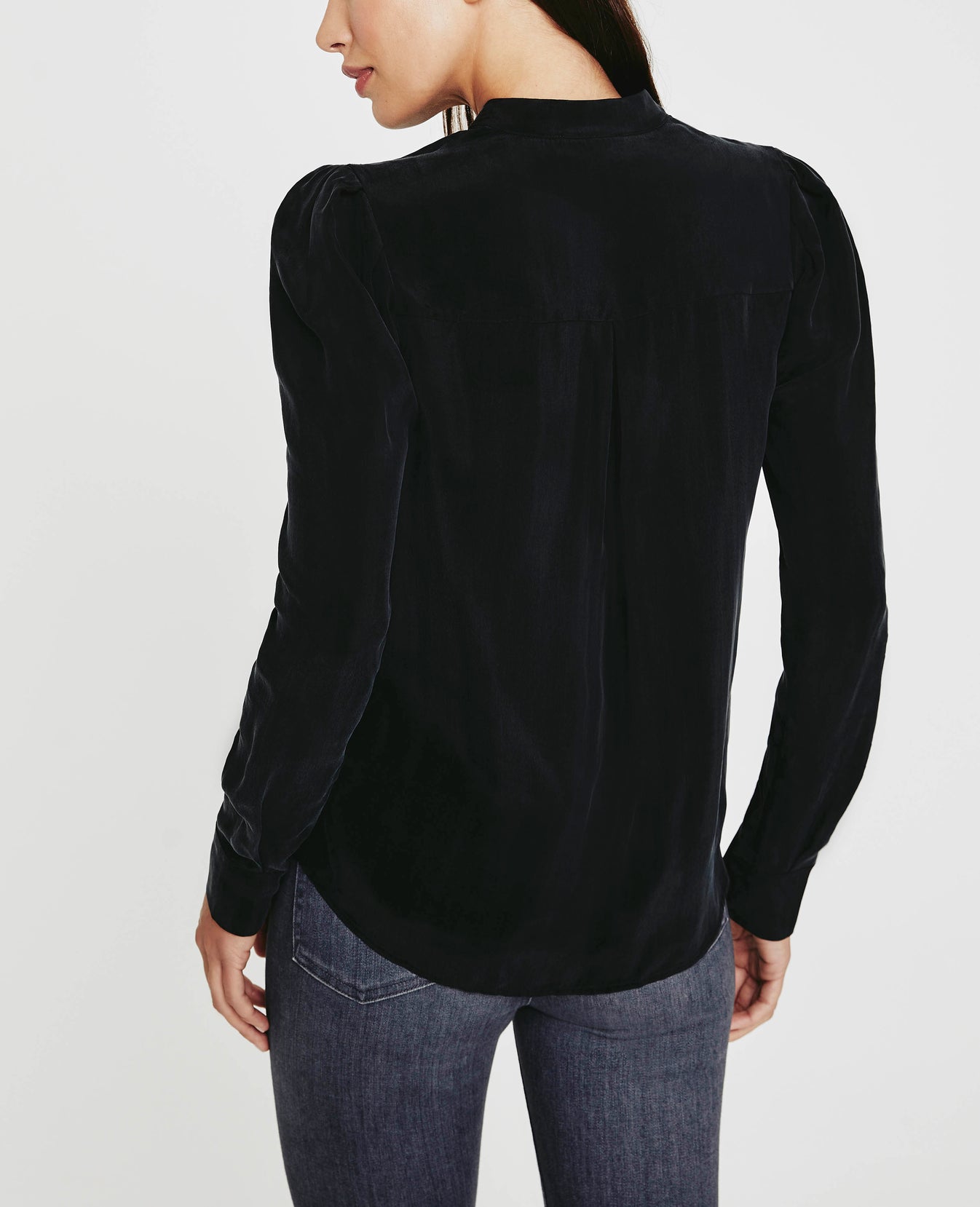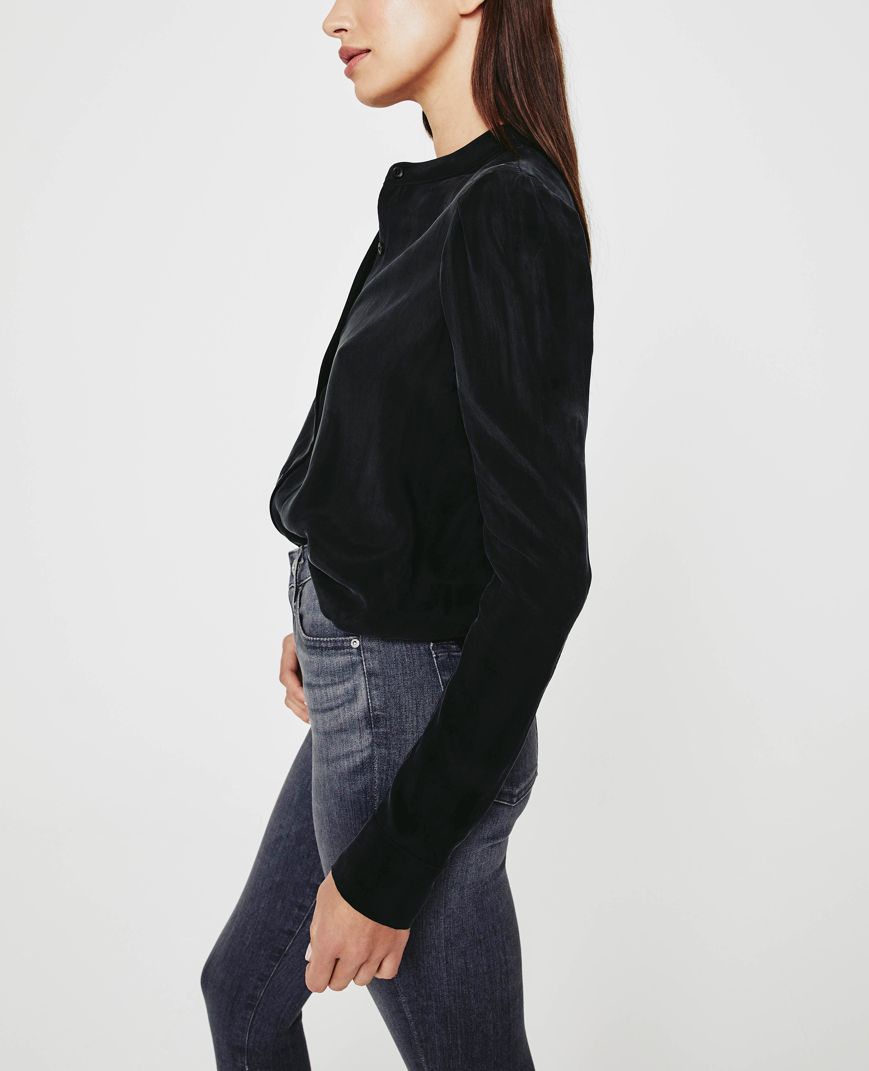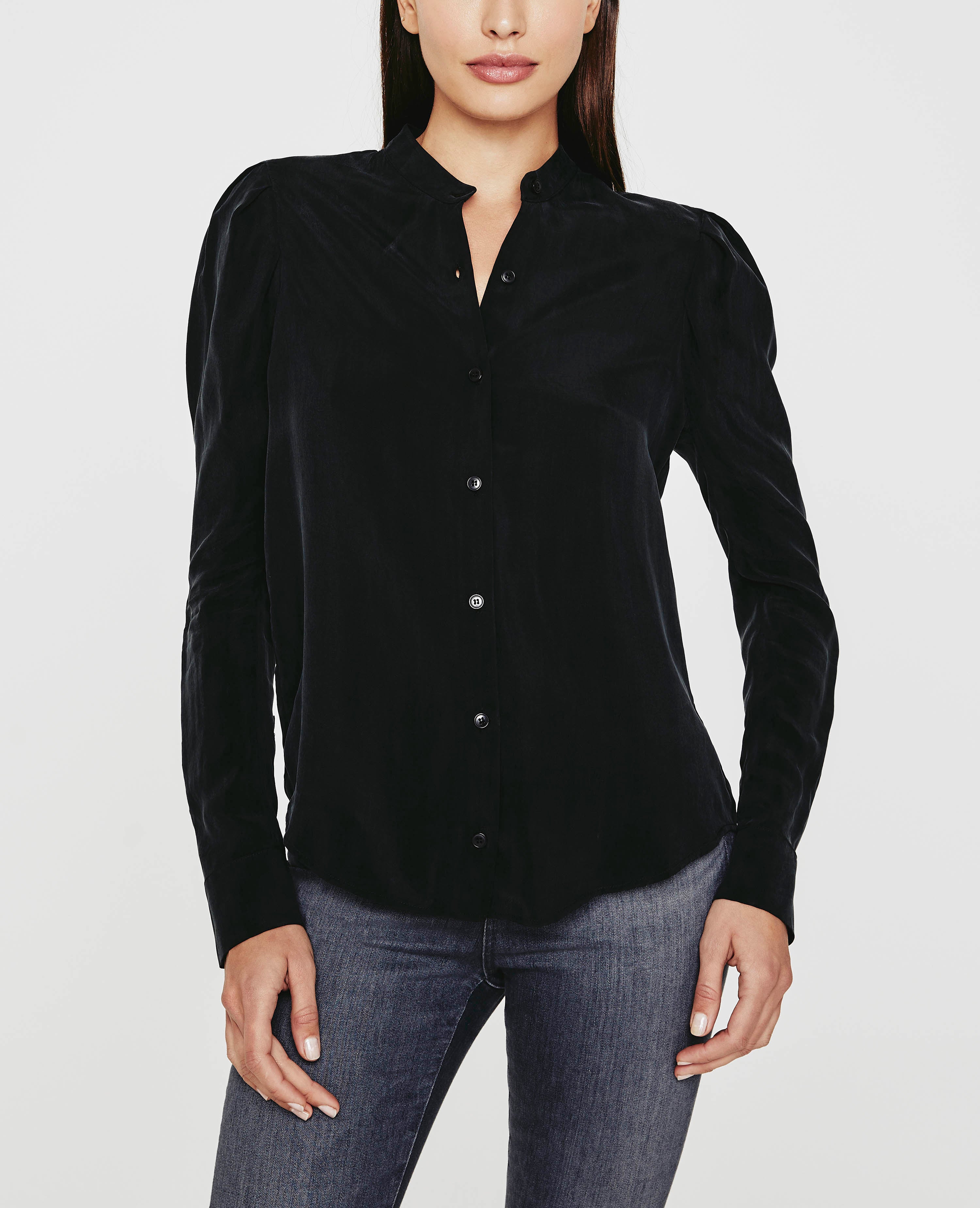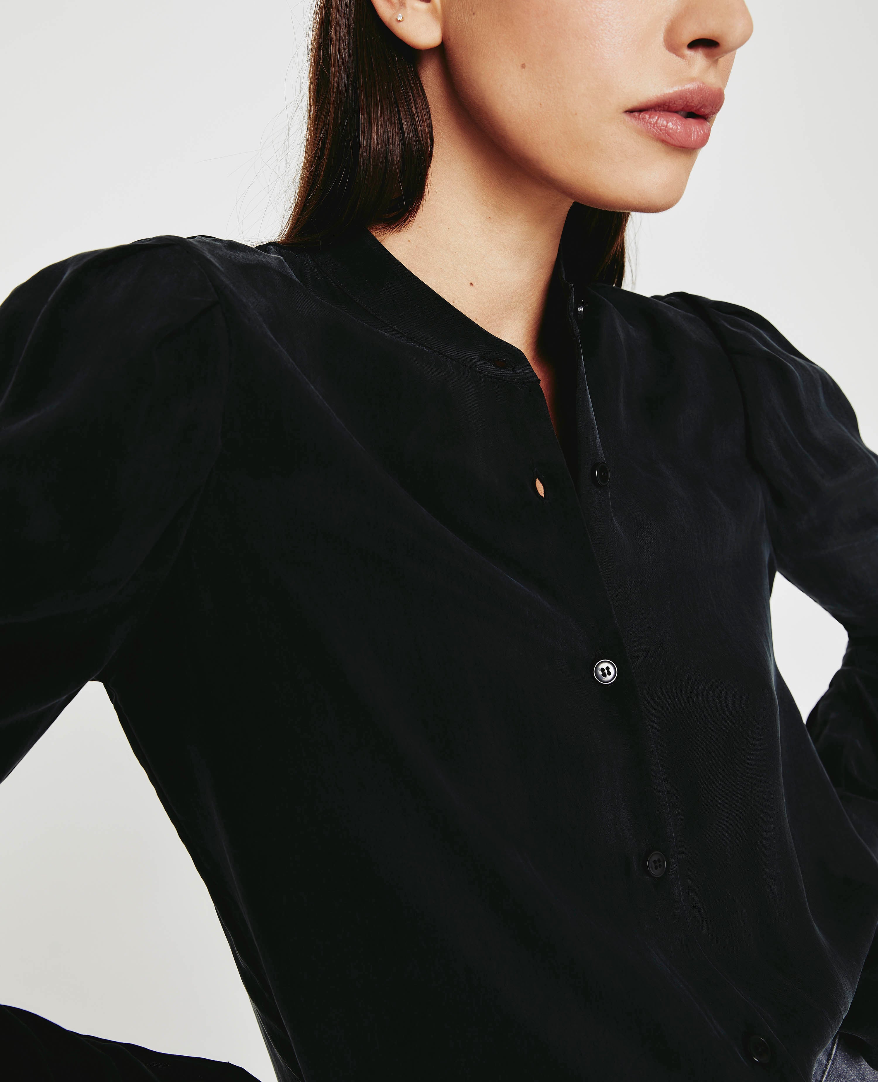 The Avery Shirt for women in a black hue, designed with an airy Cupro fabrication that features a button-up placket without the hassle of a collar. The silhouette is reminiscent of our Walker tee—complete with understated puffed sleeves nostalgic of Victorian sophistication.