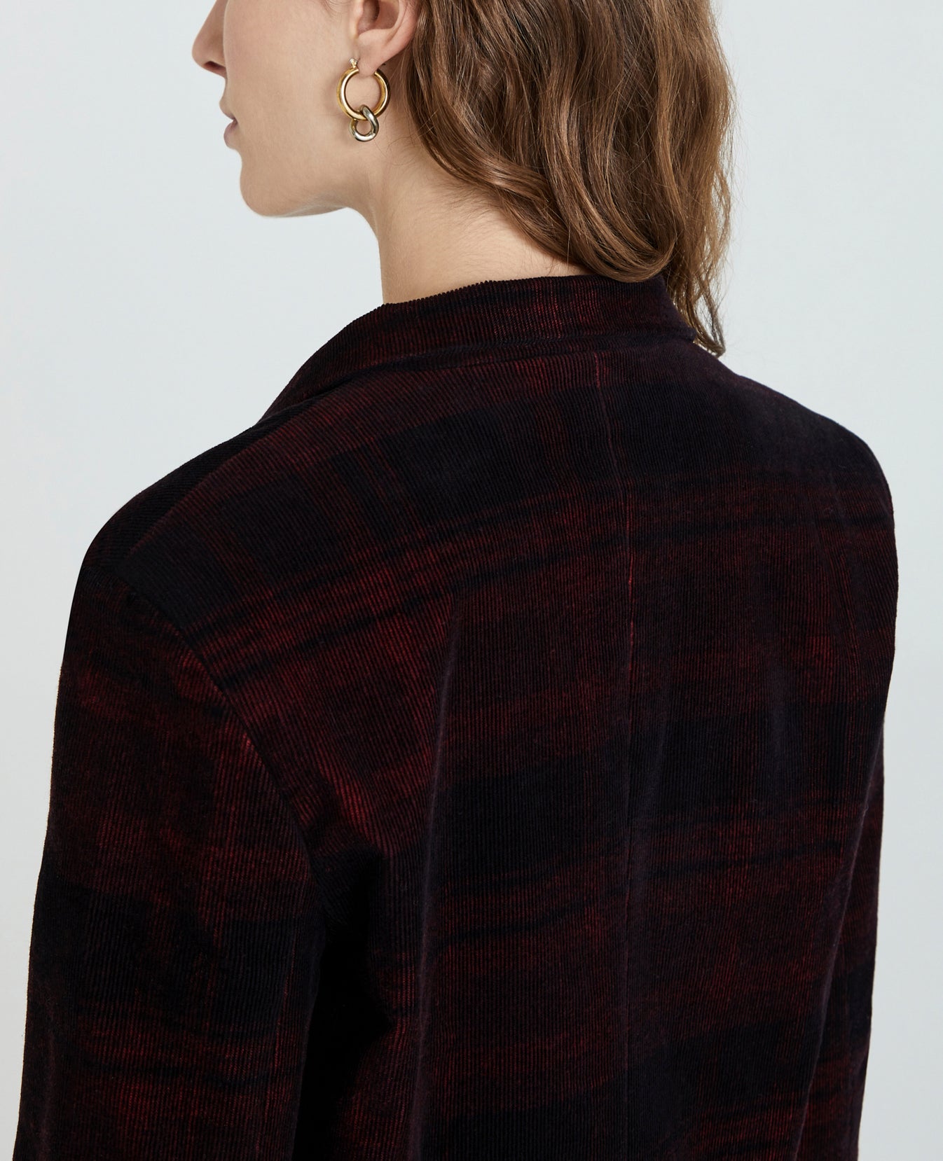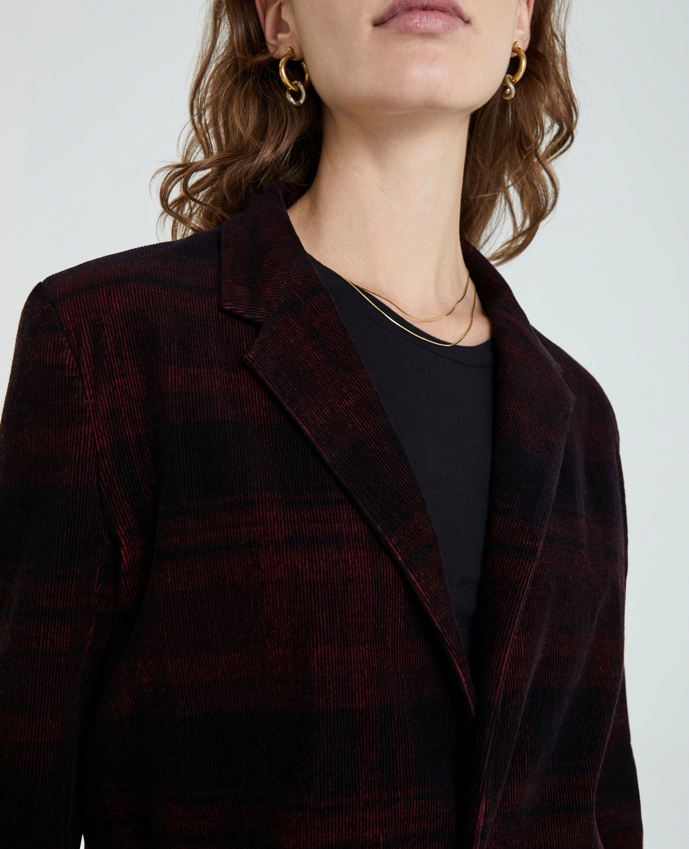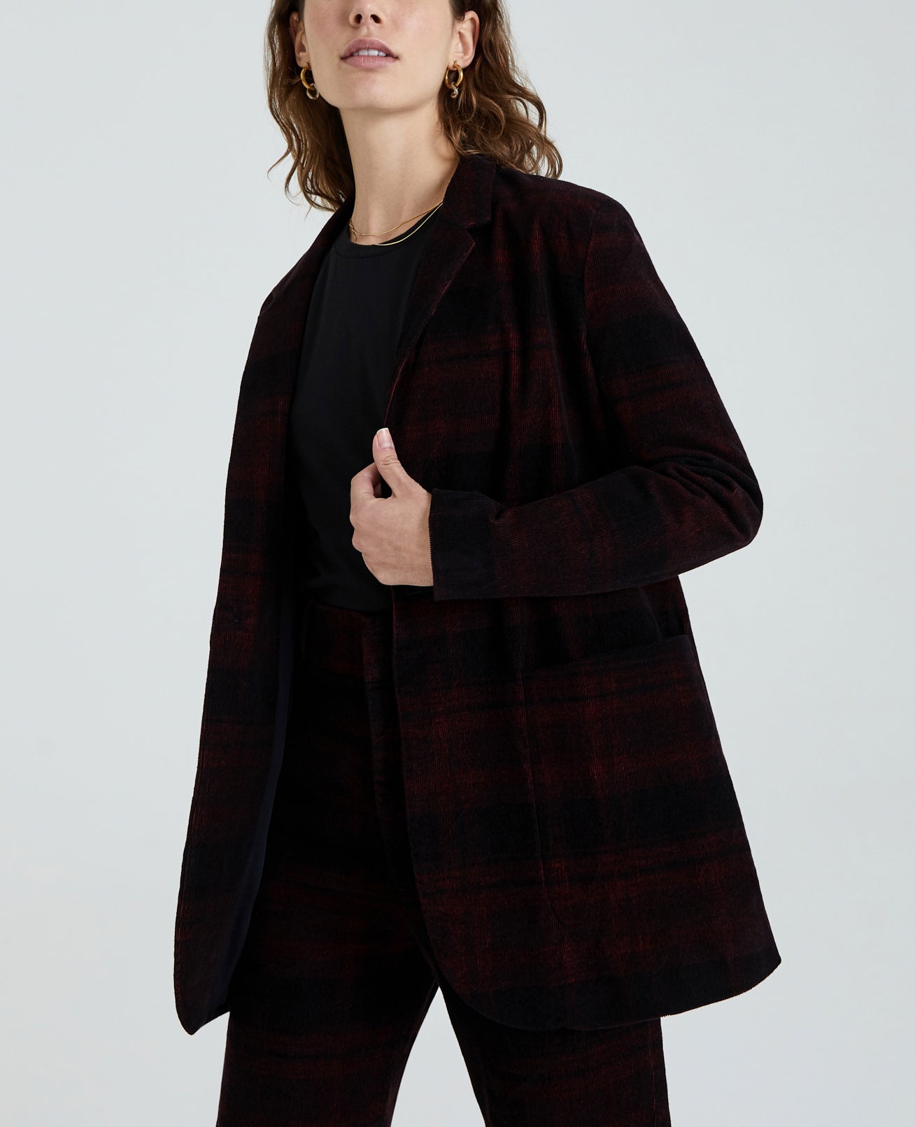 Baylee Blazer for women is a corduroy jacket featuring a vintage-inspired checked pattern in burgundy, structured boyfriend silhouette, single button closure, and oversized pockets. This women's jacket is designed in a classic corduroy with luxuriously soft pile for added warmth.