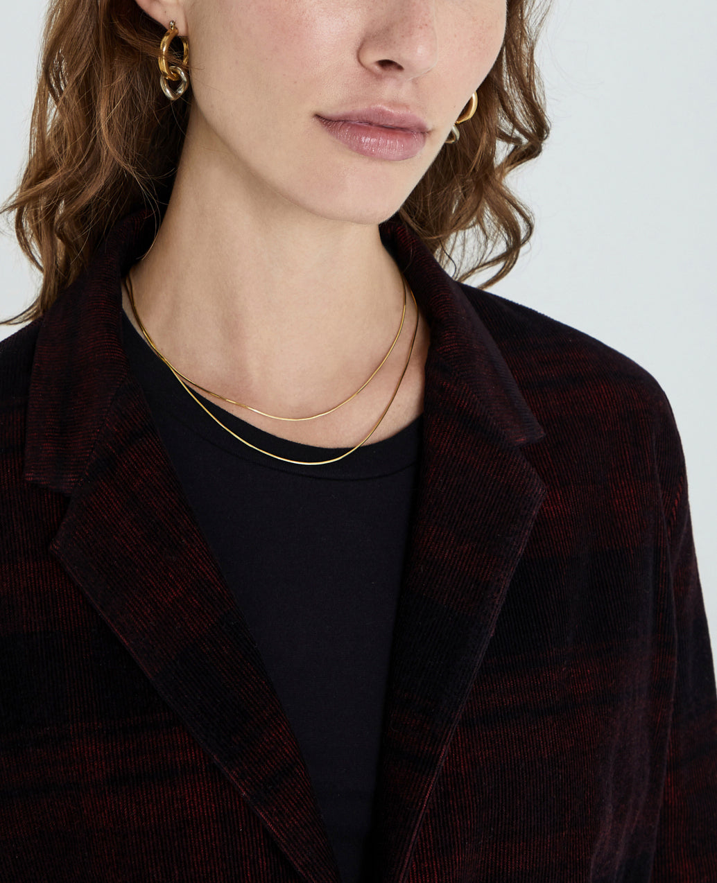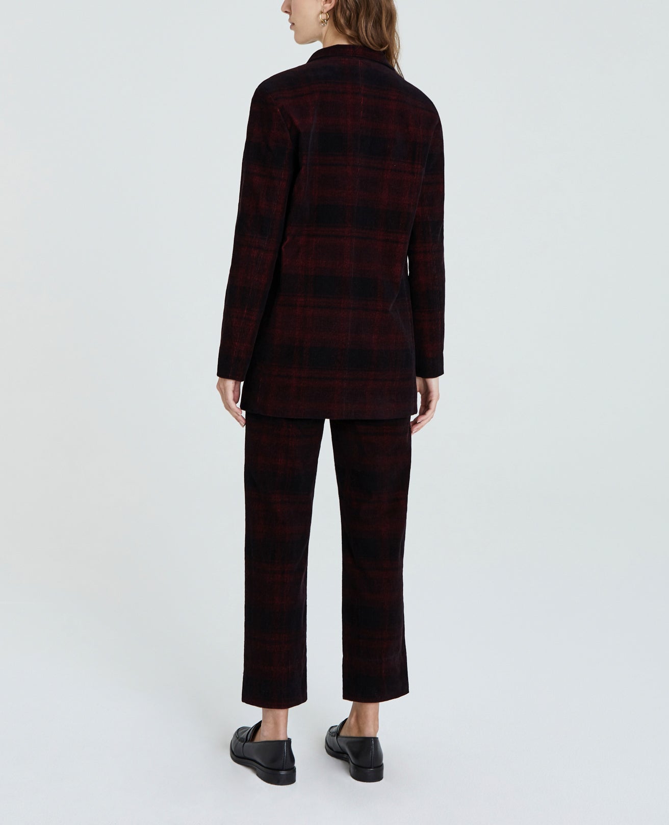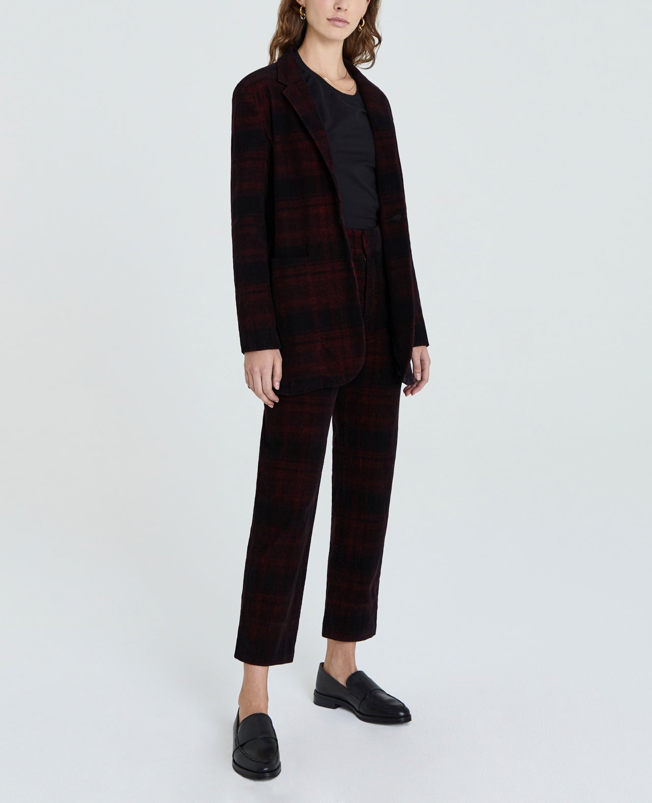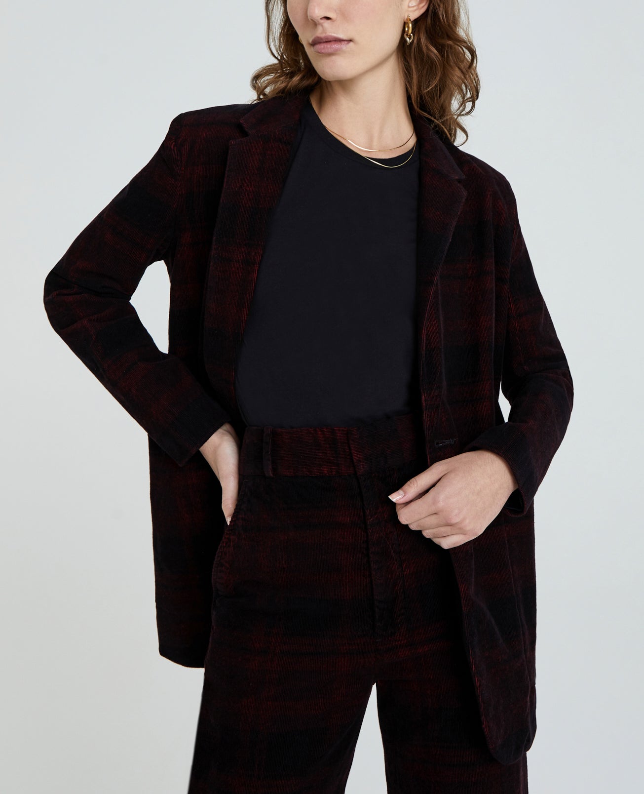 Baylee Blazer for women is a corduroy jacket featuring a vintage-inspired checked pattern in burgundy, structured boyfriend silhouette, single button closure, and oversized pockets. This women's jacket is designed in a classic corduroy with luxuriously soft pile for added warmth.