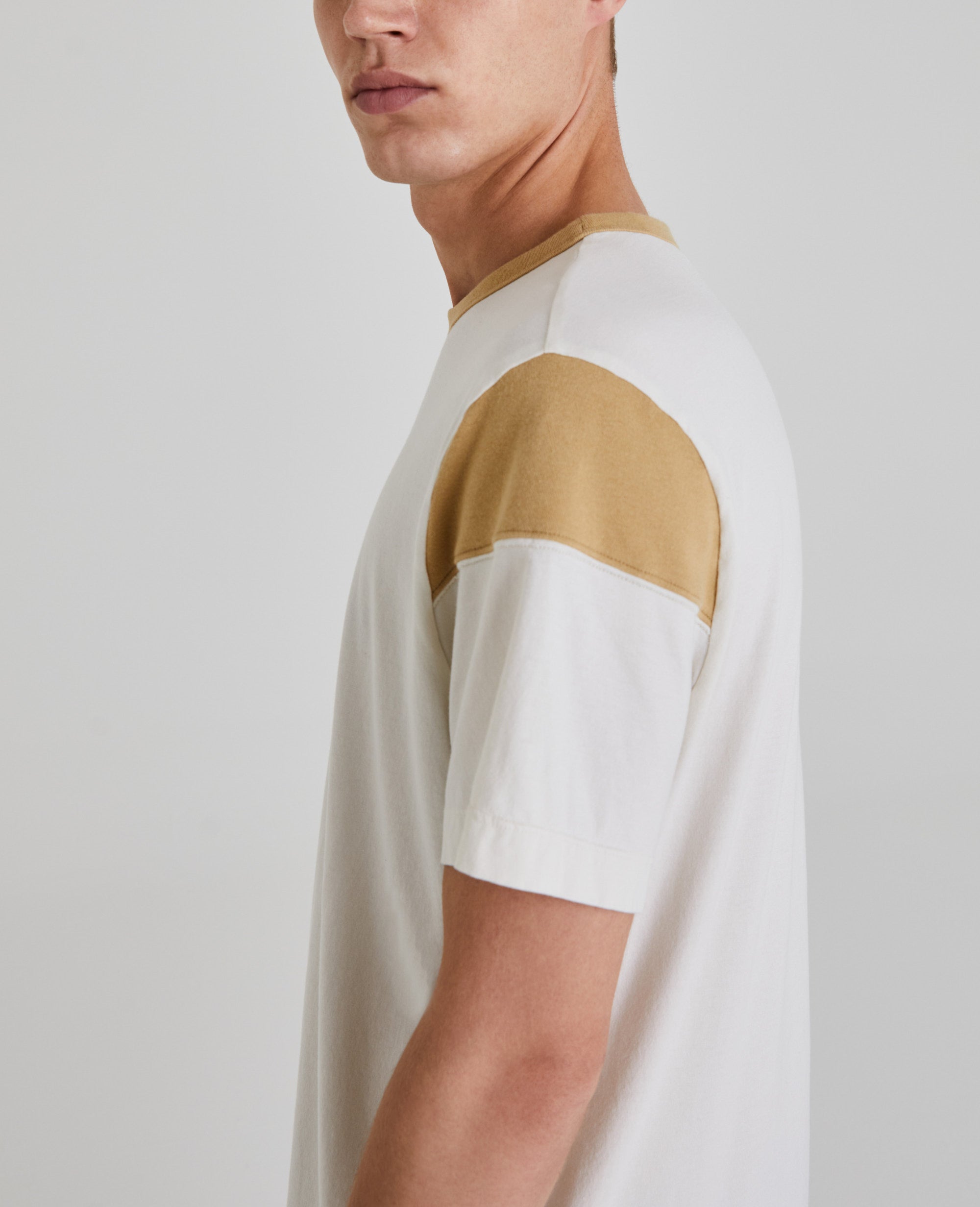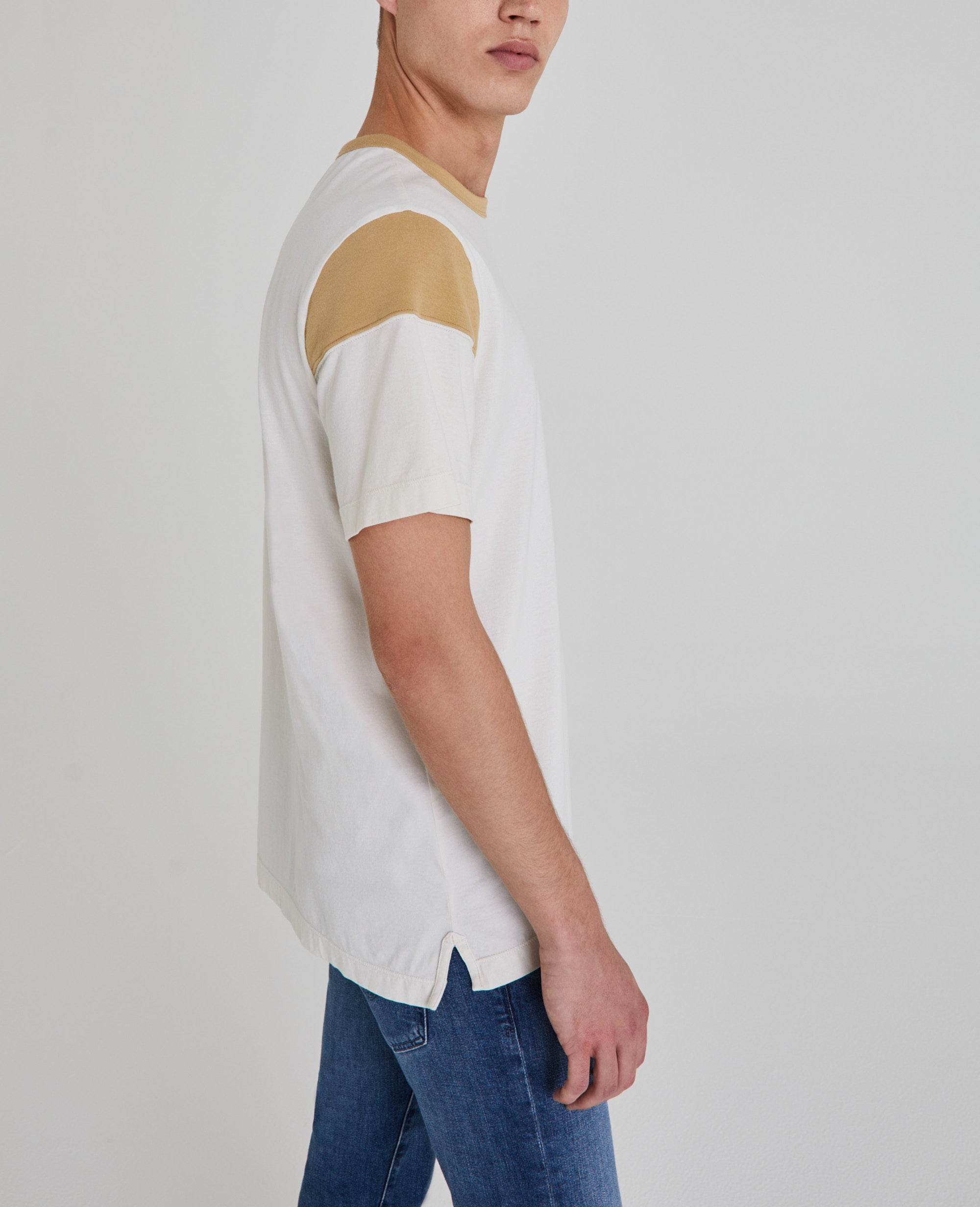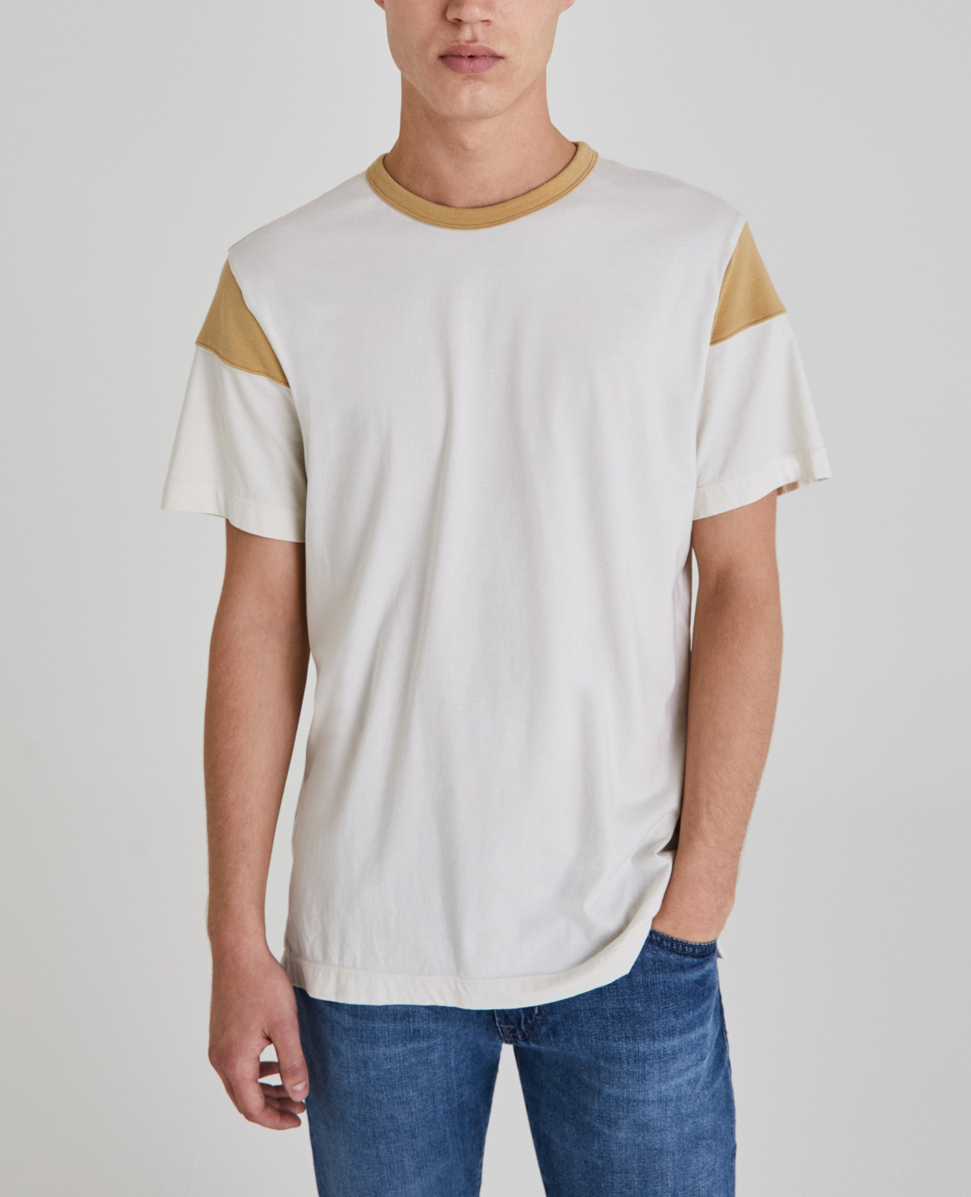 The Beckham Color Block Crew Tee for men features an muted off-white hue detailed with sandy beige contrasting at the shoulders and collar. The Beckham Color Block T-Shirt offers a boxier silhouette and drop shoulders for a contemporary fit. High-low split seam with self binding creates an unexpected but subtle dimension for an everyday basic. This men's t-shirt is designed in a lightweight fabric made from 100% cotton fibers that are thoughtfully knitted to prevent torqueing. This AG exclusive fabric offers a durable 20/1 knit that withstands everyday wear through the seasons.