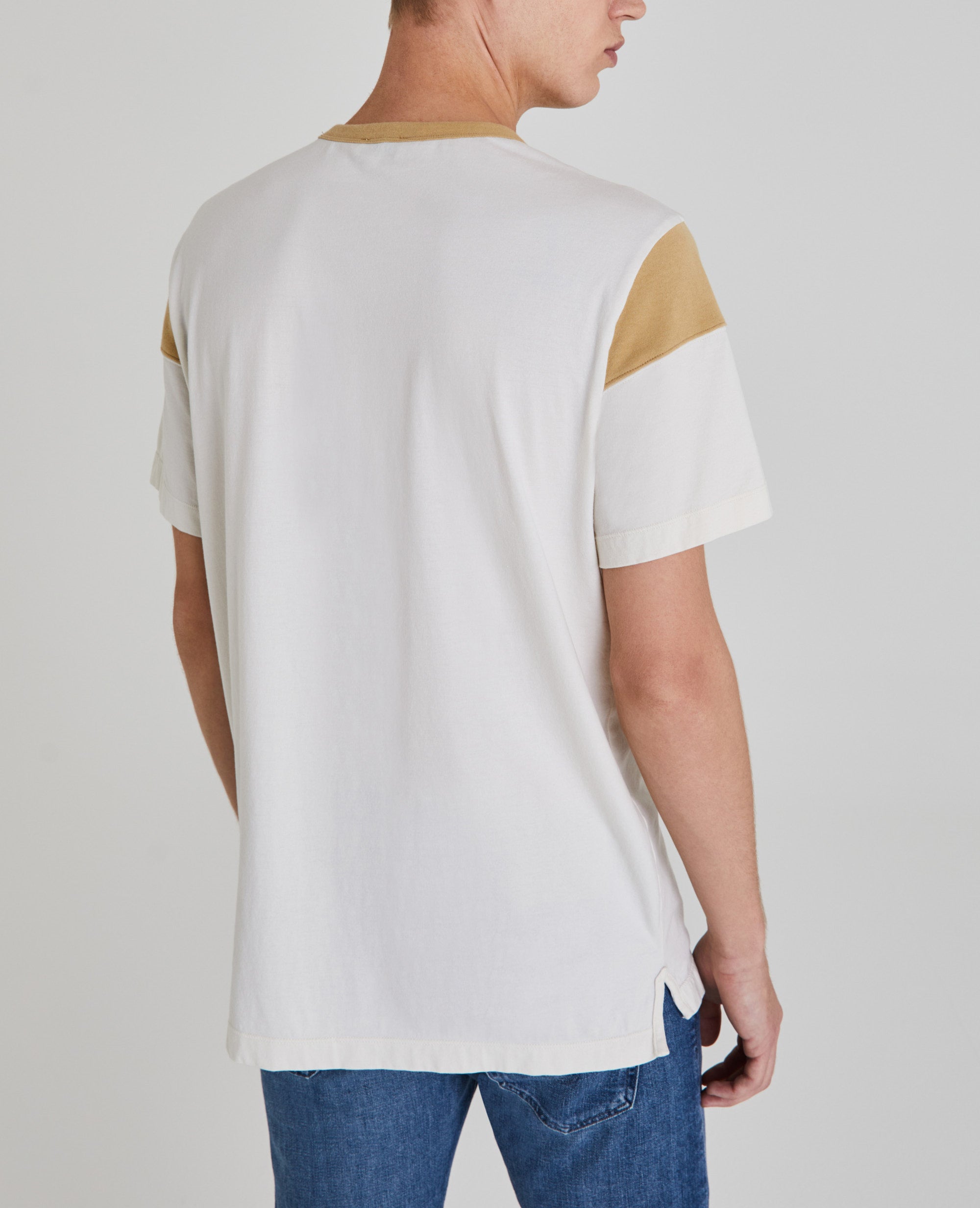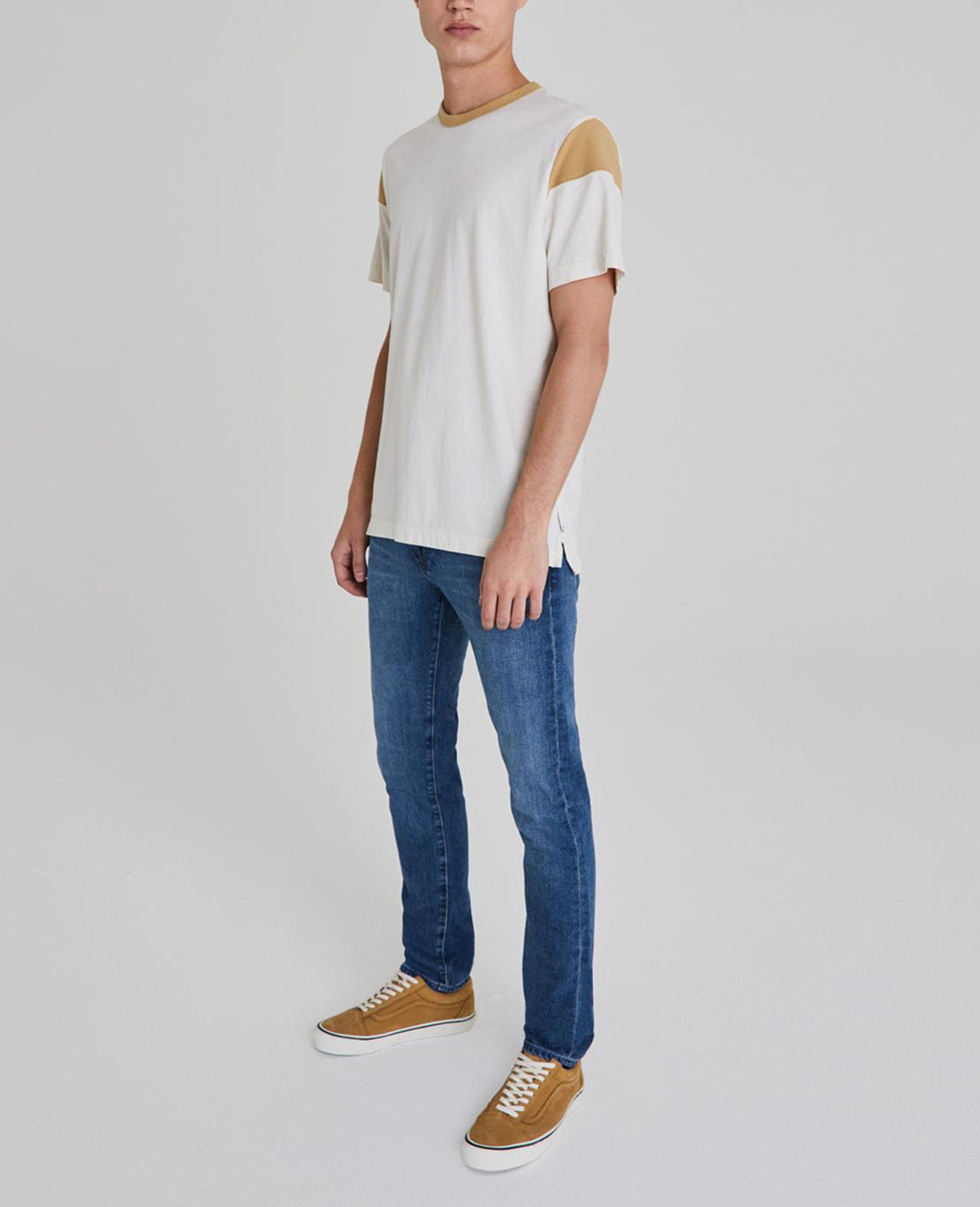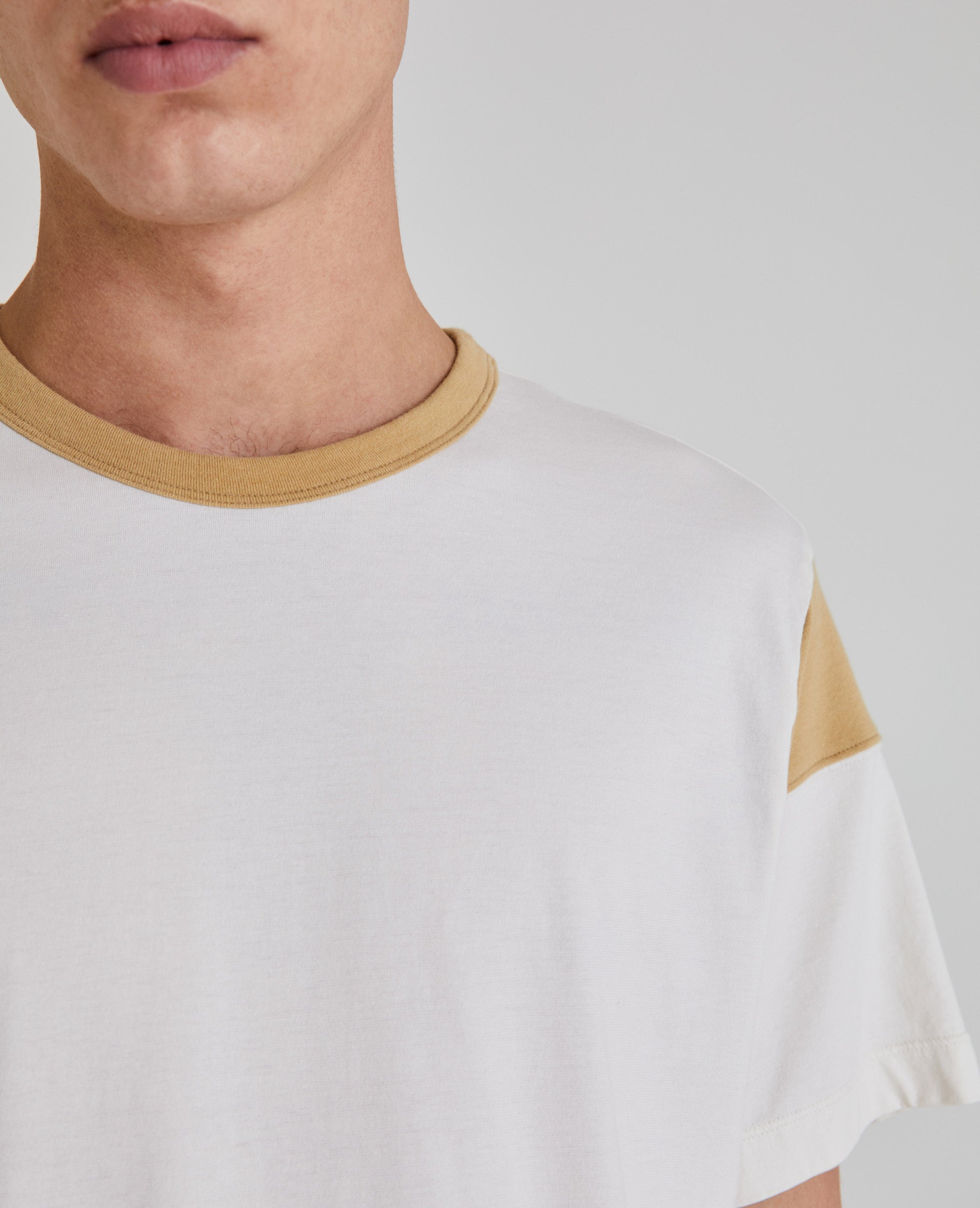 The Beckham Color Block Crew Tee for men features an muted off-white hue detailed with sandy beige contrasting at the shoulders and collar. The Beckham Color Block T-Shirt offers a boxier silhouette and drop shoulders for a contemporary fit. High-low split seam with self binding creates an unexpected but subtle dimension for an everyday basic. This men's t-shirt is designed in a lightweight fabric made from 100% cotton fibers that are thoughtfully knitted to prevent torqueing. This AG exclusive fabric offers a durable 20/1 knit that withstands everyday wear through the seasons.