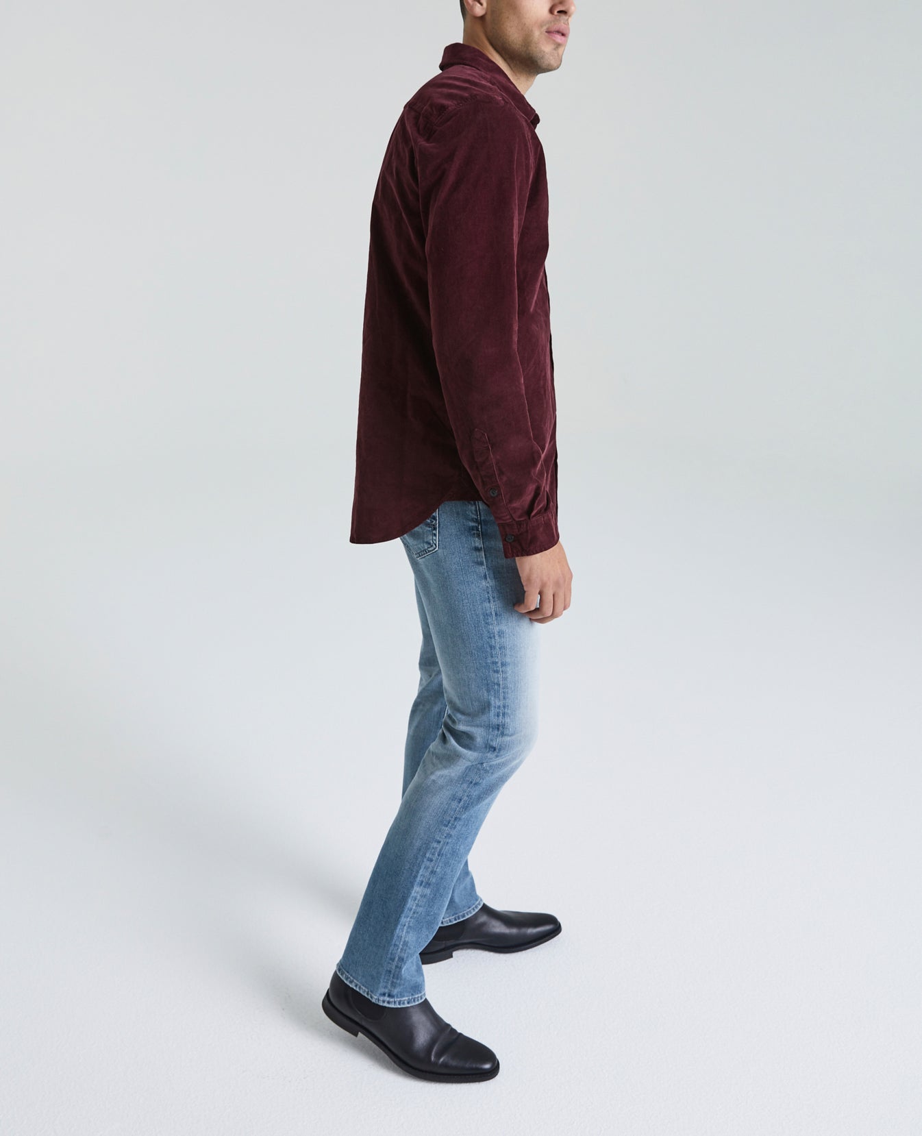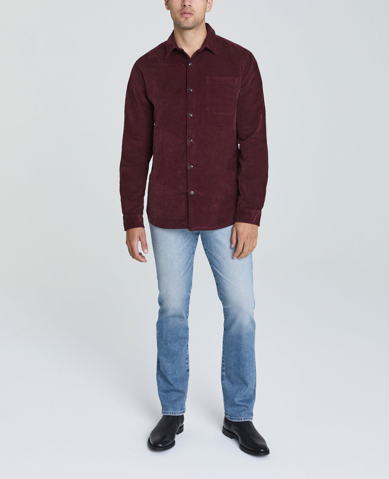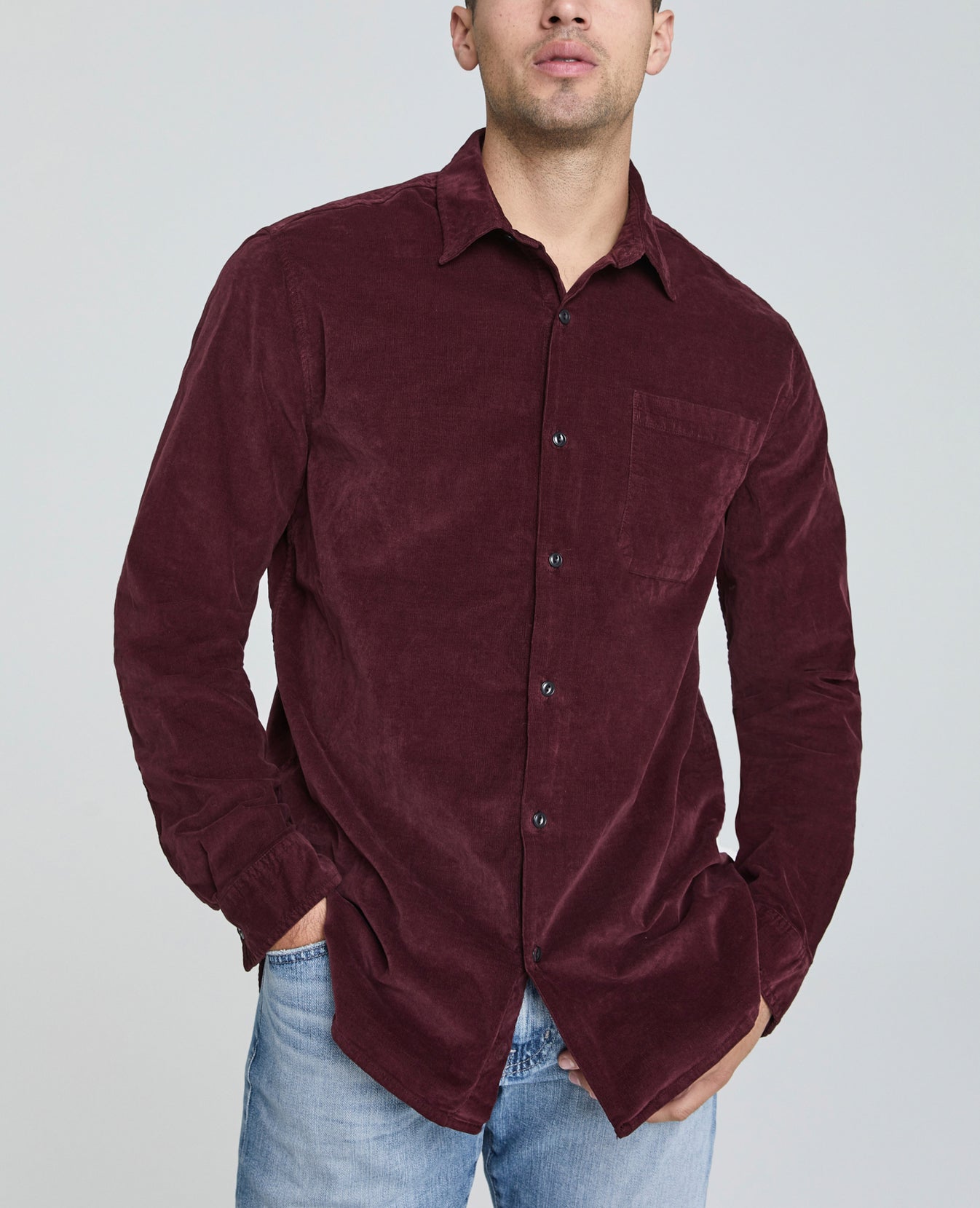 Benning Single Pocket Shirt for men features a rich jewel tone, slim silhouette, single chest pocket, and rounded hem. This men’s button up corduroy shirt is designed in a plush baby wale corduroy with a velvety finish and added stretch.