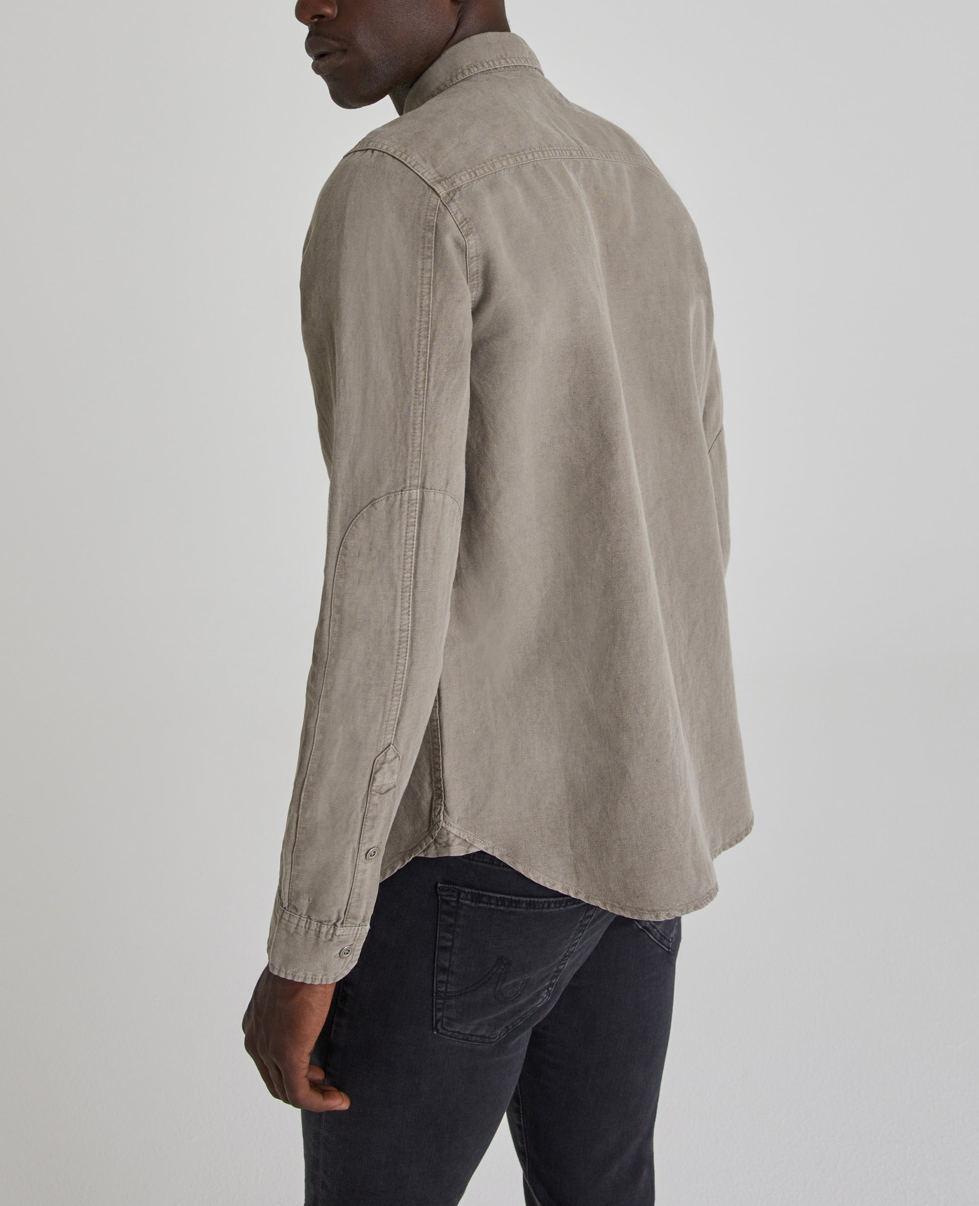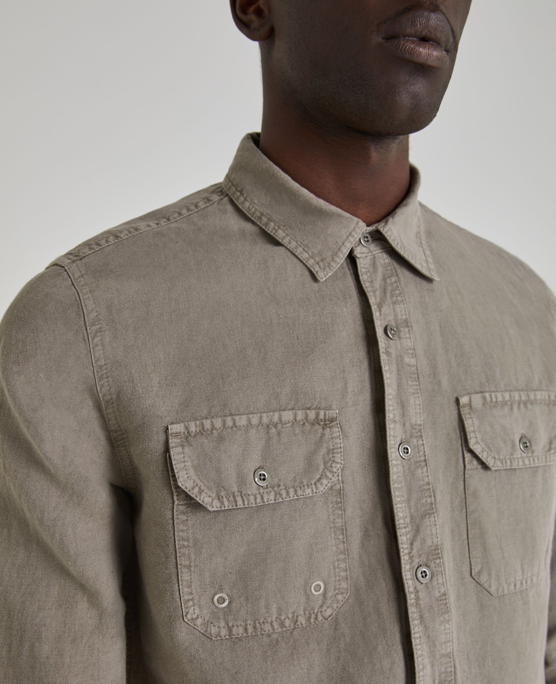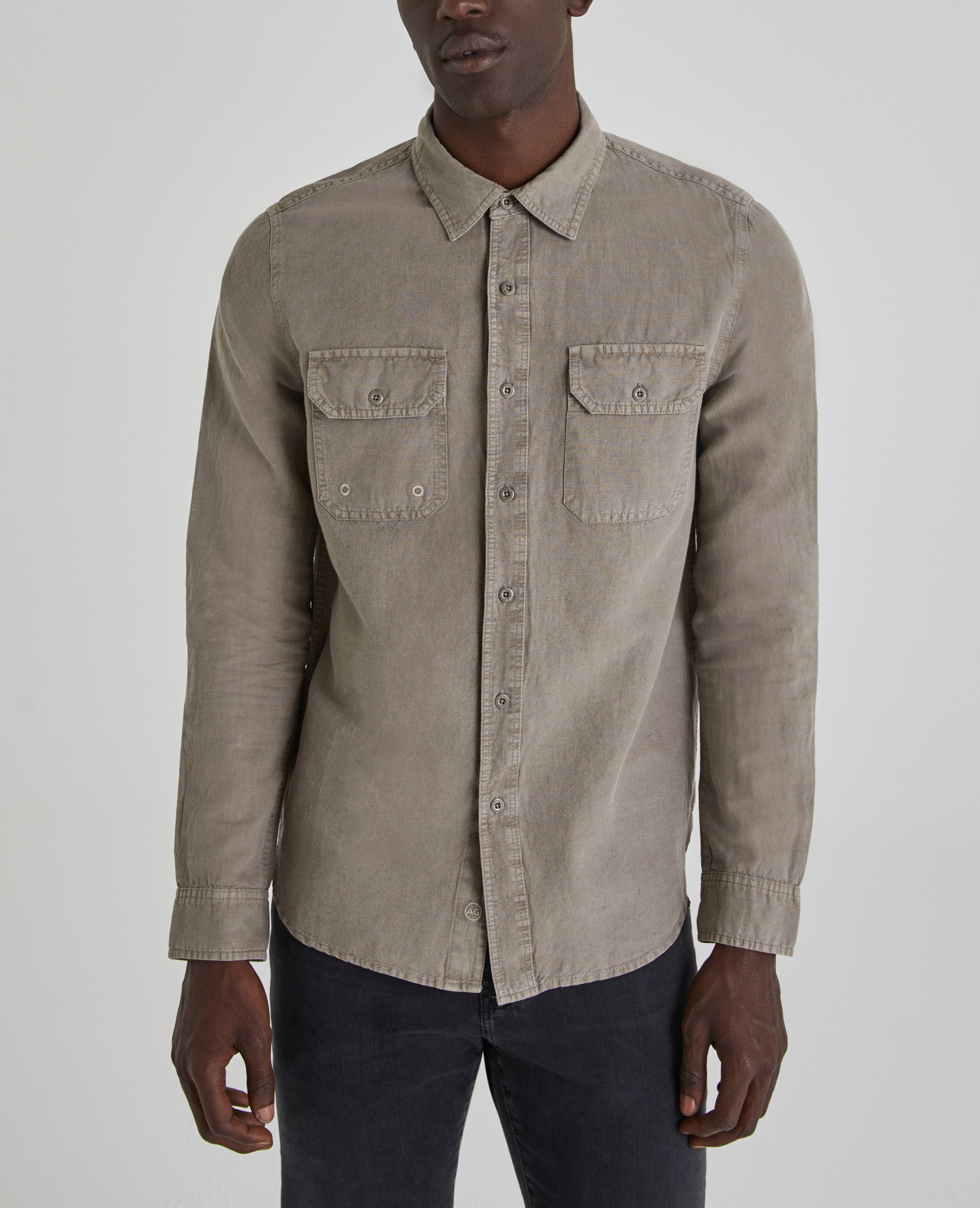 The Benning Sleeve Patch Shirt for men features a vintage industrial grey tone finished with an innovative sulfur treatment for subtle highs and lows for lived-in appeal.The Benning Sleeve Patch Button Up Shirt is constructed with embroidered eyelets, scratch enamel buttons, and a slimming fit juxtaposed with vintage utility construction. This men’s button up denim shirt is designed in a lightweight cotton linen blend for extra breathability and comfort.