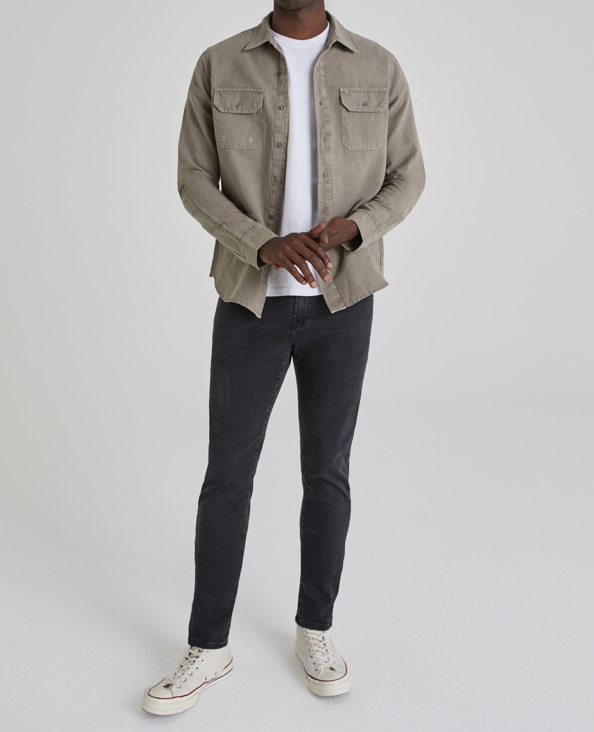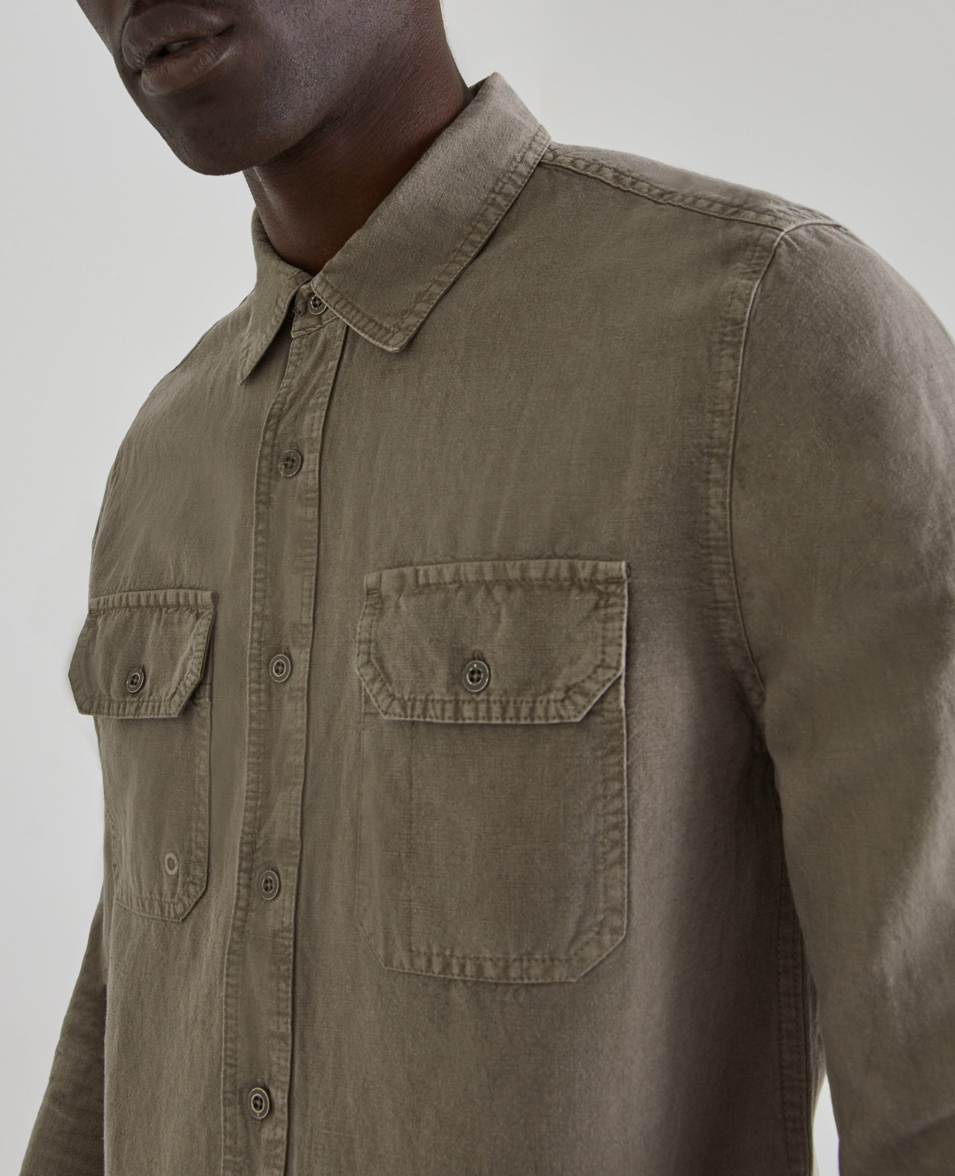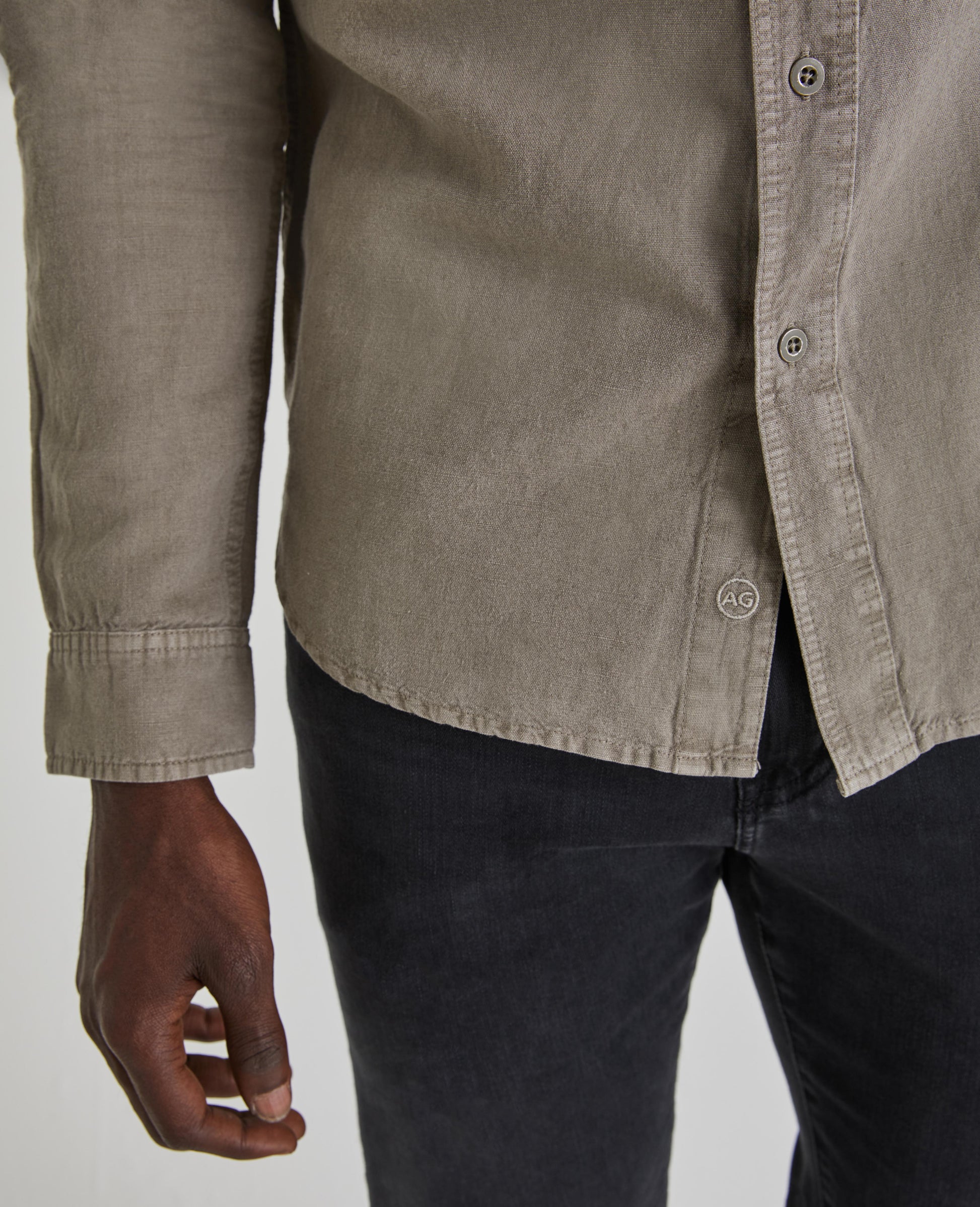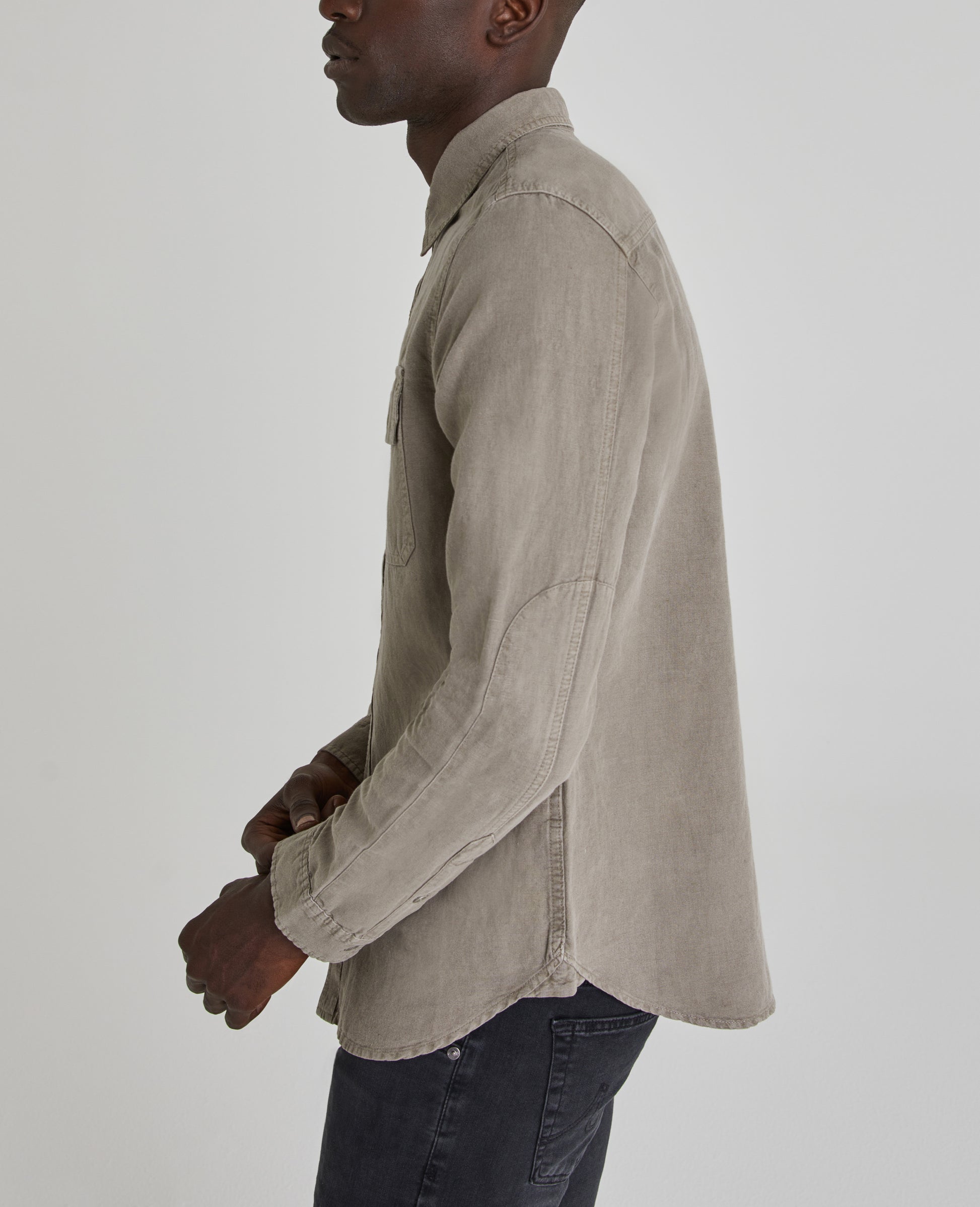 The Benning Sleeve Patch Shirt for men features a vintage industrial grey tone finished with an innovative sulfur treatment for subtle highs and lows for lived-in appeal.The Benning Sleeve Patch Button Up Shirt is constructed with embroidered eyelets, scratch enamel buttons, and a slimming fit juxtaposed with vintage utility construction. This men’s button up denim shirt is designed in a lightweight cotton linen blend for extra breathability and comfort.