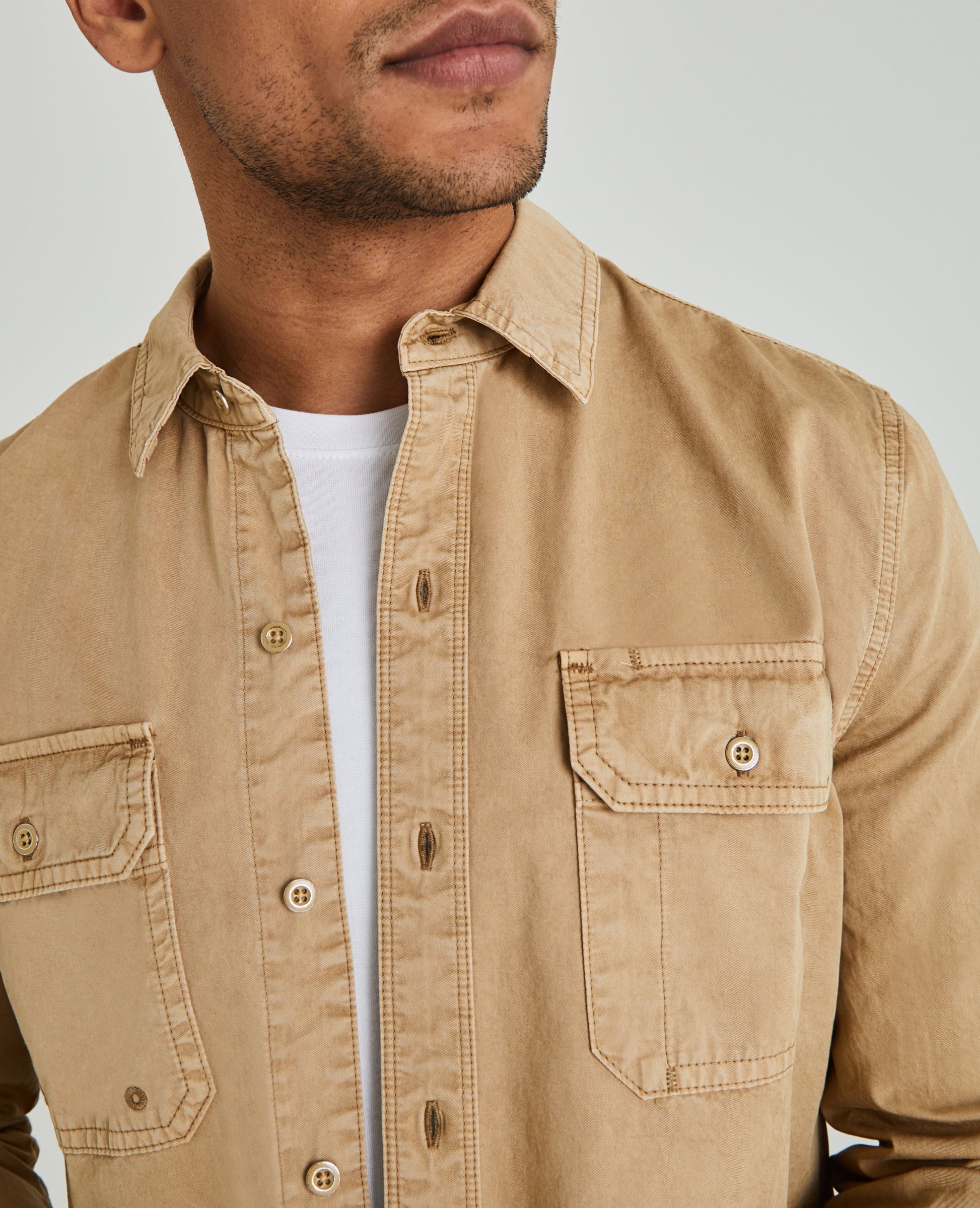 The Benning Sleeve Patch Shirt for men features a classic khaki hue finished with an innovative sulfur treatment for subtle highs and lows for lived-in appeal. The Benning Sleeve Patch Button Up Shirt is constructed with embroidered eyelets, scratch enamel buttons, and a slimming fit juxtaposed with vintage utility construction. This men’s button up denim shirt is designed in a structured poplin fabric spun with a 100% cotton twill weave that provides a perfect canvas for specialty dye treatments.