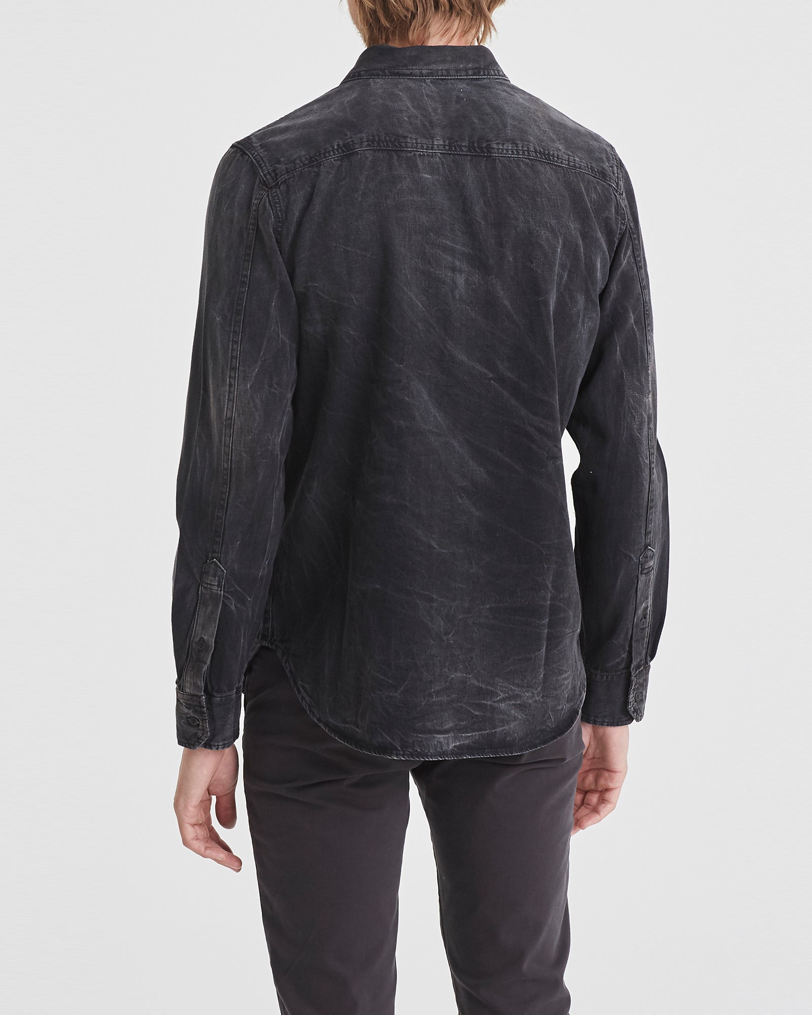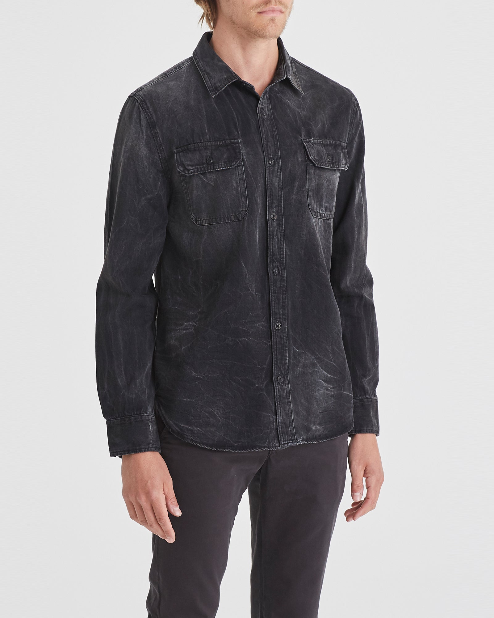 The Benning Utility Shirt for men features a vintage black denim wash with placement fading applied with a unique tying technique, slim silhouette, and rounded hem. This men’s button up denim shirt is designed in non-stretch crosshatch denim with lightweight fabrication and finished with pearl white buttons.