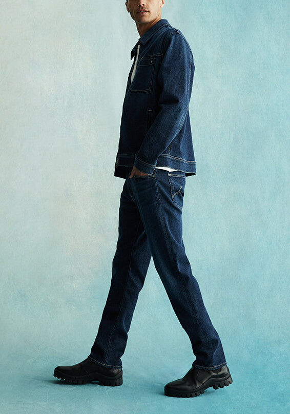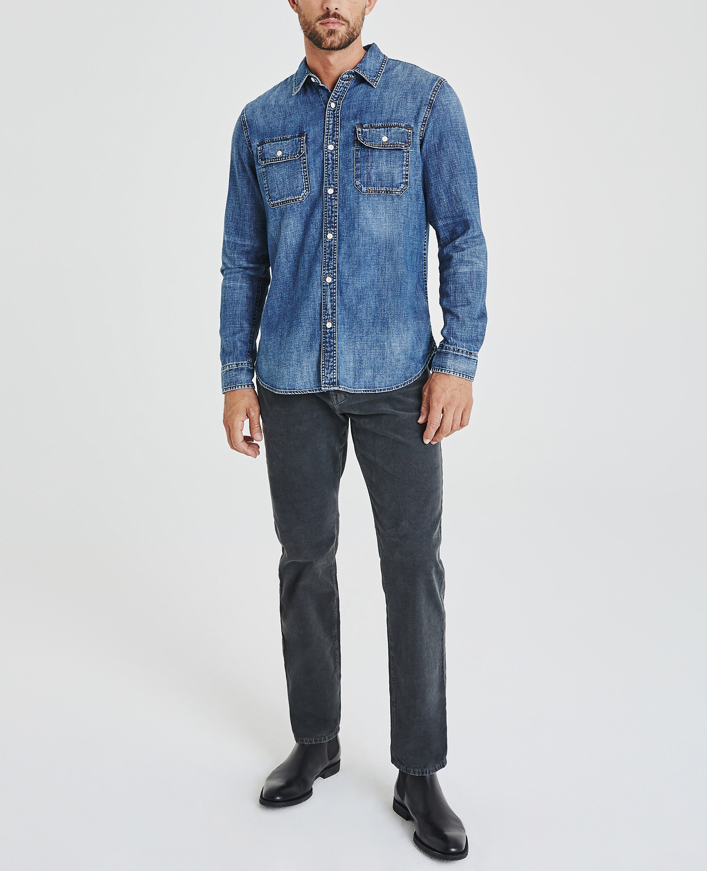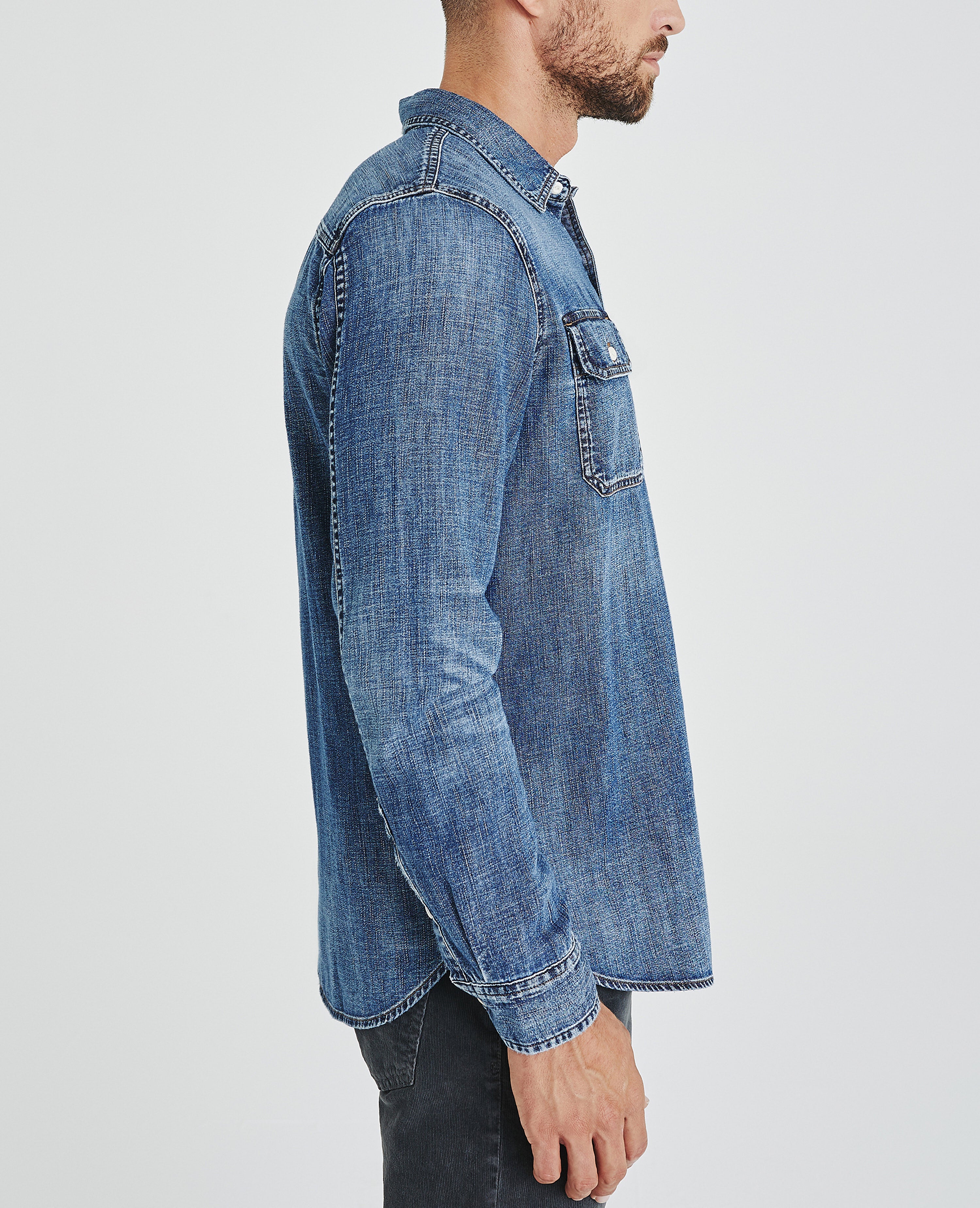 The Benning Utility Shirt for men features a medium wash with 9 year vintage fade treatment, slim silhouette, and rounded hem. This men’s button up denim shirt is designed in non-stretch crosshatch denim with lightweight fabrication and finished with pearl white buttons.