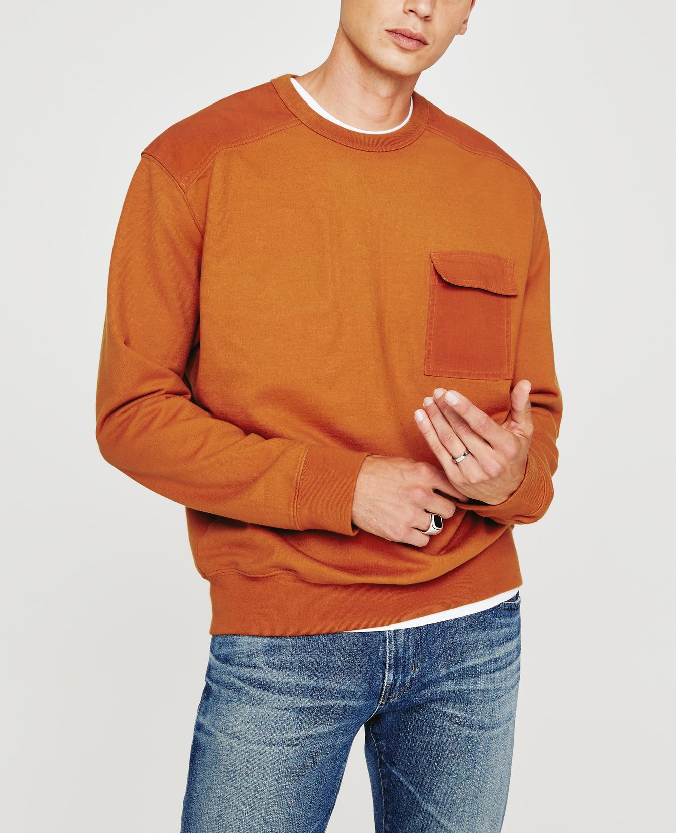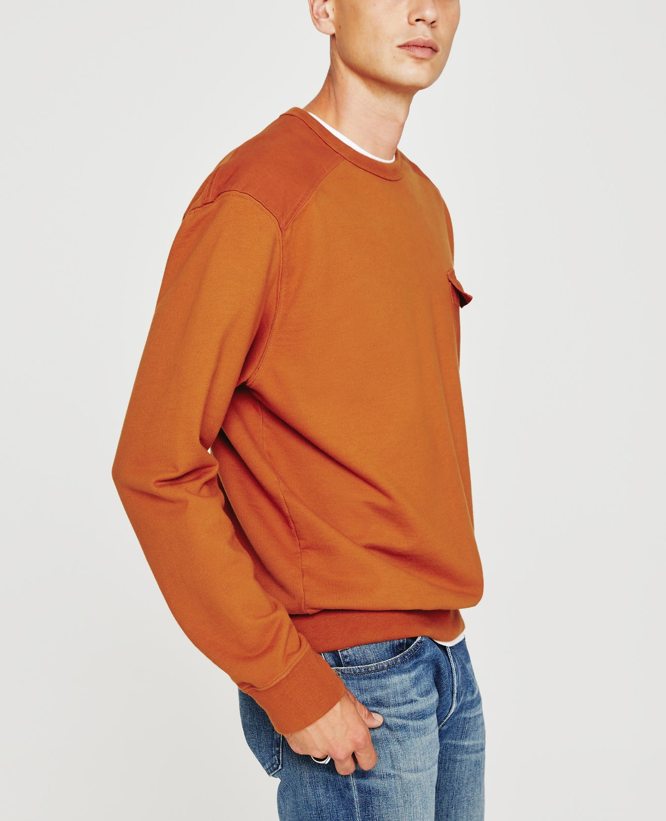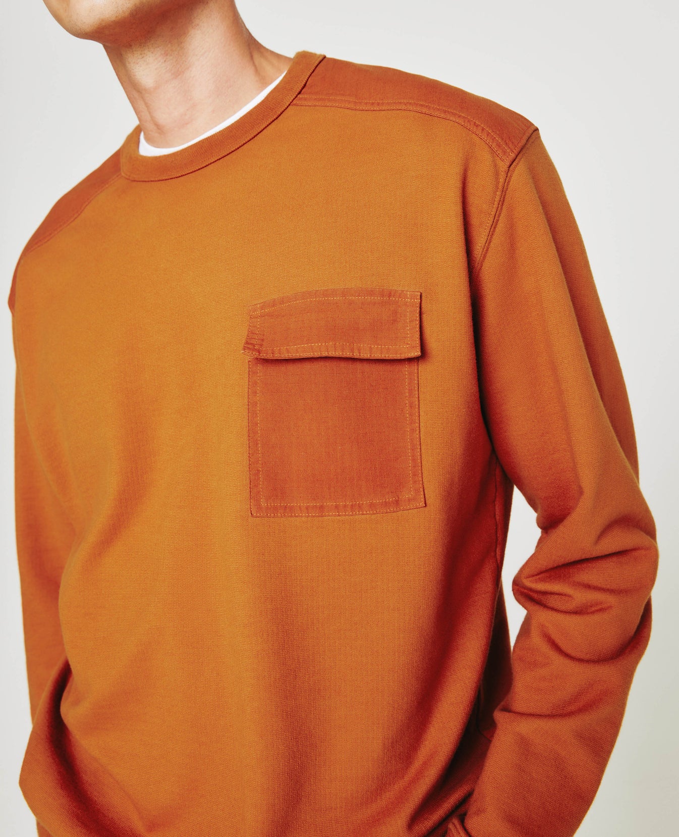 The Brendan Sweatshirt is a relaxed-fit crewneck featuring an autumnal orange color, this men's long sleeve top has a soft, elevated feel in our 100% cotton Essential Luxe Terry. Woven shoulder paneling and a flap pocket at the chest complete the look.