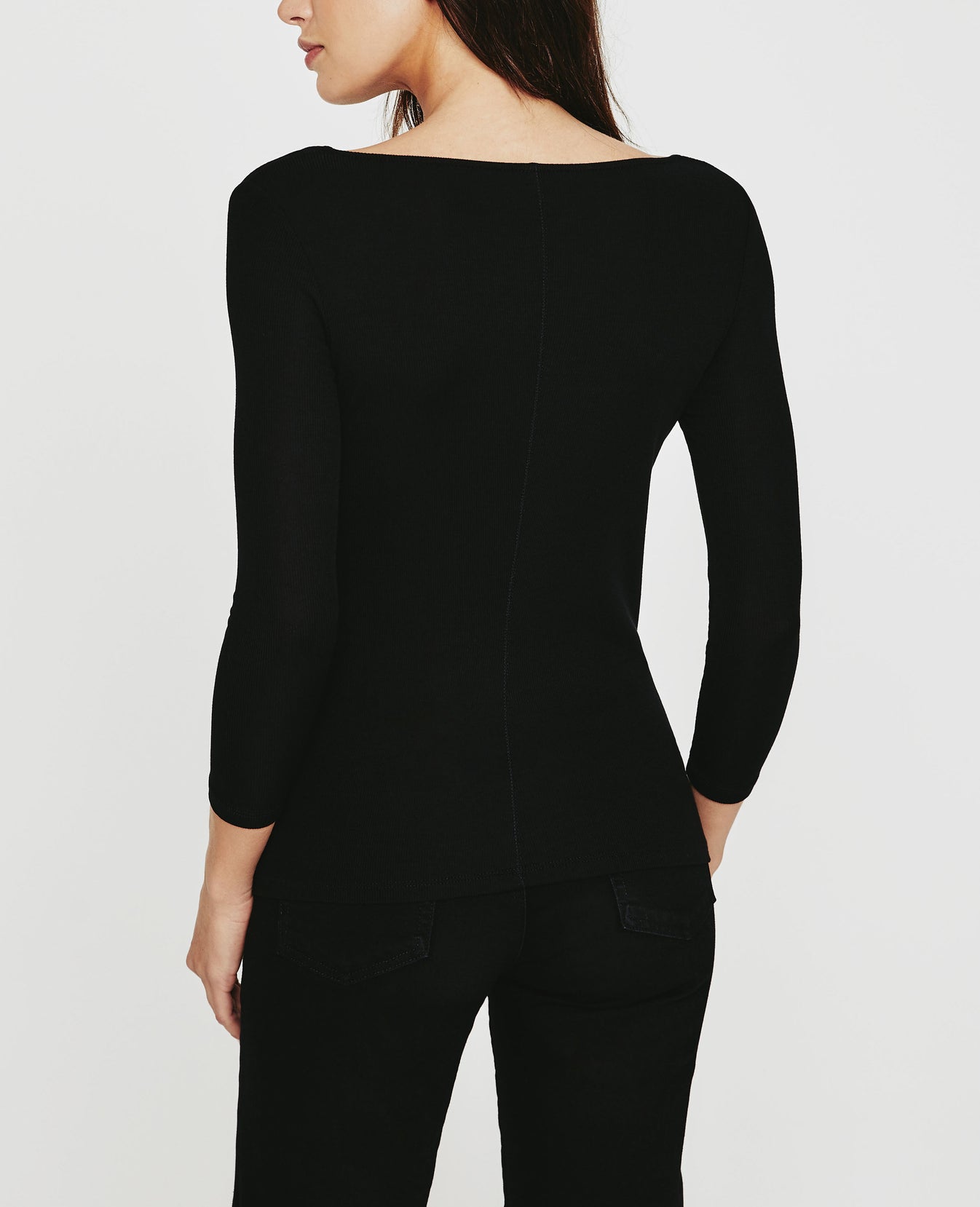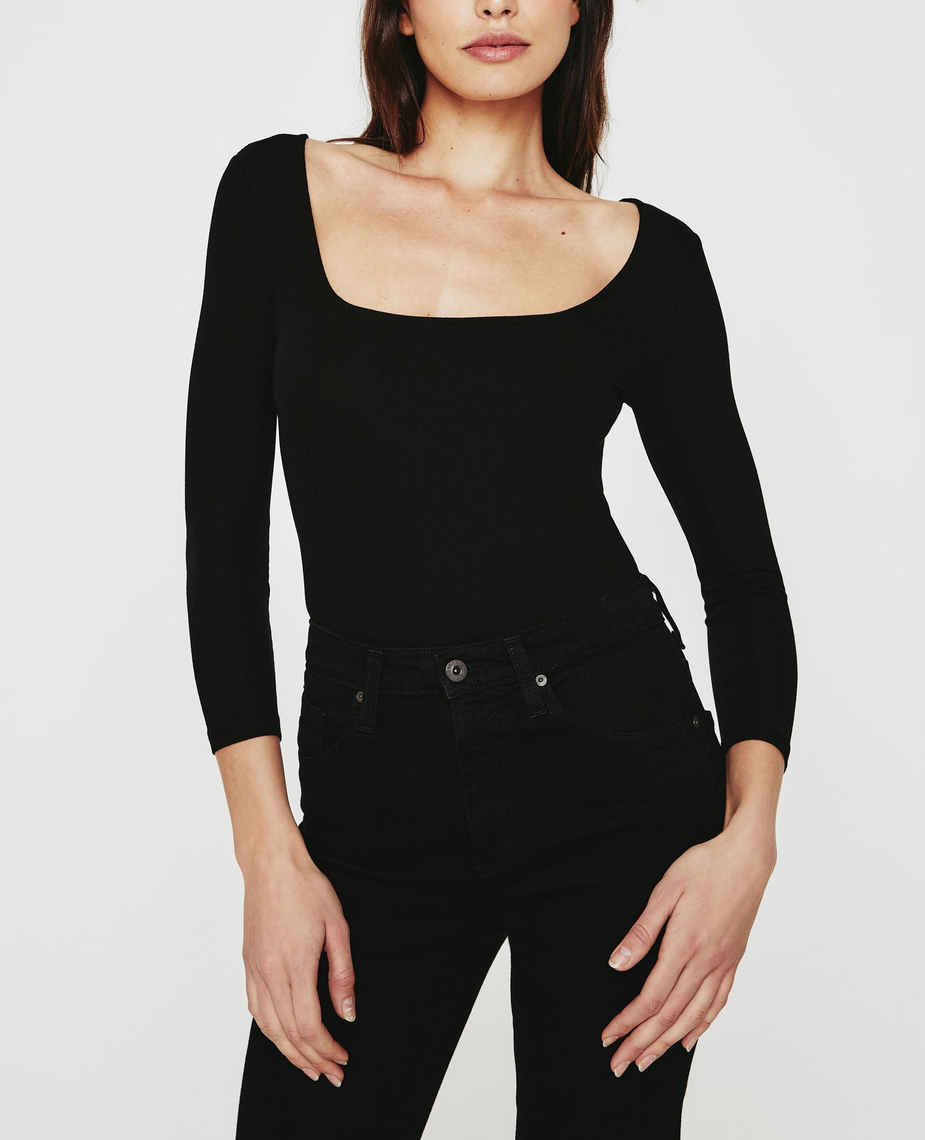 The Brigitte Square Neck Tee features a unique bracelet sleeve and square neckline, all elements coming together in a soft and sumptuous ribbed knit. This classic, fitted silhouette offers a new neckline in an assortment of traditional tees. Our in-house looms deliver the precision knitting needed to accomplish the characteristic 2x1 weave that lends to the fabric’s superior comfort and draping qualities. Designed in a premium black spandex and 2x1 Lyocell Rib fabrication.