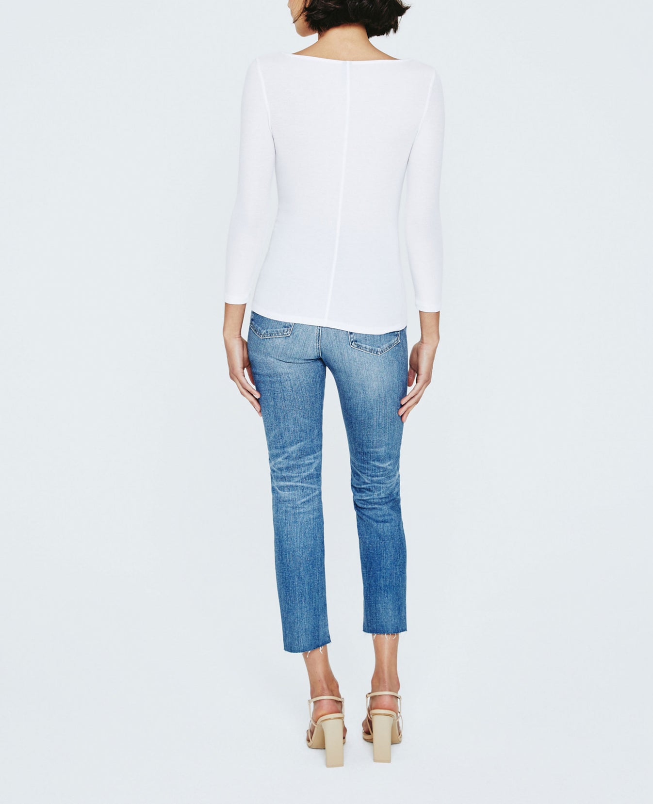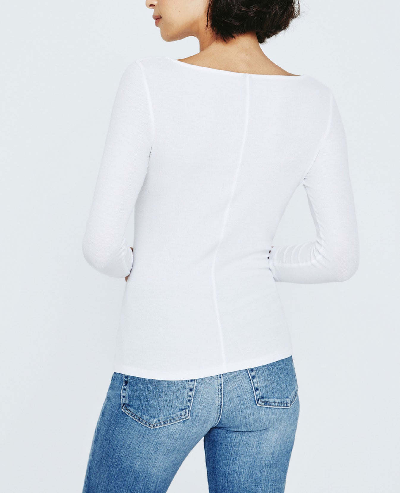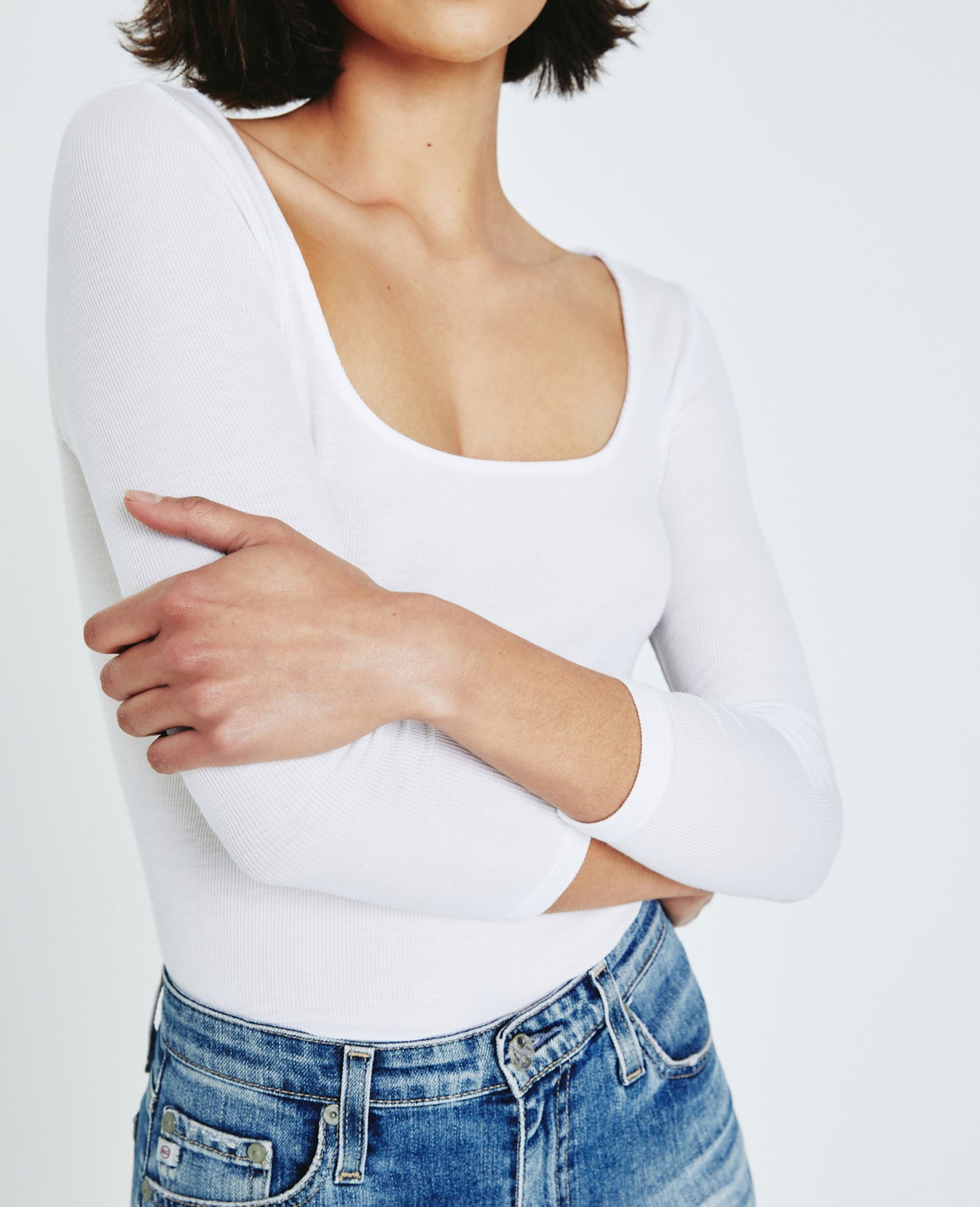The Brigitte Square Neck Tee features a unique bracelet sleeve and square neckline, all elements coming together in a soft and sumptuous ribbed knit. This classic, fitted silhouette offers a new neckline in an assortment of traditional tees. Our in-house looms deliver the precision knitting needed to accomplish the characteristic 2 X 1 weave that lends to the fabric’s superior comfort and draping qualities. Designed in a premium white spandex and 2 X 1 Lyocell Rib fabrication. Made with Eucalyptus, our lyocell is plant-based, biodegradable, and uses 20% less resources to develop.