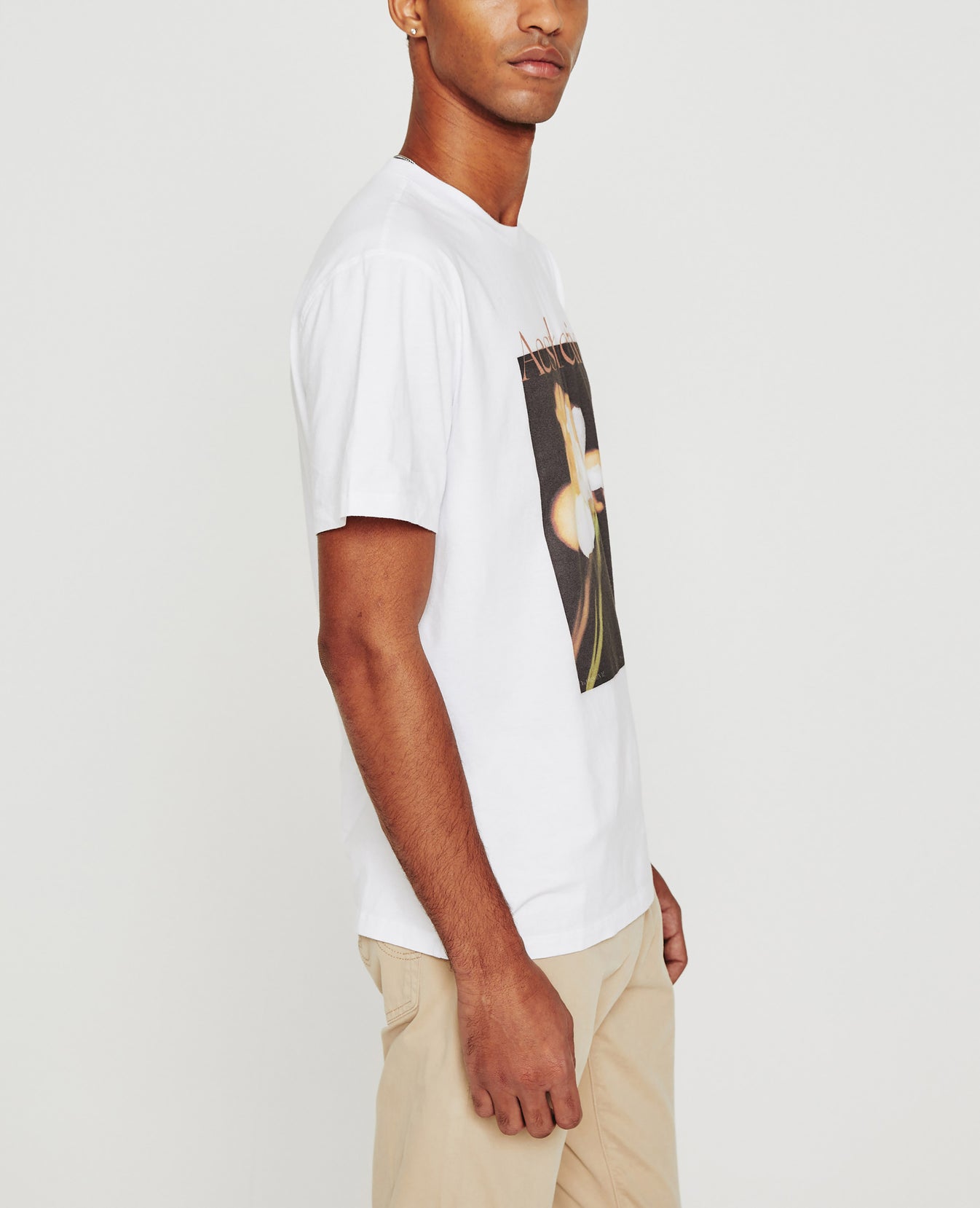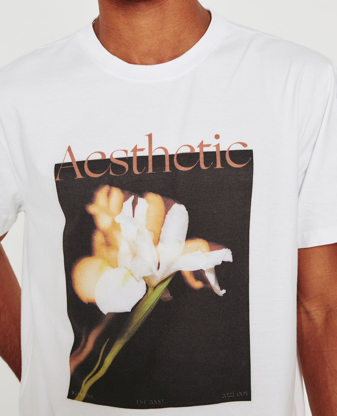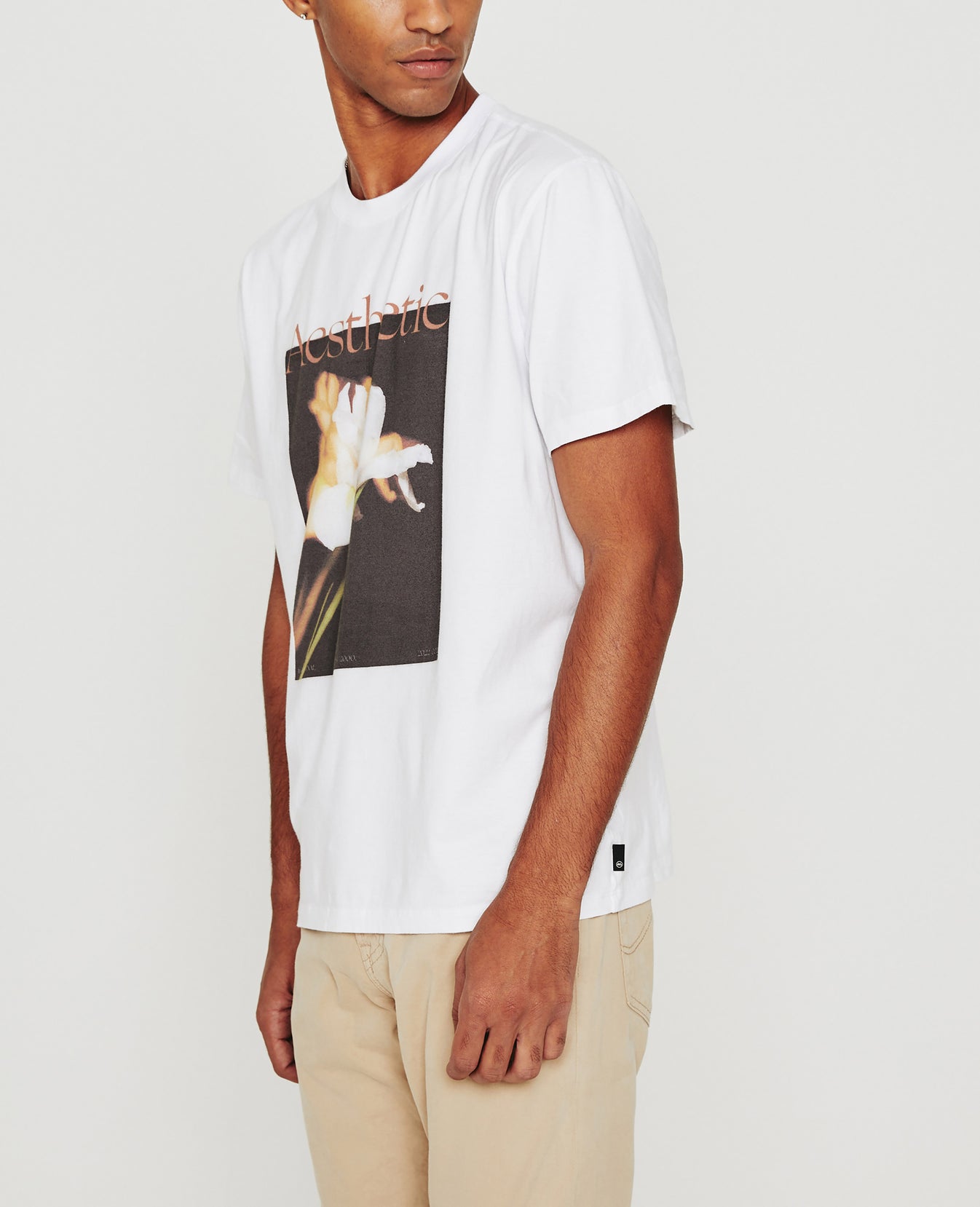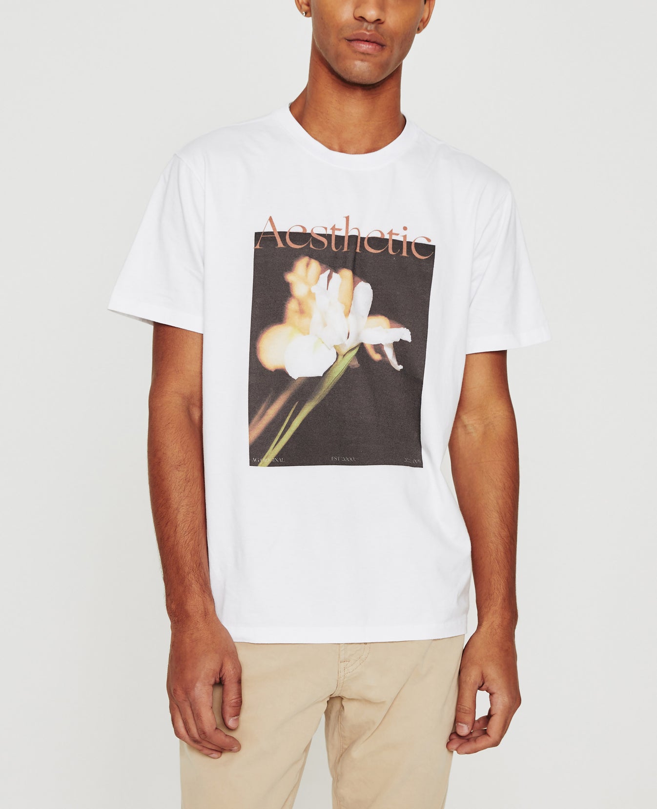 The Bryce Crew is a classic-fit crewneck tee, updated in white with an original photograph captured at our Los Angeles design studio. Made from Luxe Comfort Jersey that resists torquing and twisting, this short-sleeve T-shirt is printed with a manipulated image of a flower and 'Aesthetic' lettering in pink across the front.