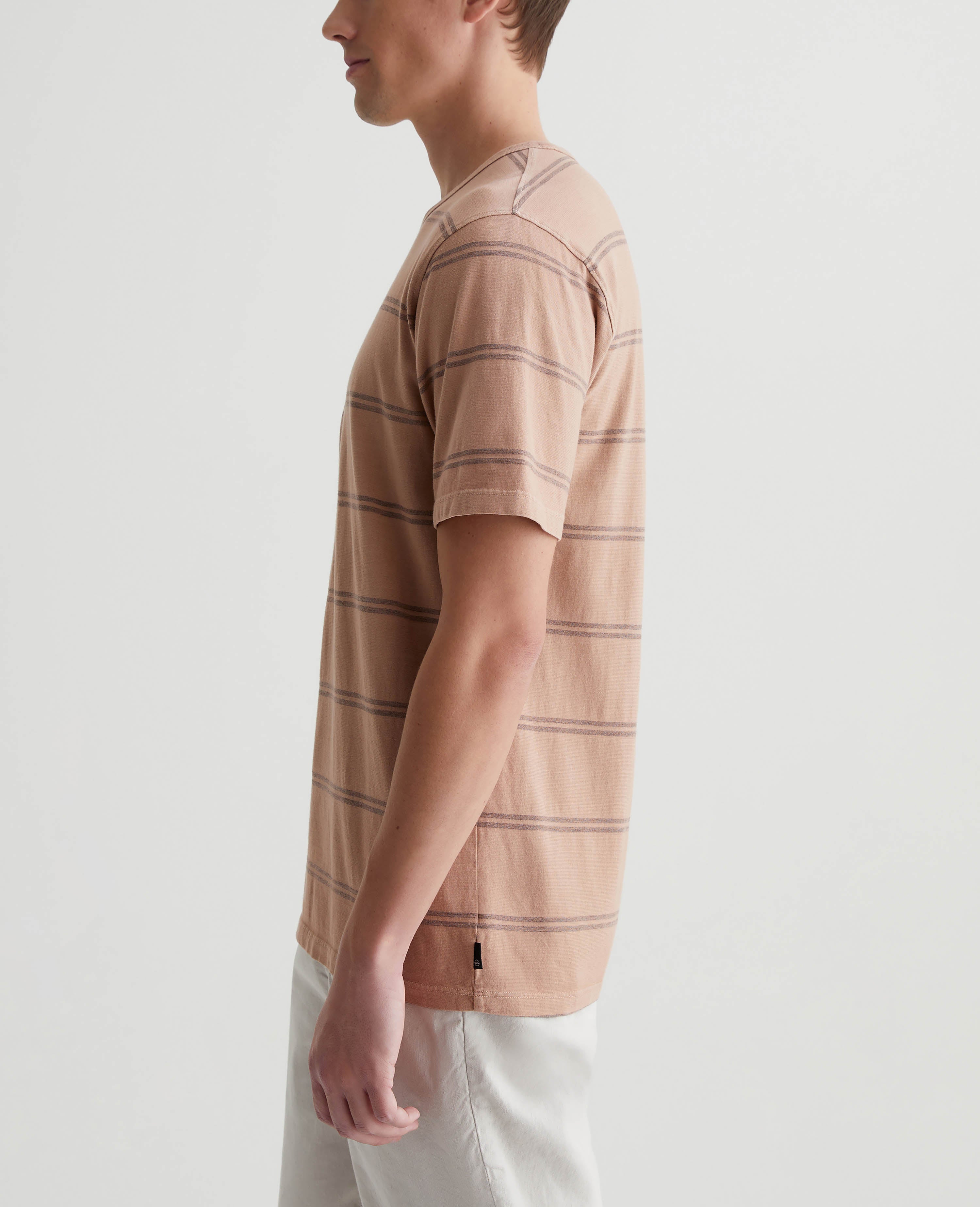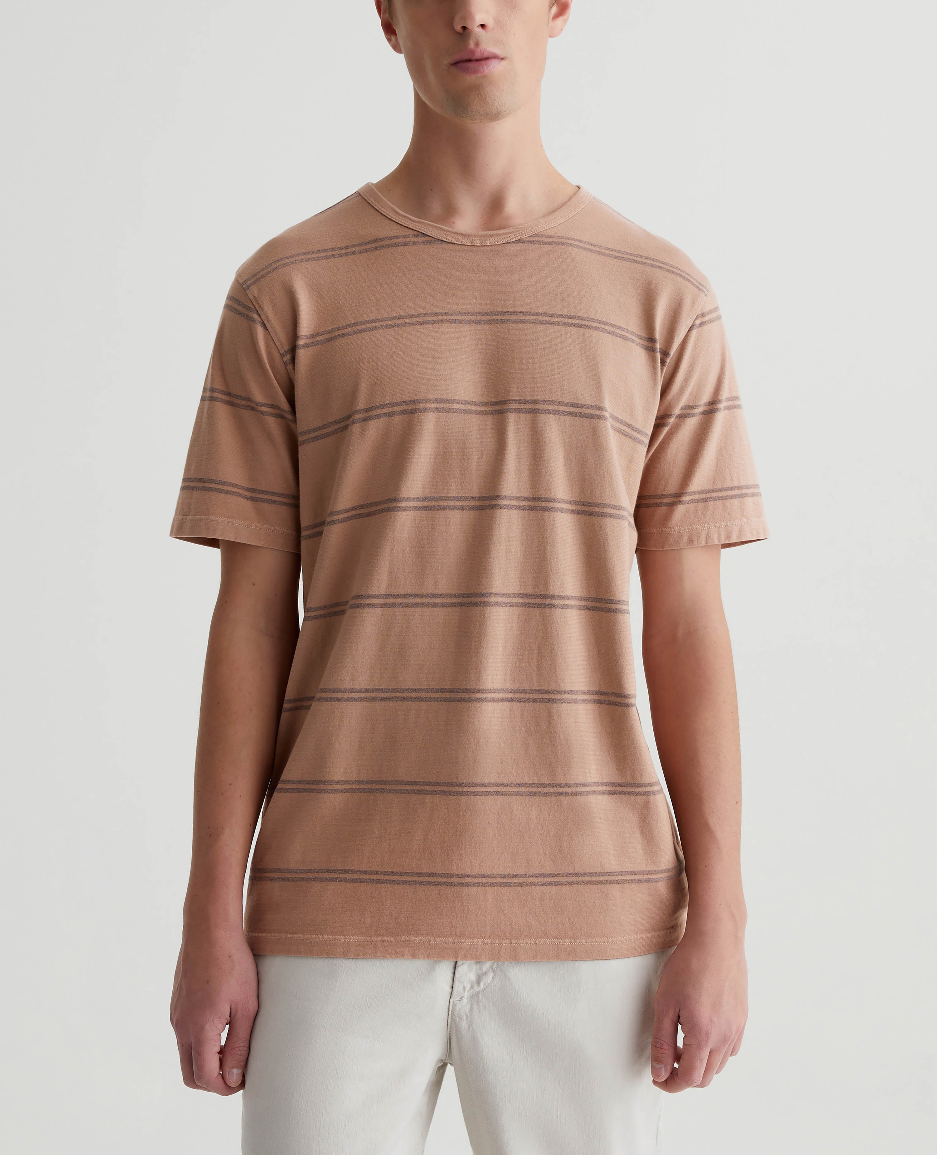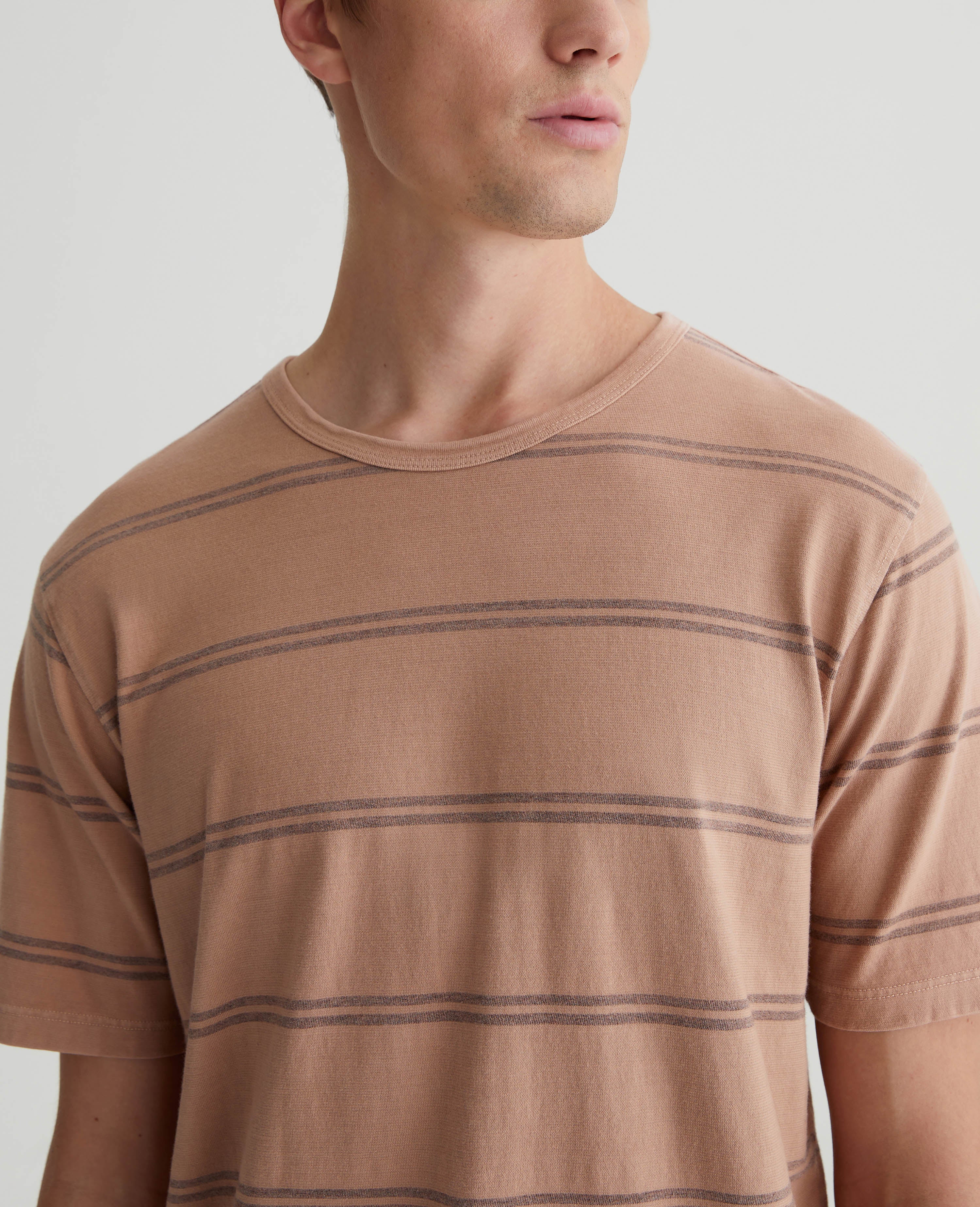The Bryce Crew is a men's crewneck tee featuring a classic fit and short sleeves. Done in a sepia color with grey stripes, it's crafted from 100% cotton and features 1x1 baby rib at the neckline. Our Light Cotton Jersey offers unrivaled comfort, knitted with both S-twist and Z-twist yarns to prevent twisting and torquing. The result is a softer, more durable fabric that creates a stable, long-lasting shape.