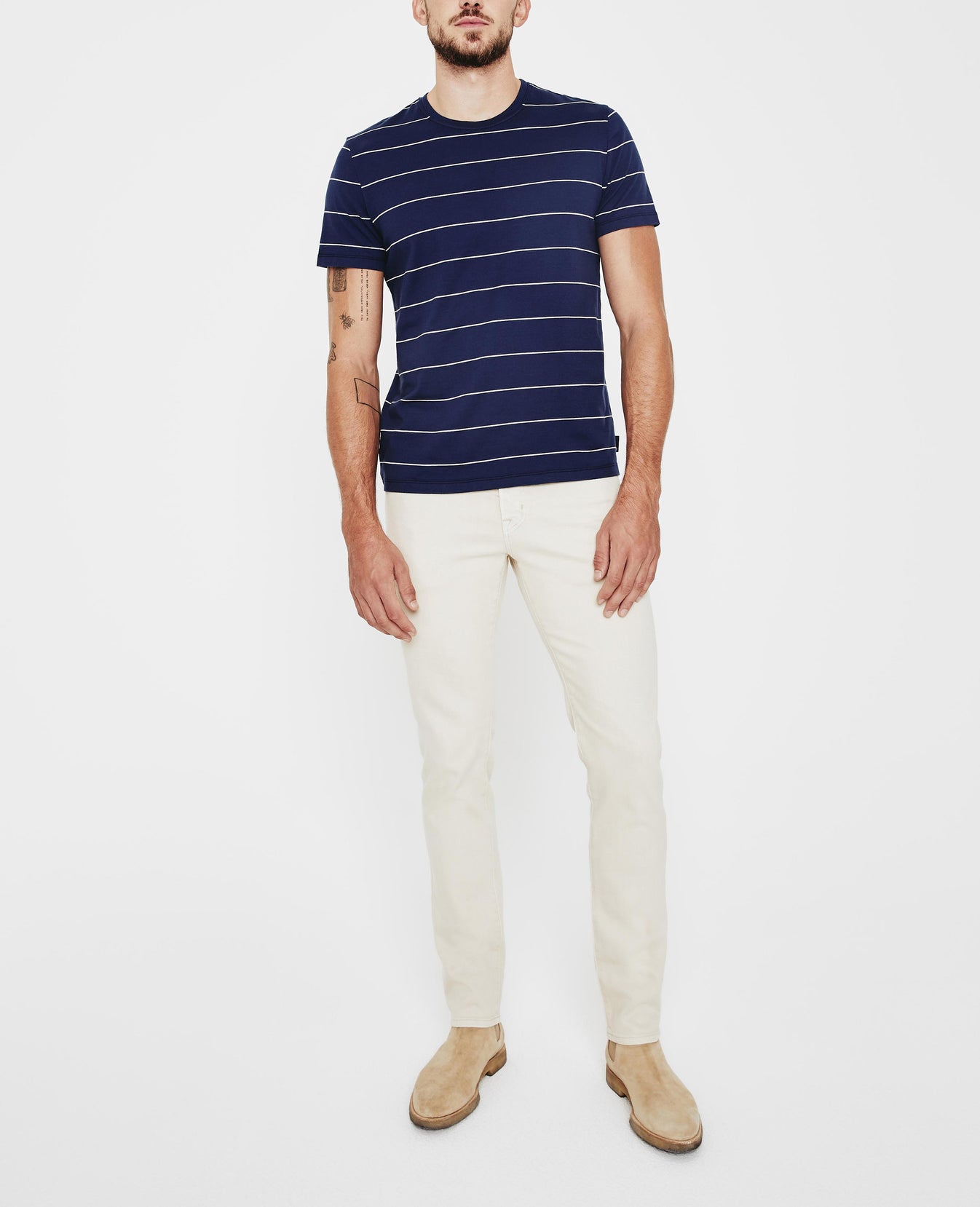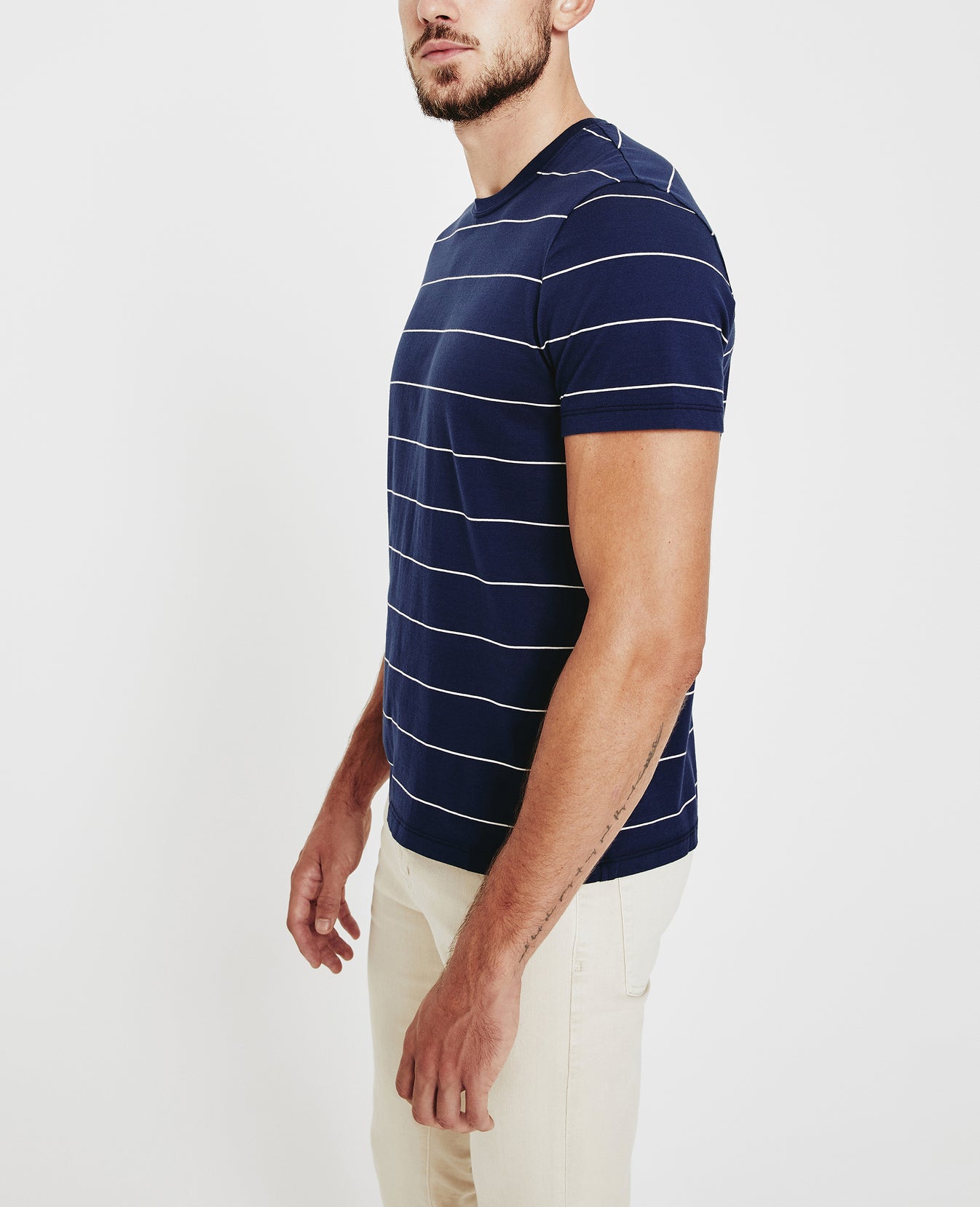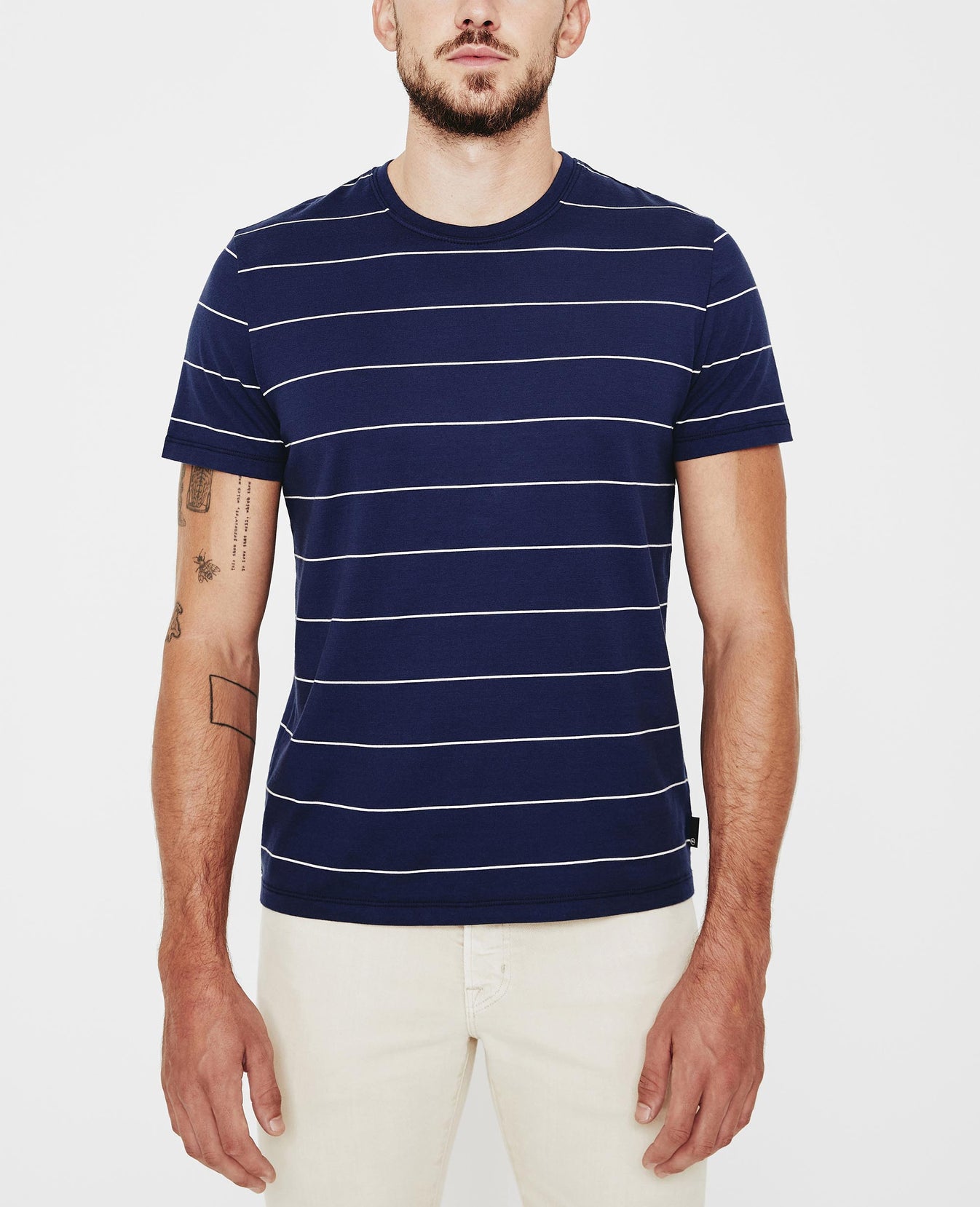 The Bryce Crew Tee for men features our brand-new Floaty Thin Stripe fabric—complete with a navy blue base and collegiate, yarn-dyed off-white stripes. This men’s slim t-shirt is designed with a classic crew neckline and relaxed sleeve and is still cut in our lightweight fabric made from 100% cotton fibers—thoughtfully knitted to prevent torqueing. This AG exclusive fabric offers a durable 20/1 knit that offers excellent movability and comfort.
