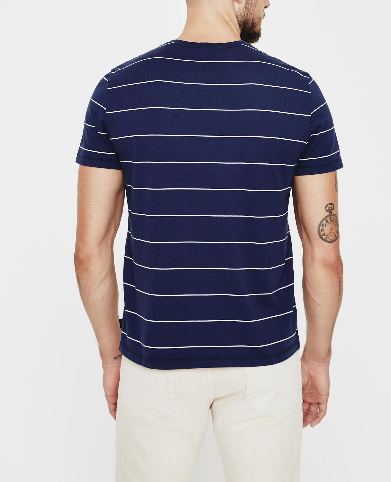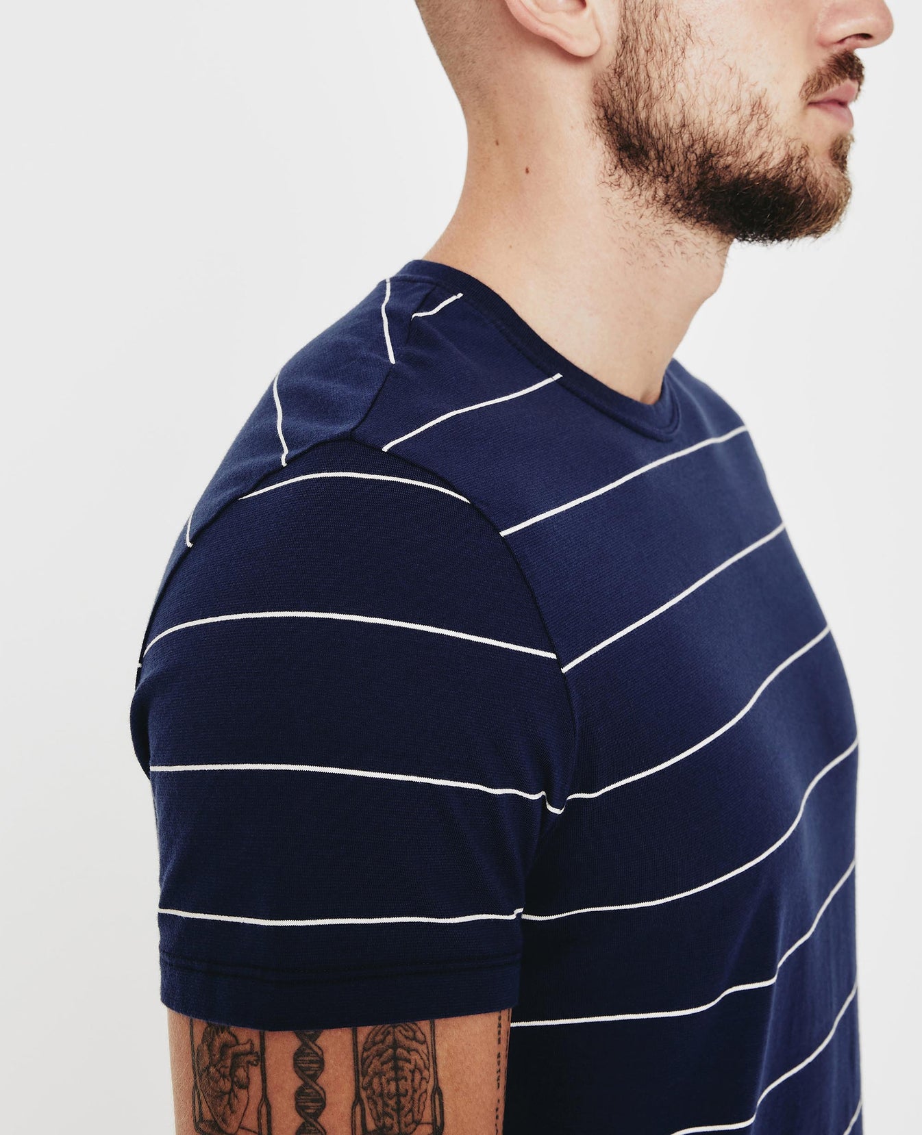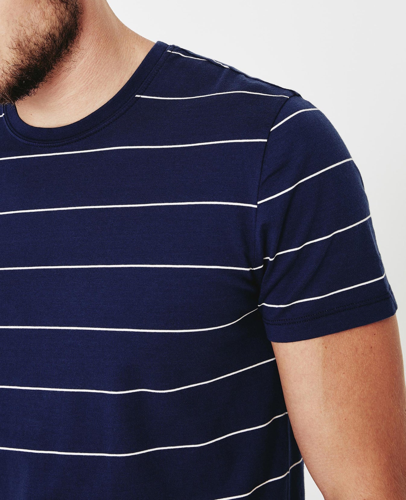 The Bryce Crew Tee for men features our brand-new Floaty Thin Stripe fabric—complete with a navy blue base and collegiate, yarn-dyed off-white stripes. This men’s slim t-shirt is designed with a classic crew neckline and relaxed sleeve and is still cut in our lightweight fabric made from 100% cotton fibers—thoughtfully knitted to prevent torqueing. This AG exclusive fabric offers a durable 20/1 knit that offers excellent movability and comfort.