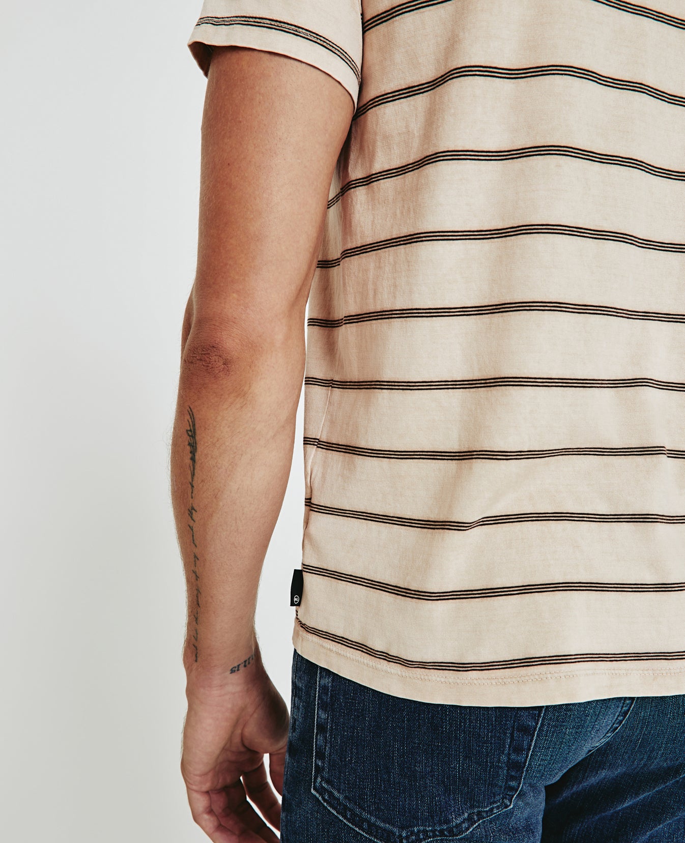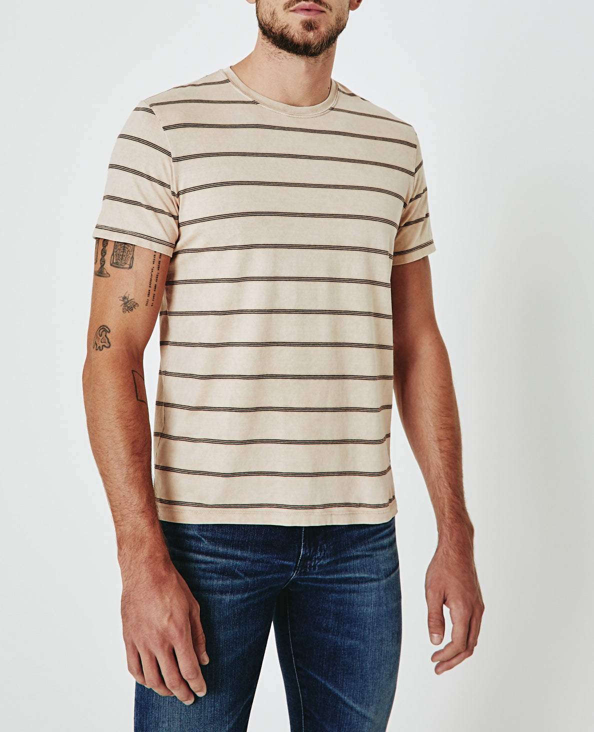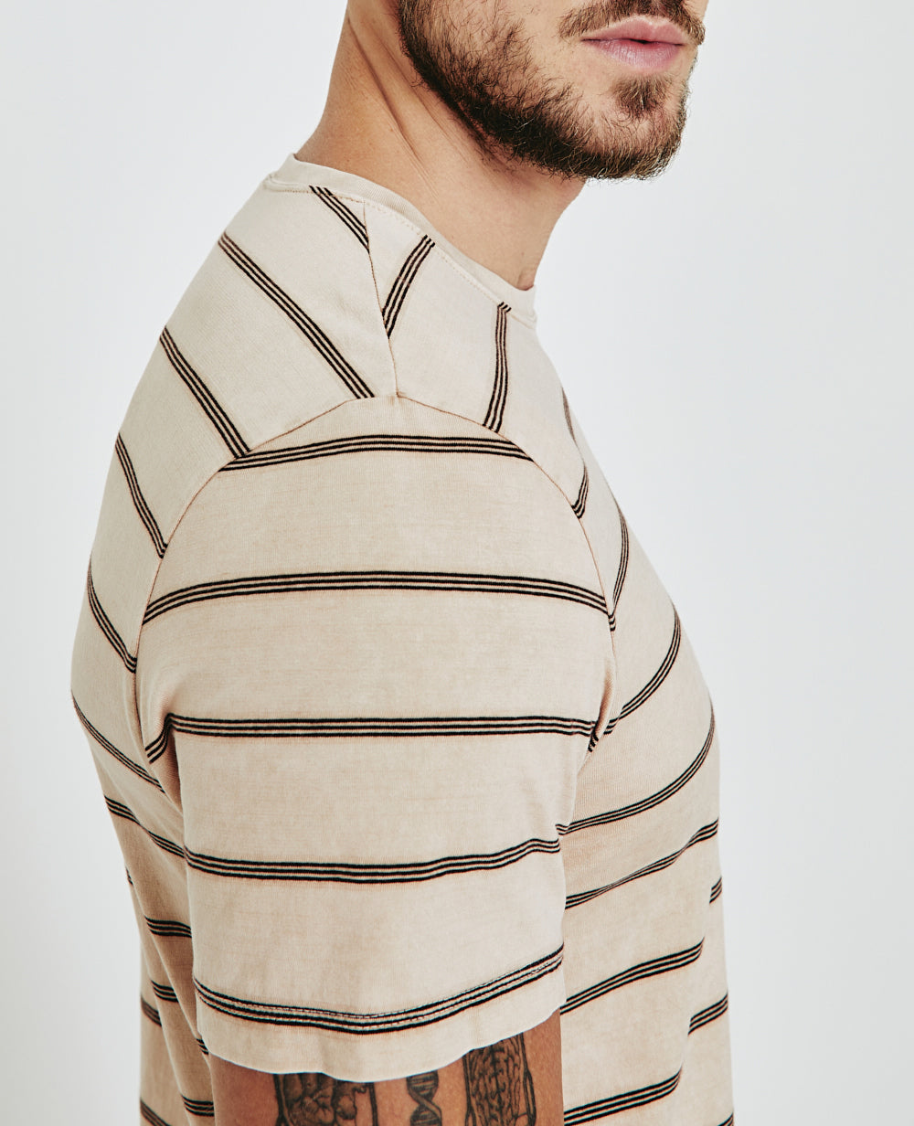 The Bryce Crew Tee is a crewneck t-shirt for men featuring a contrast stripe pattern on light oat beige dye finished with a luxury stonewash treatment for subtle acid wash characteristics.The Bryce offers a classic crew neckline, short sleeves, and a comfortable fit. This men's t-shirt is designed in a lightweight fabric distinctly made for ultra soft, comfortably breathable wear.