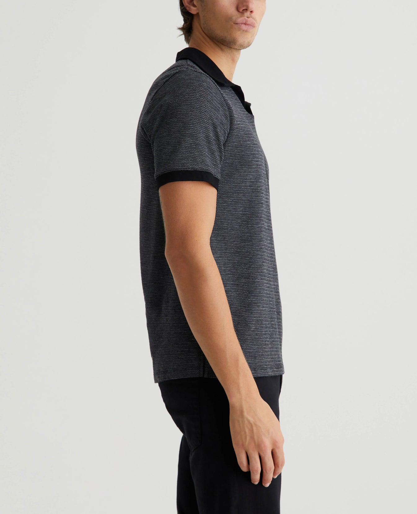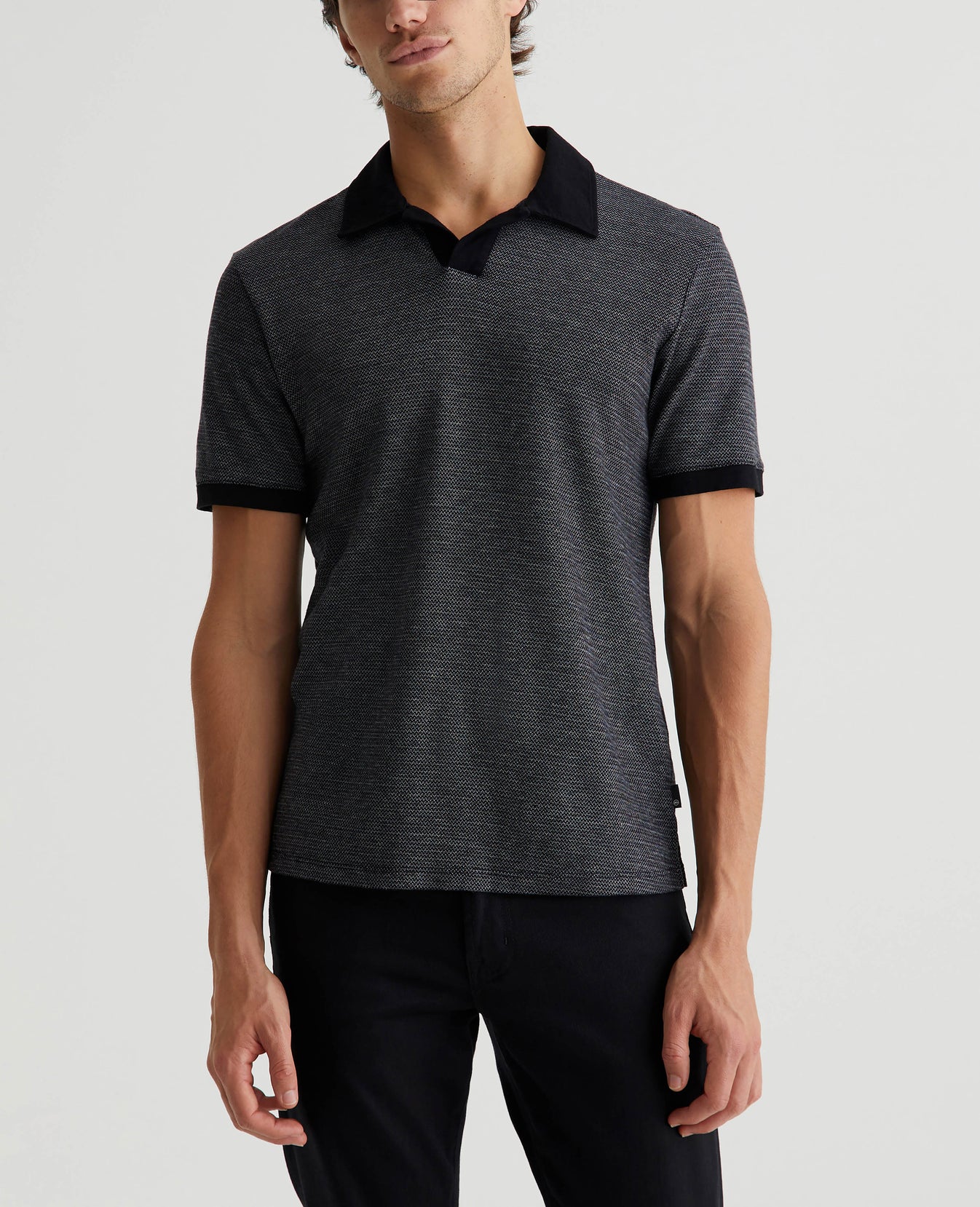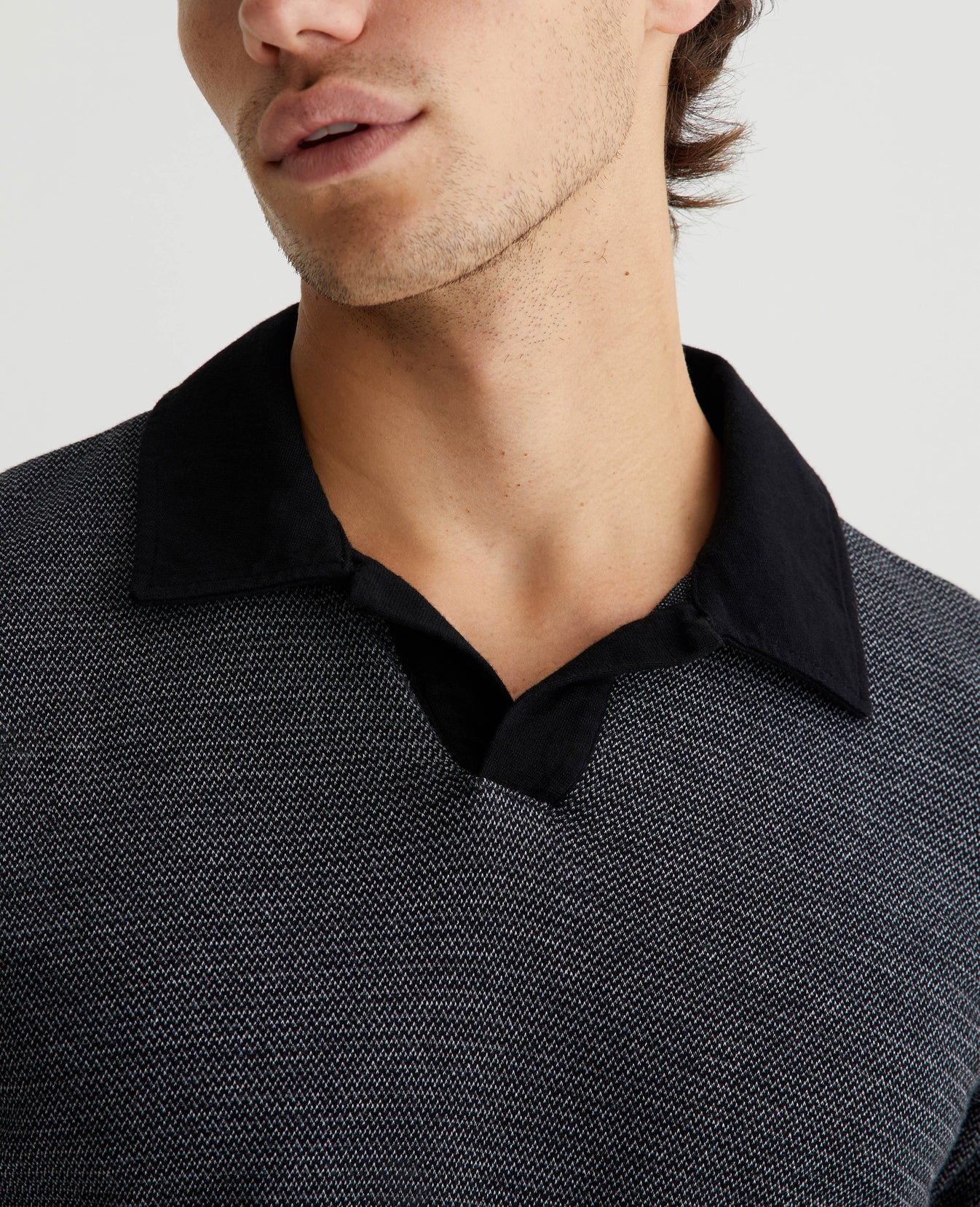The Bryce Johnny Collar shirt is a classic short-sleeve polo tee with a relaxed neckline and pointed collar. Elevated by our Luxe Heavy Jacquard in black, it's got a delicate chevron pattern accented by solid trim.