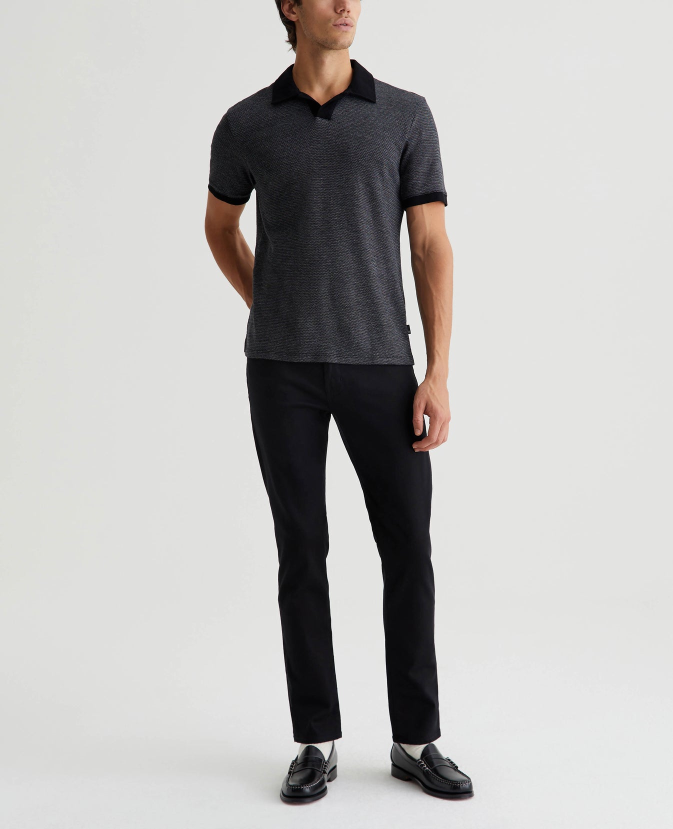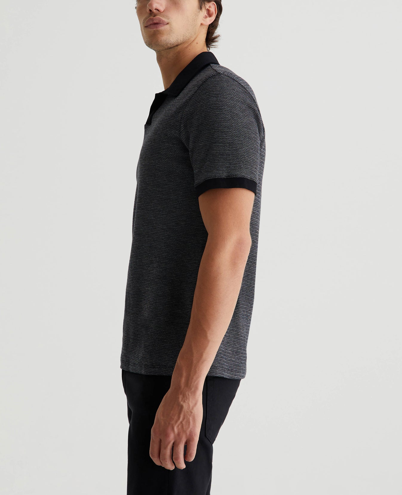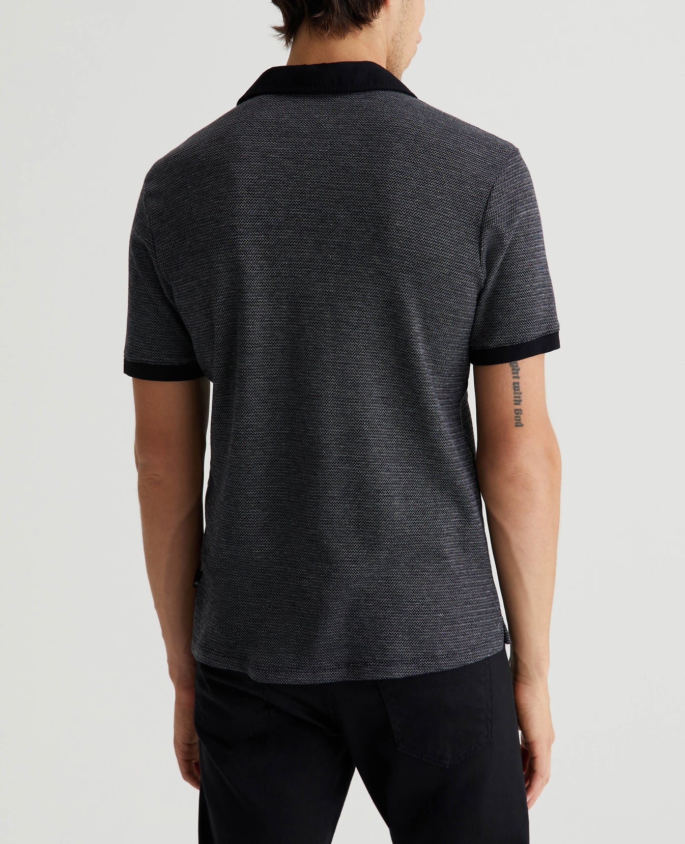 The Bryce Johnny Collar shirt is a classic short-sleeve polo tee with a relaxed neckline and pointed collar. Elevated by our Luxe Heavy Jacquard in black, it's got a delicate chevron pattern accented by solid trim.