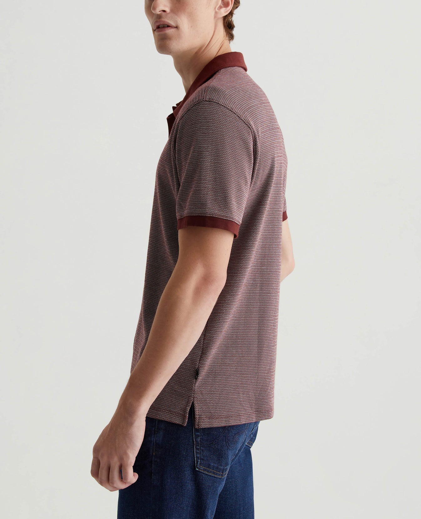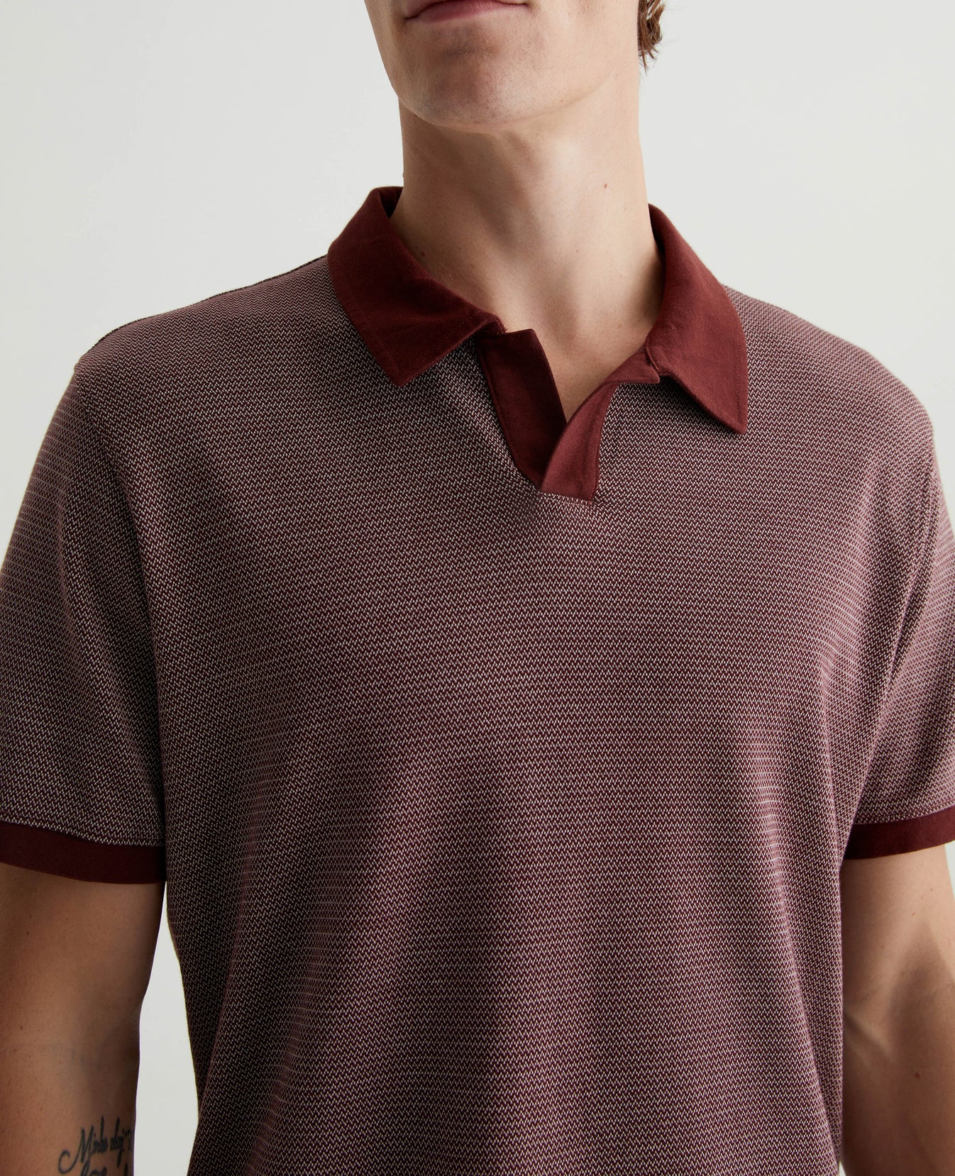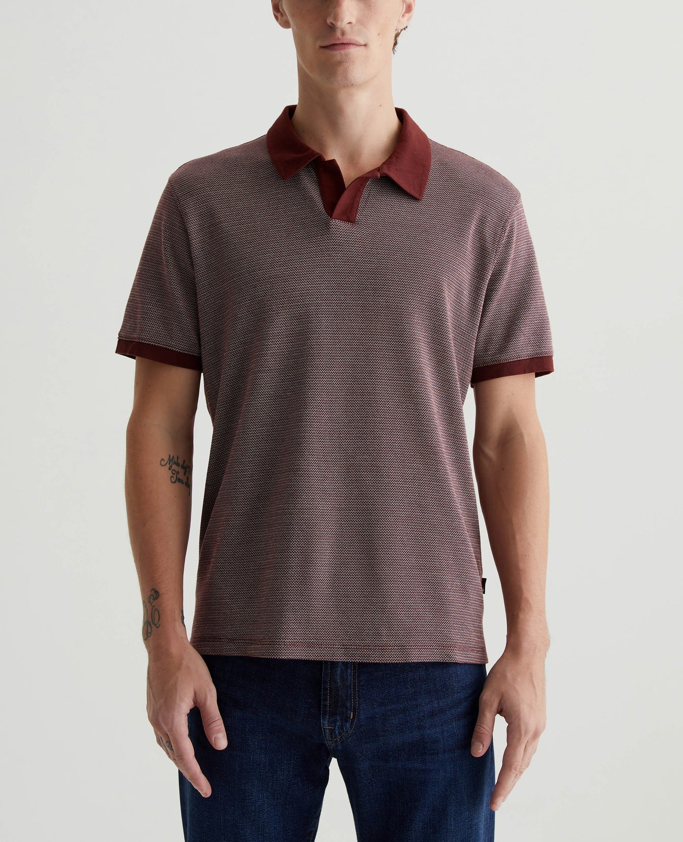 The Bryce Johnny Collar shirt is a classic short-sleeve polo tee with a relaxed neckline and pointed collar. Updated in our Luxe Heavy Jacquard, it's got a delicate chevron pattern accented by solid trim.