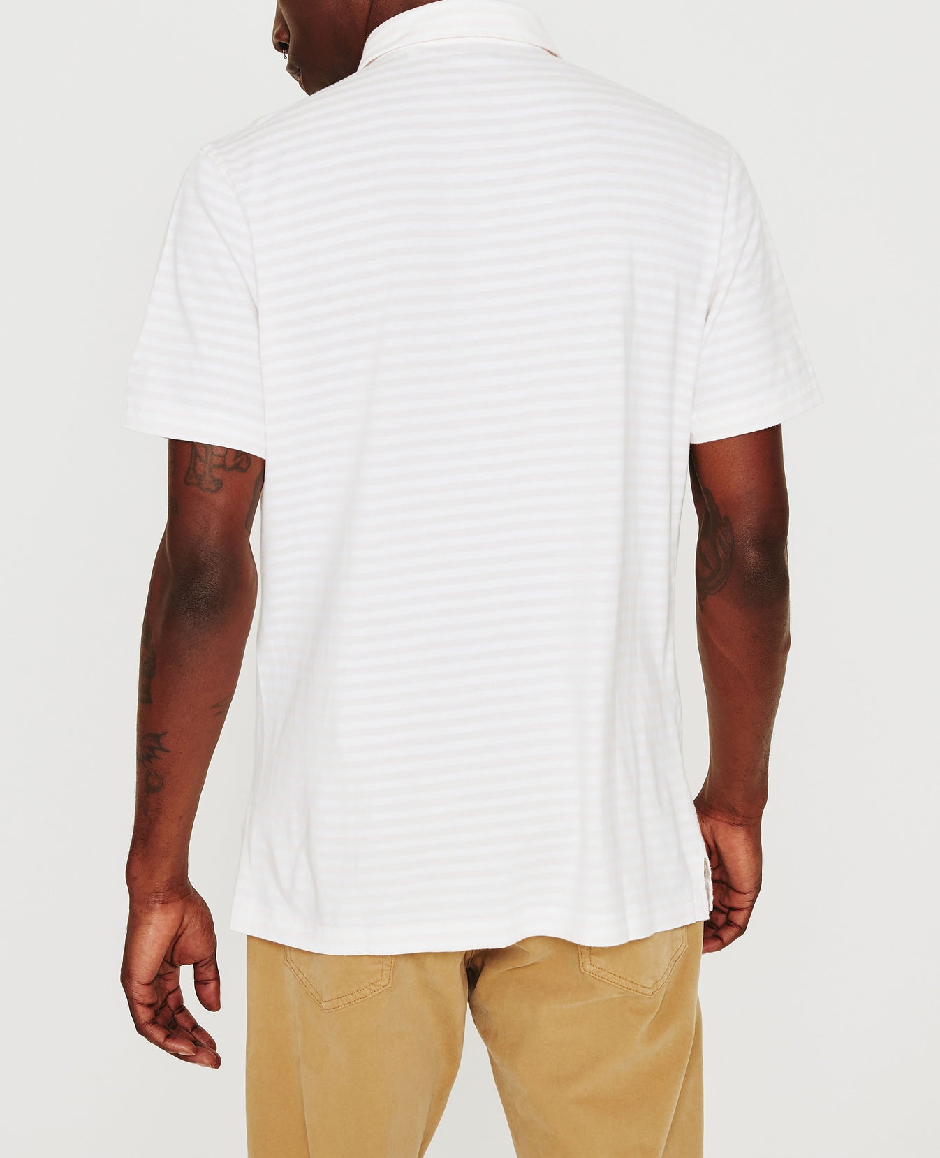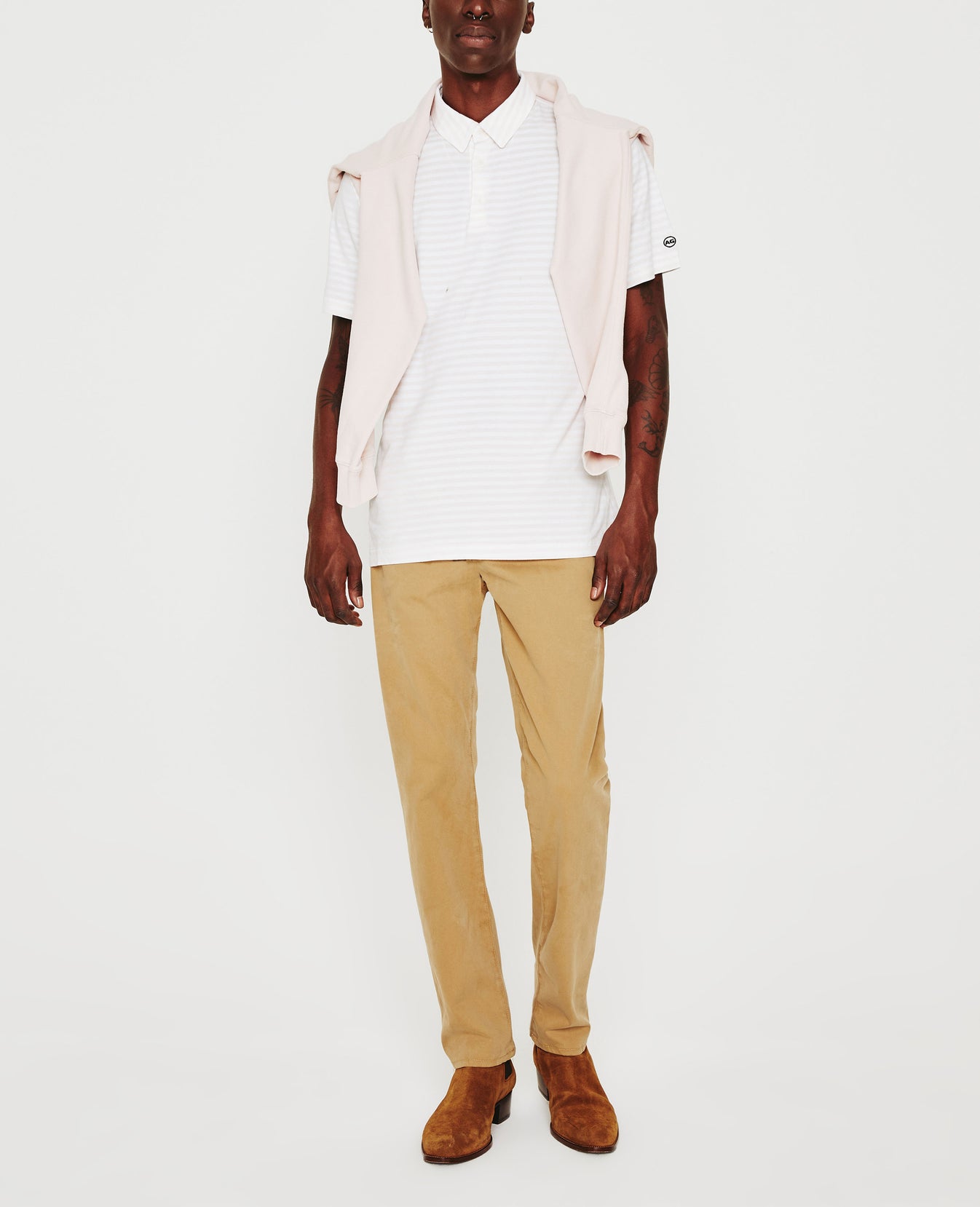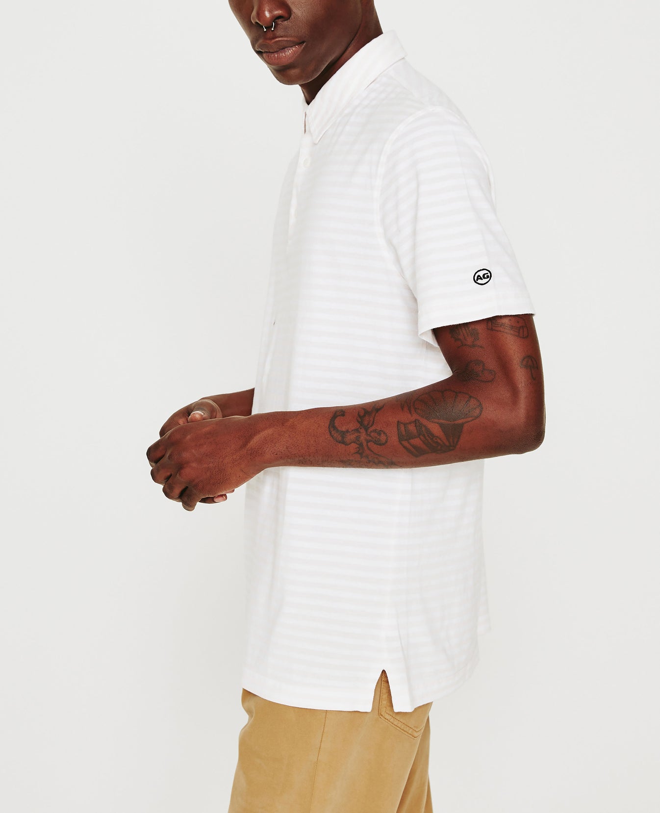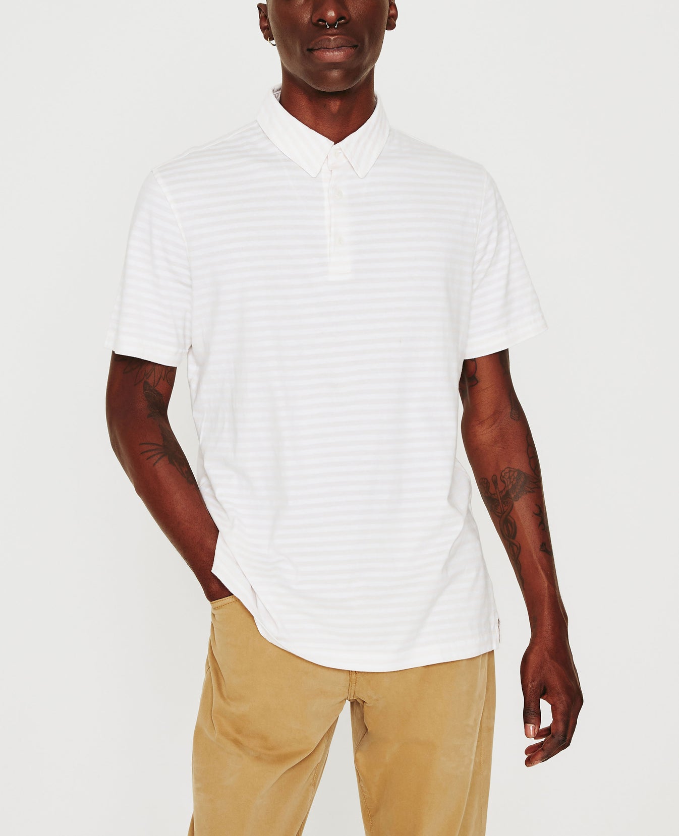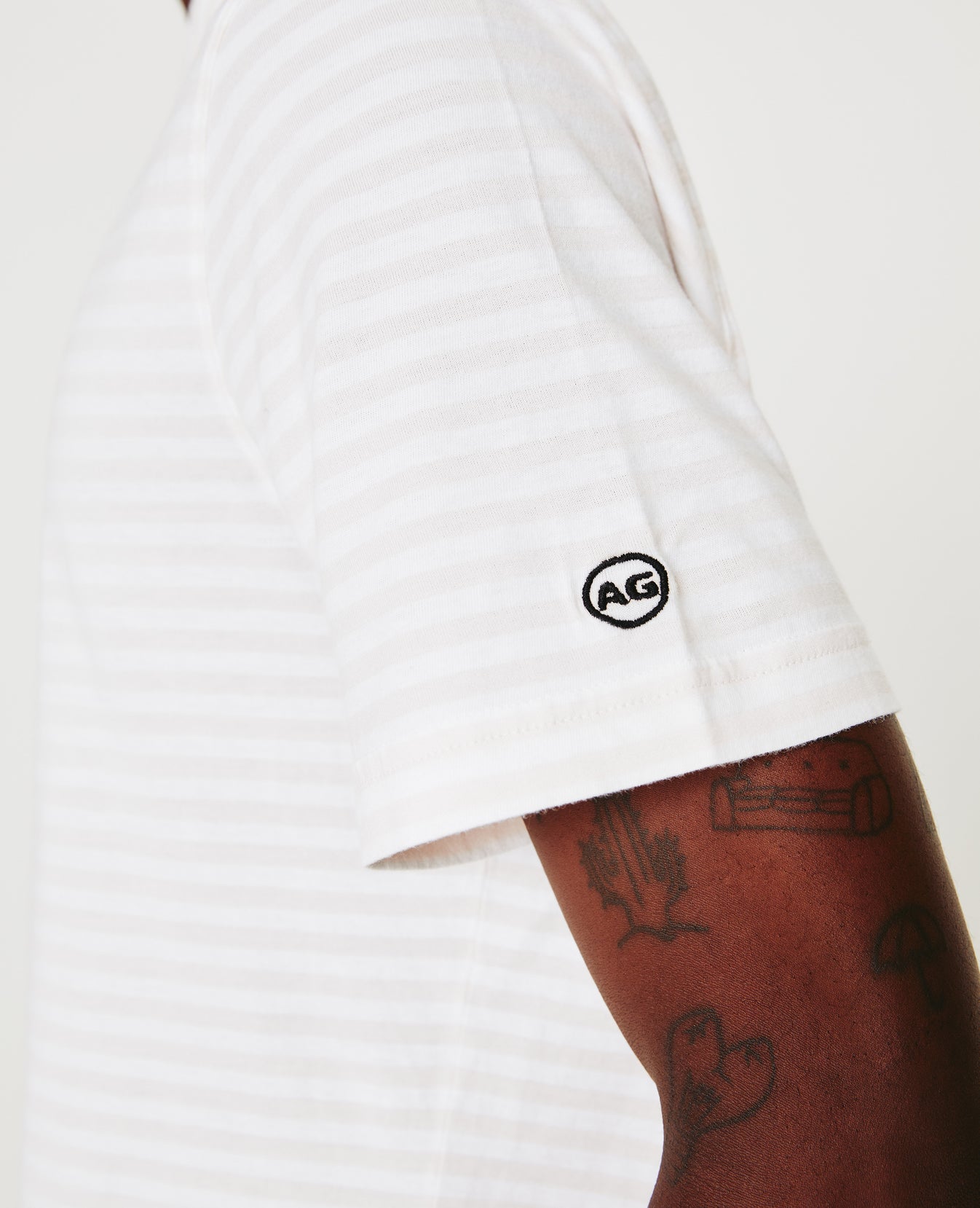 The Bryce Short Sleeve Polo is cut from our Premium Cotton Jersey in white and pale pink stripes. The short-sleeve style has a self-collar for a modern take on your classic polo shirt and side slits to ease the fit. Detailed with the AG logo embroidered at one sleeve.