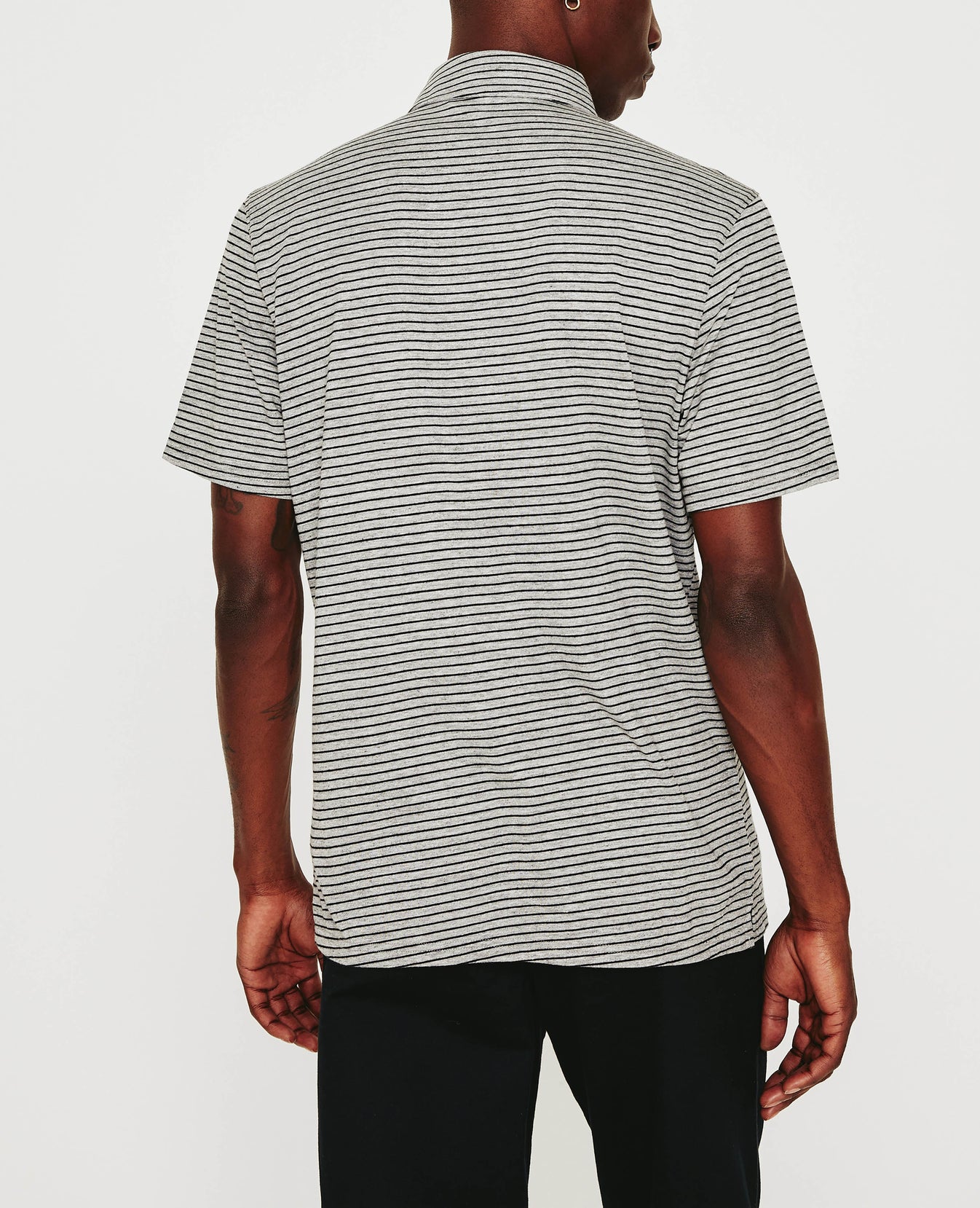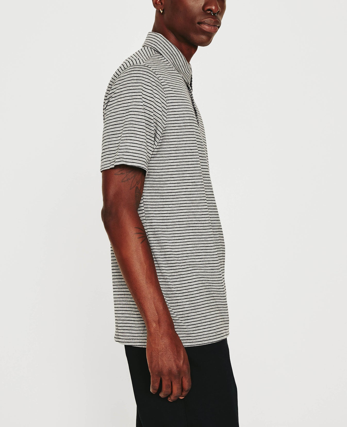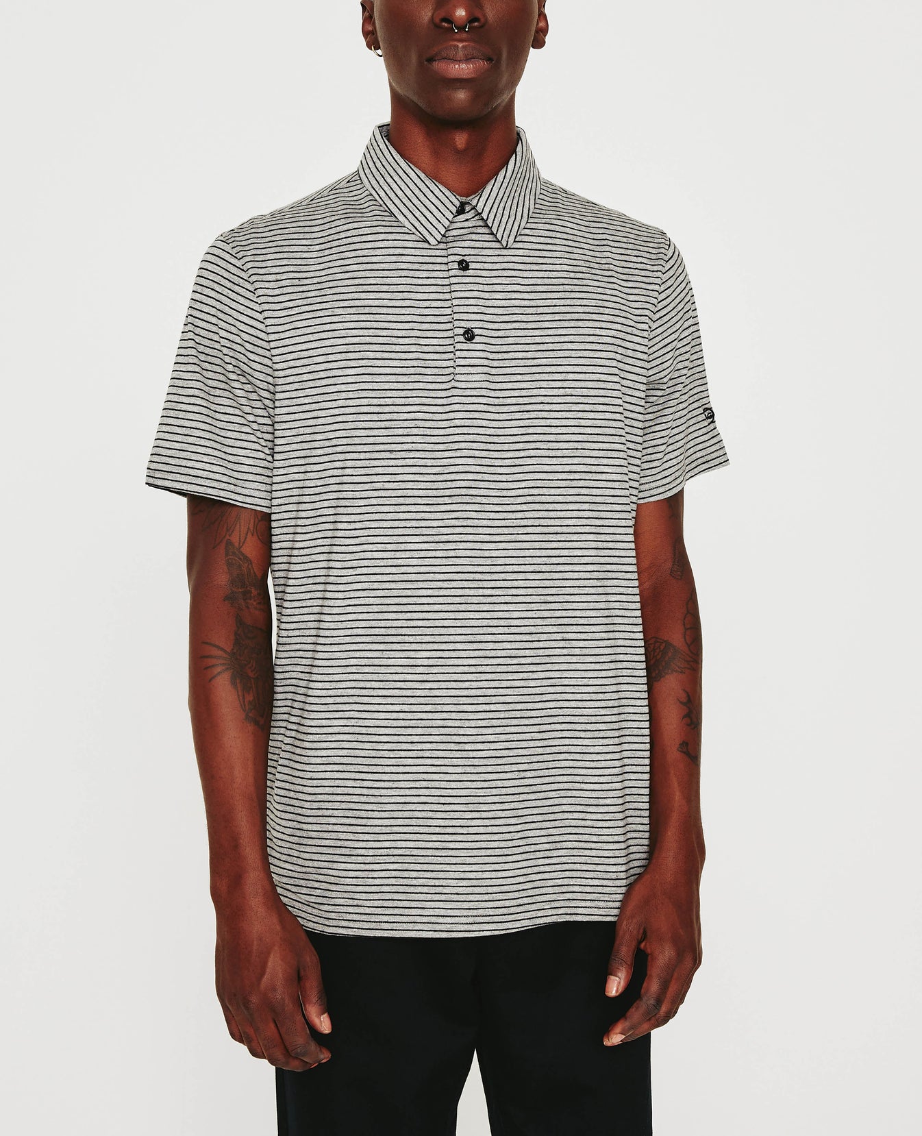 The Bryce Short Sleeve Polo comes in a comfortable cotton-blend knit patterned with black and heather grey stripes. The short-sleeve style has a self-collar for a modern take on your classic polo shirt and side slits to ease the fit. Detailed with the AG logo embroidered at one sleeve.