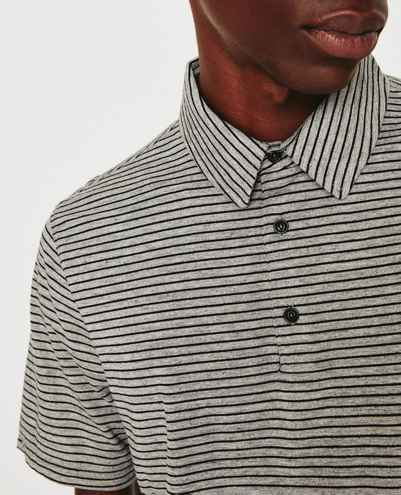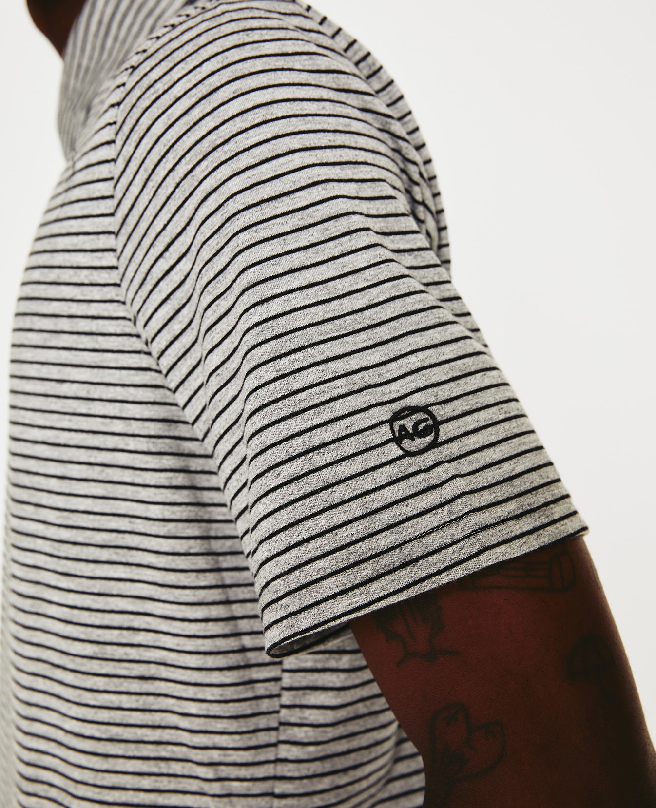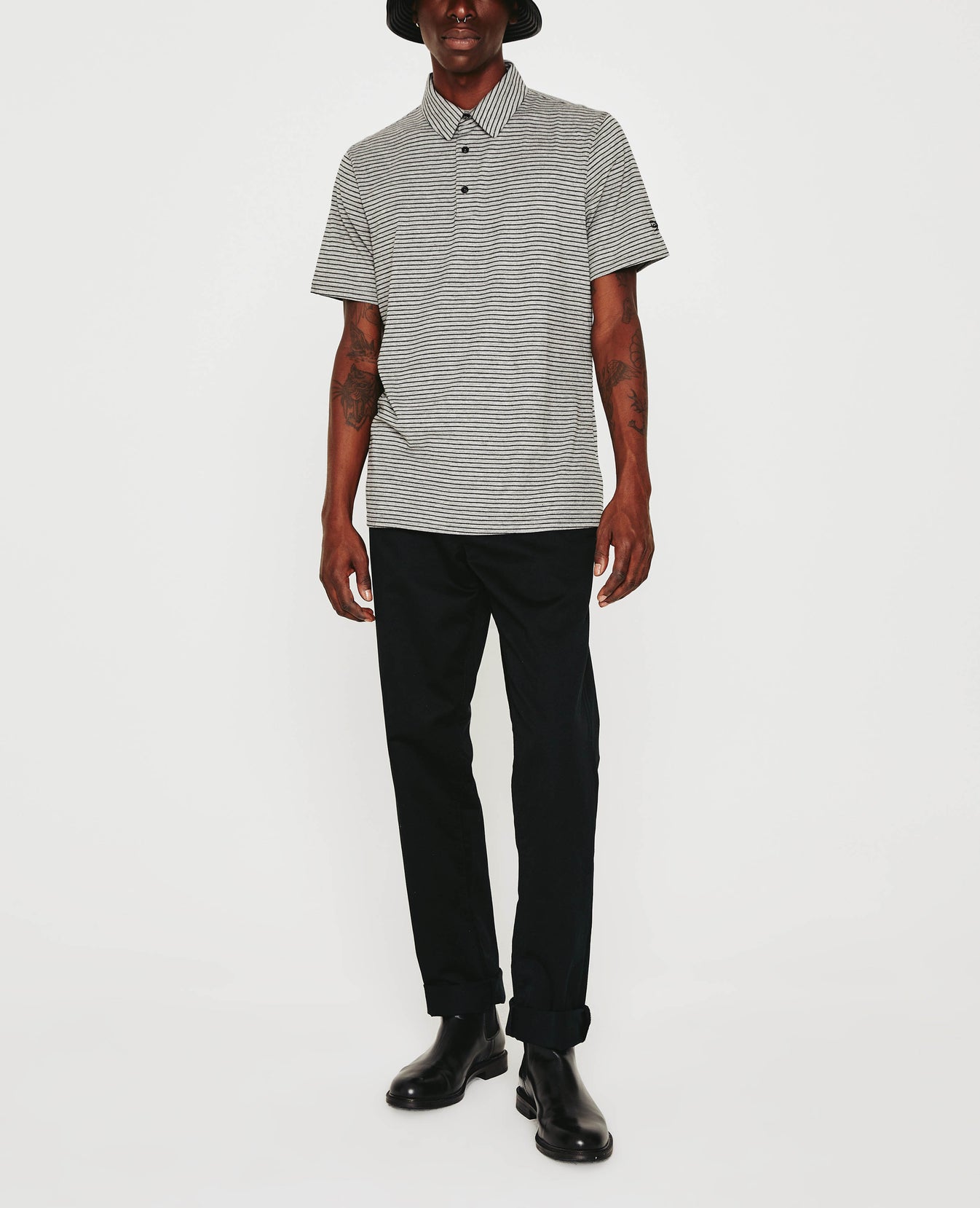The Bryce Short Sleeve Polo comes in a comfortable cotton-blend knit patterned with black and heather grey stripes. The short-sleeve style has a self-collar for a modern take on your classic polo shirt and side slits to ease the fit. Detailed with the AG logo embroidered at one sleeve.