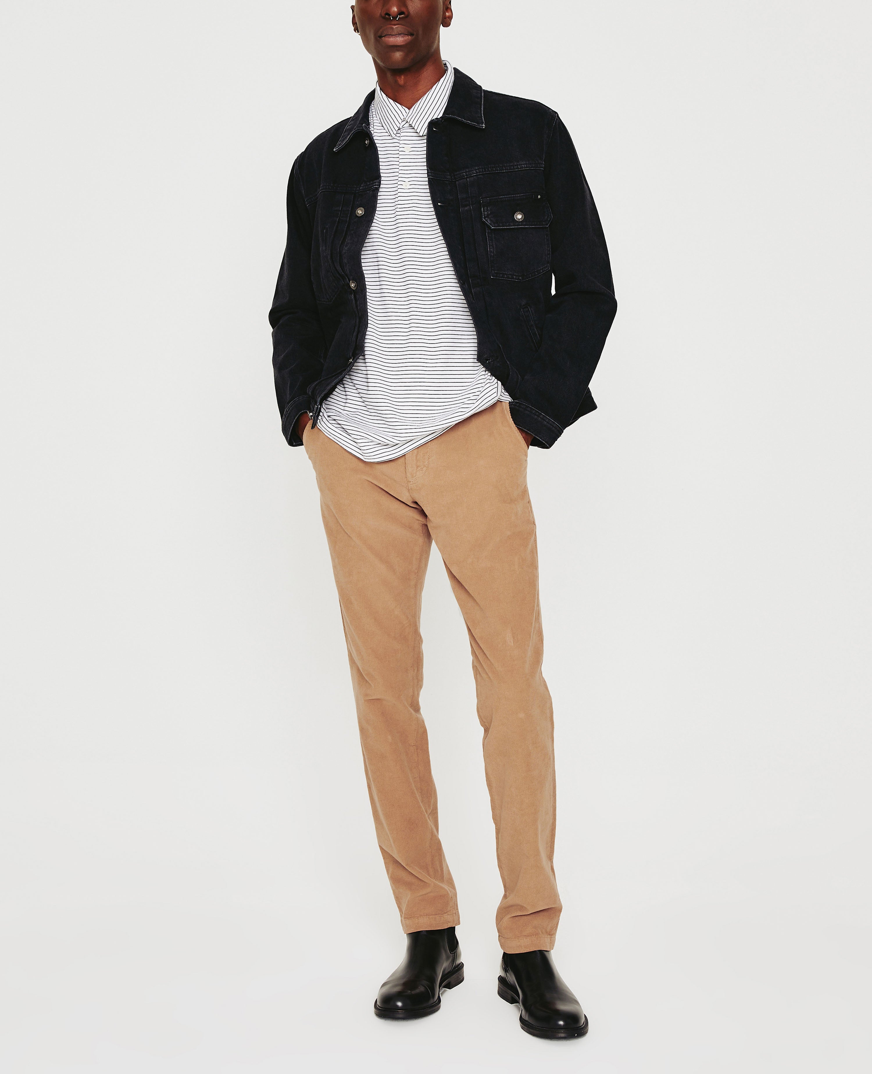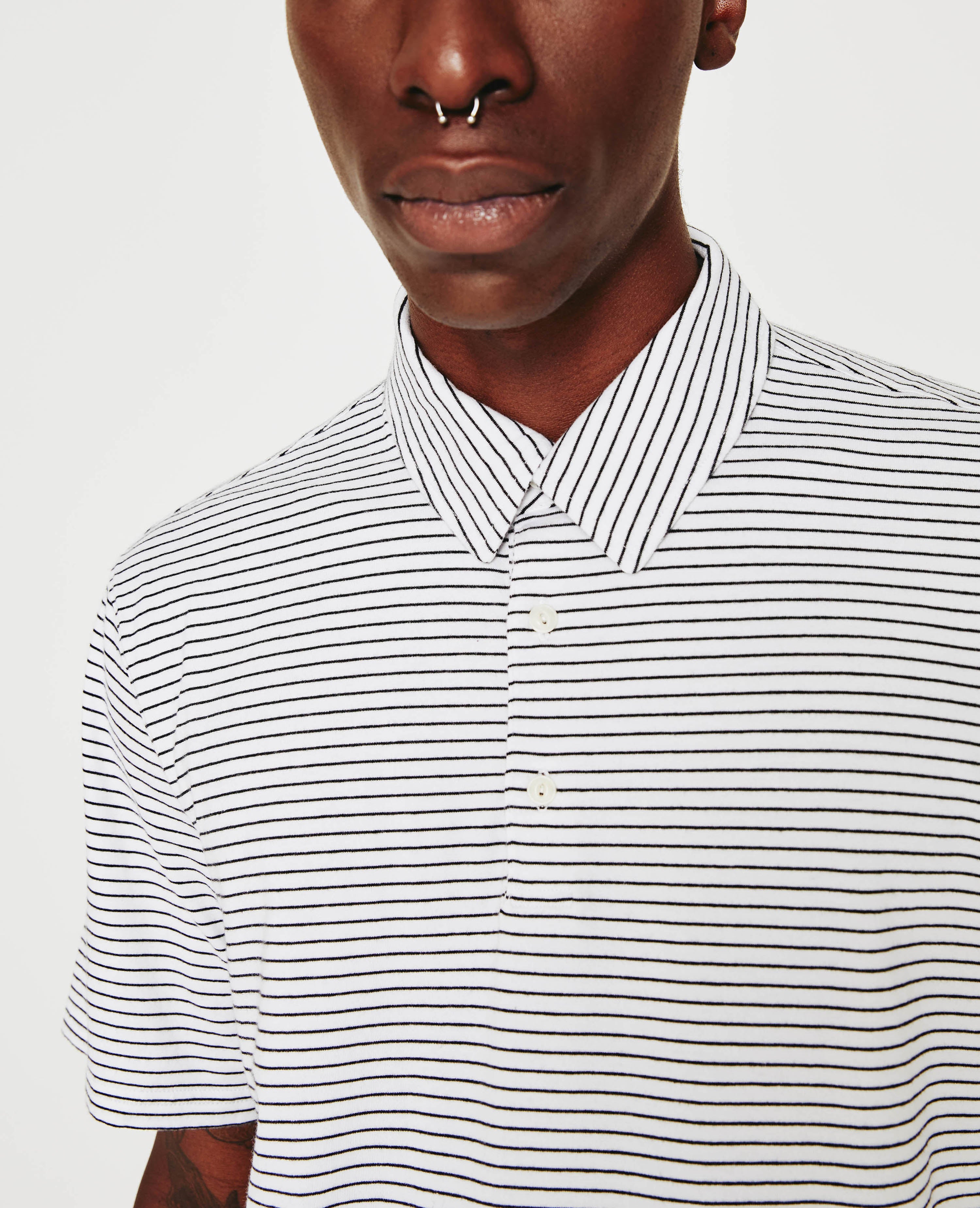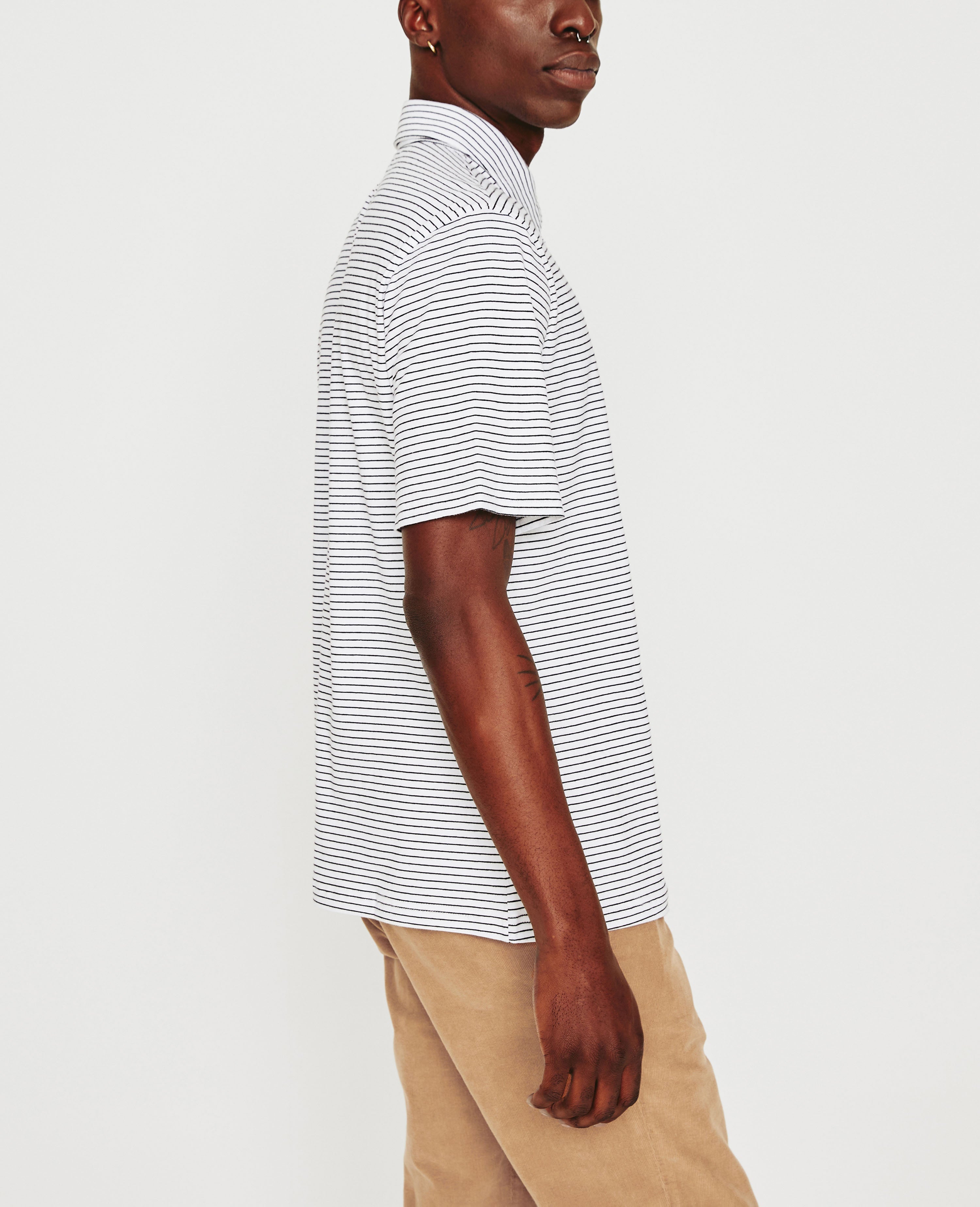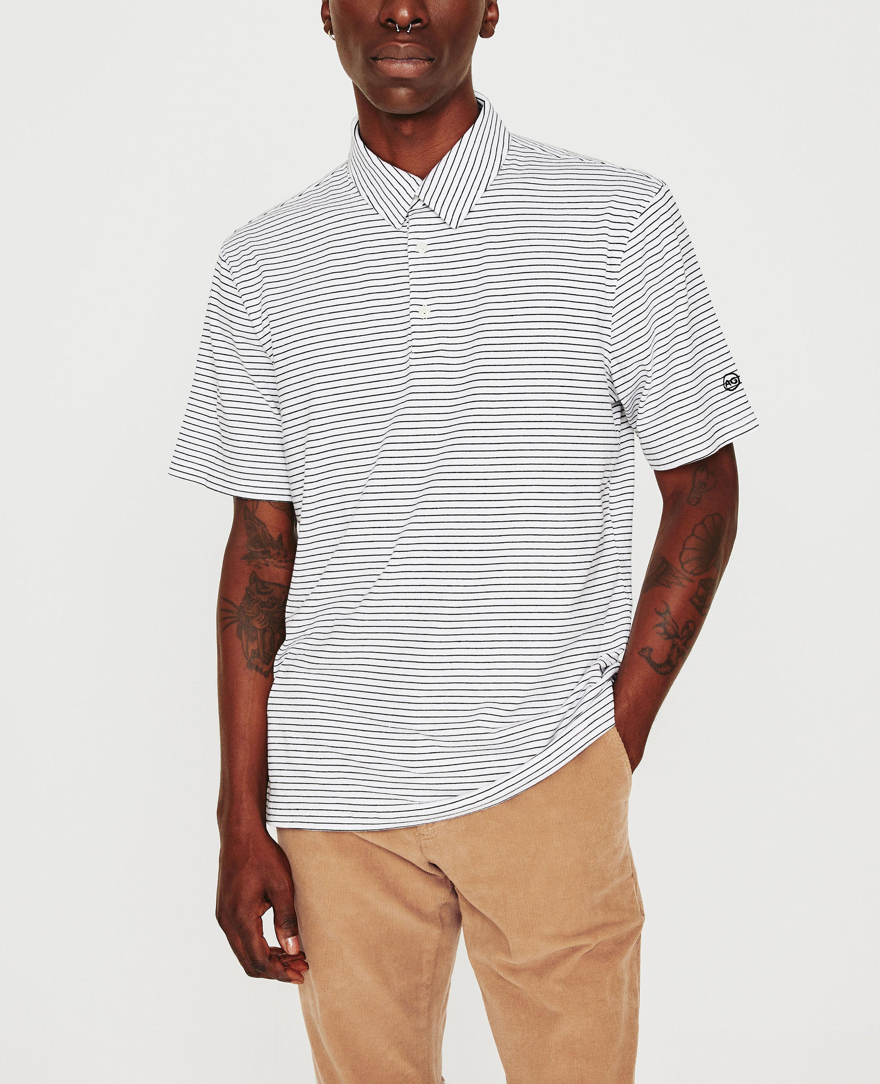 The Bryce Short Sleeve Polo comes in a comfortable cotton-blend knit patterned with slim black and white stripes. The short-sleeve style has a self-collar for a modern take on your classic polo shirt and side slits to ease the fit. Detailed with the AG logo embroidered at one sleeve.