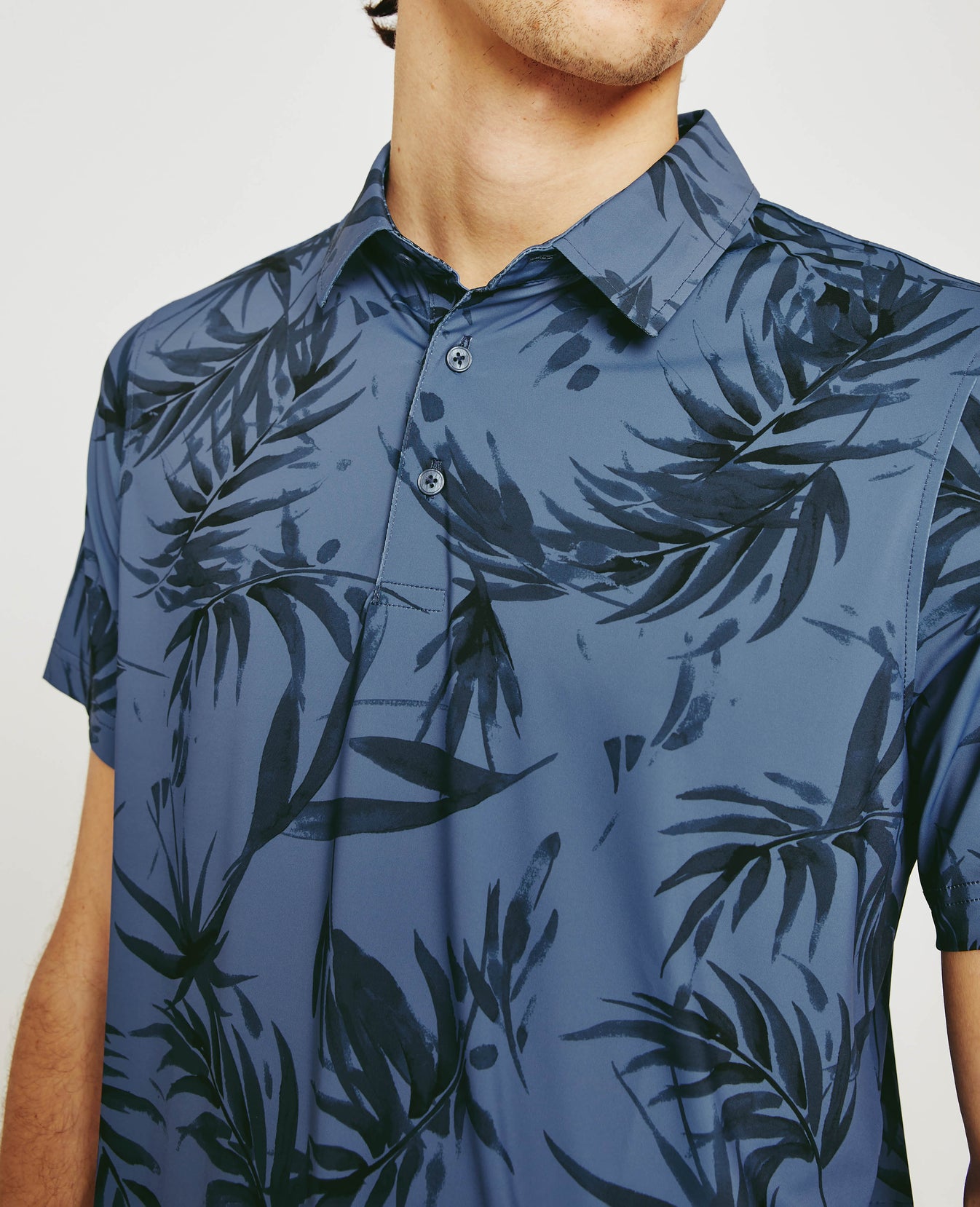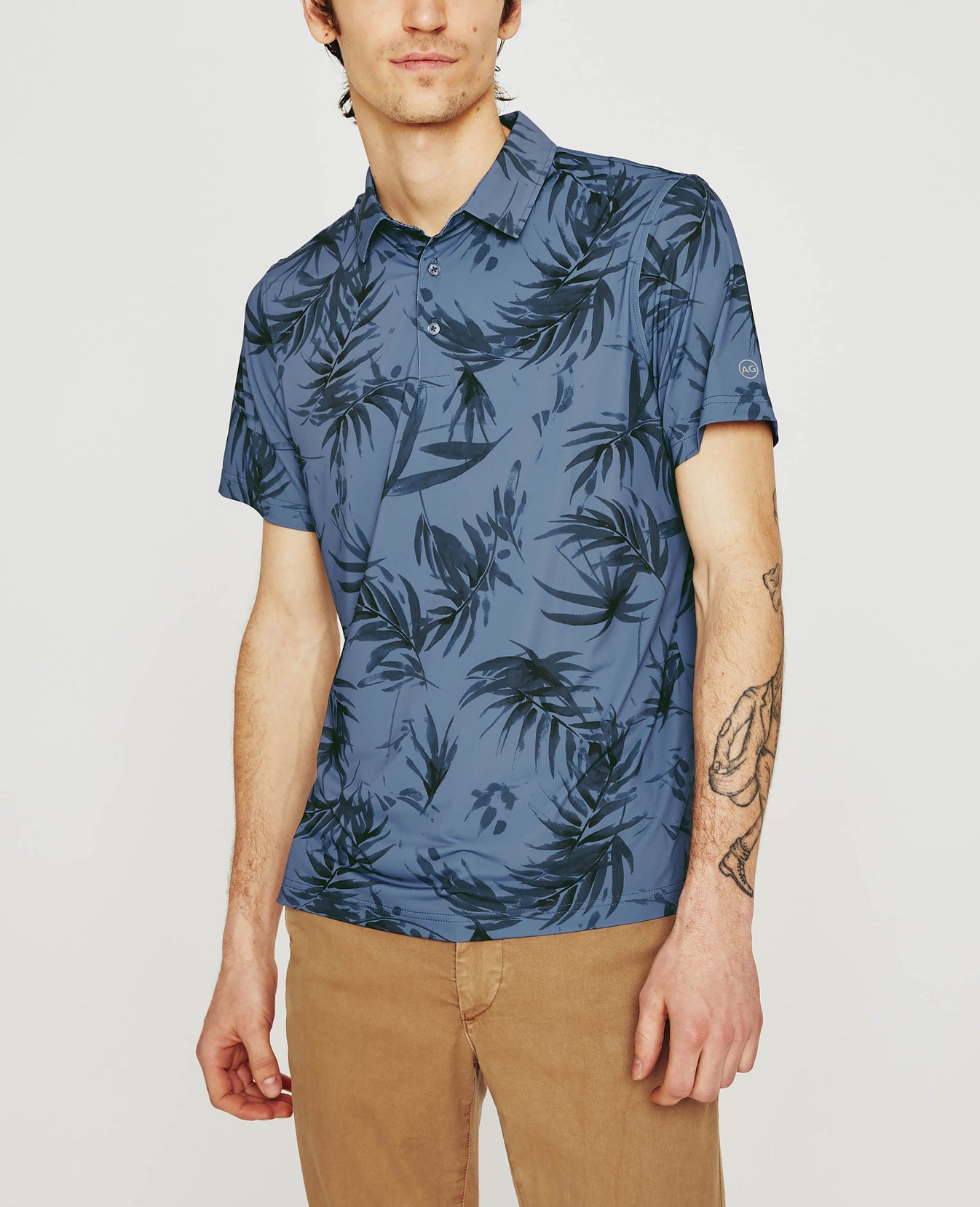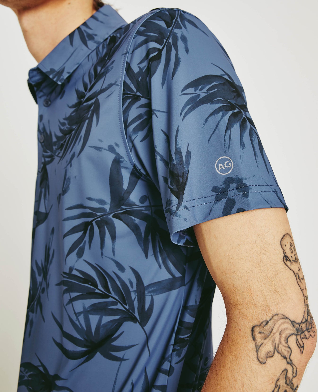 The Bryce Short Sleeve Polo is made for style and performance in moisture-wicking sport fabric. Featuring a tropical print of tonal indigo shades, it's blended with stretch and moves sweat away from the skin to keep you cool, dry, and comfortable. A self-collar and button placket complete the look. Embroidered AG logo at left sleeve.