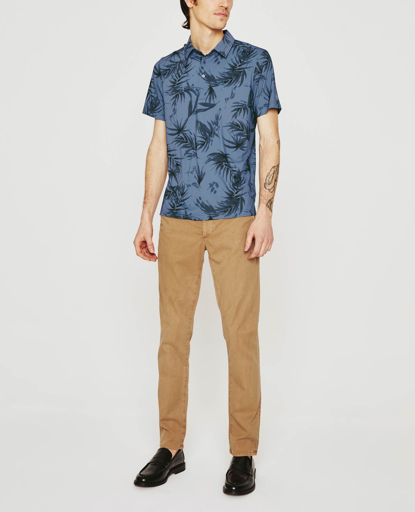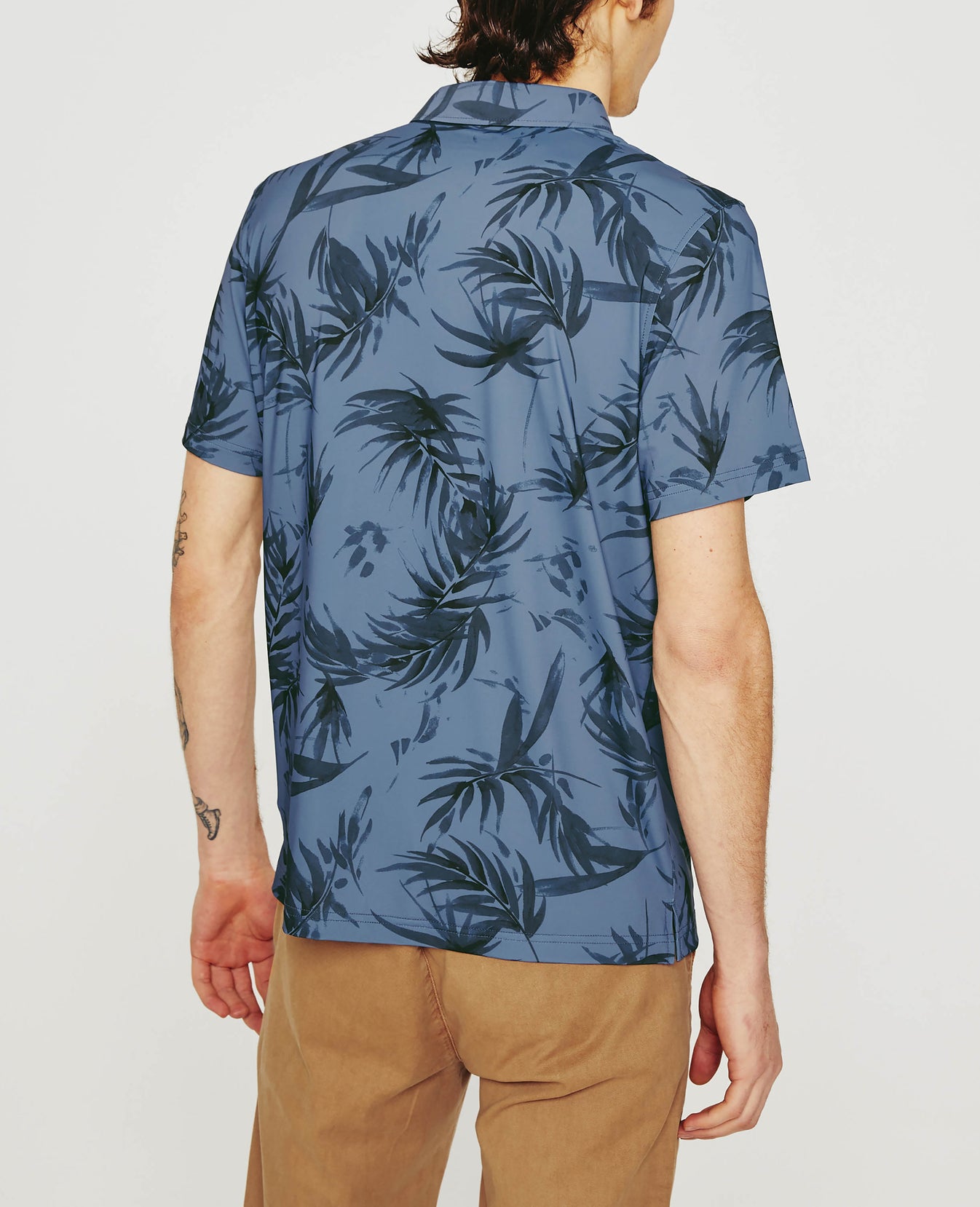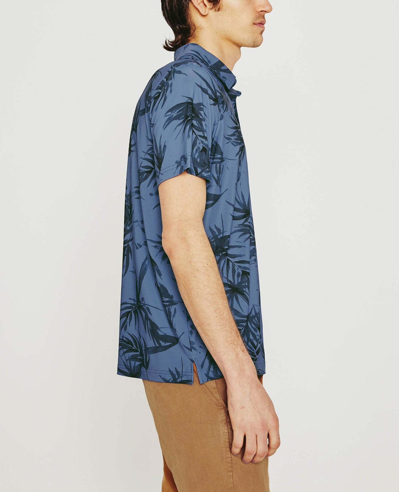 The Bryce Short Sleeve Polo is made for style and performance in moisture-wicking sport fabric. Featuring a tropical print of tonal indigo shades, it's blended with stretch and moves sweat away from the skin to keep you cool, dry, and comfortable. A self-collar and button placket complete the look. Embroidered AG logo at left sleeve.
