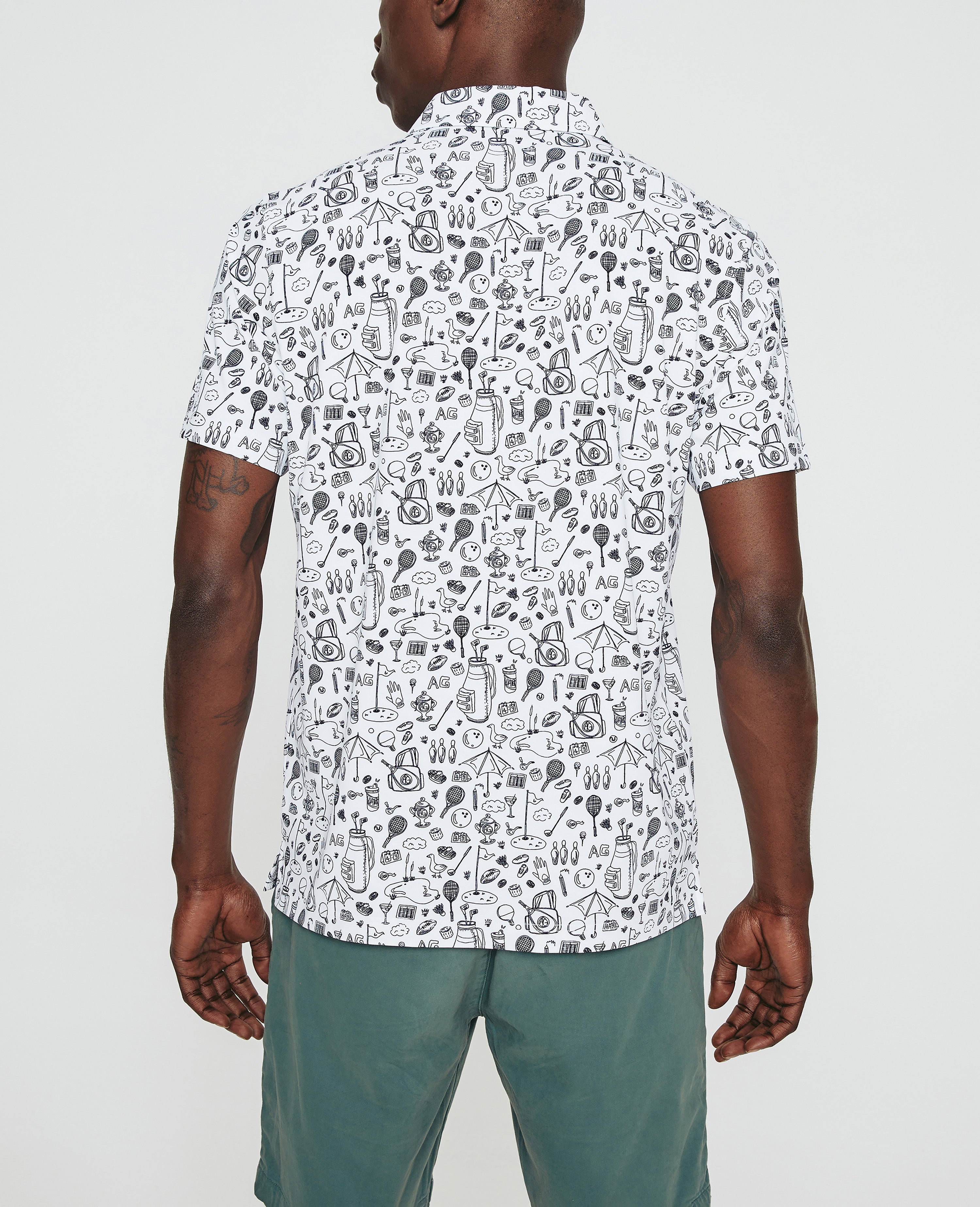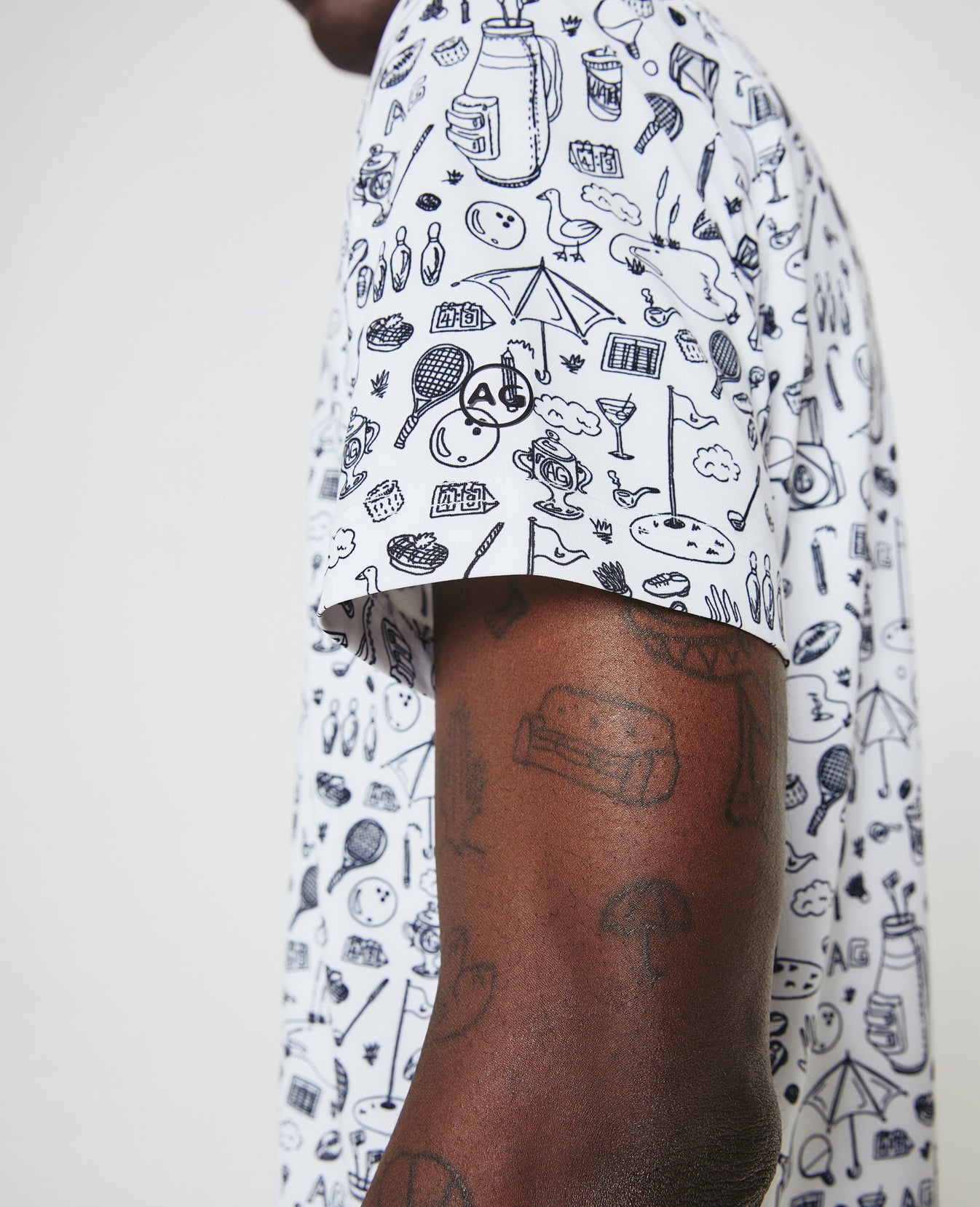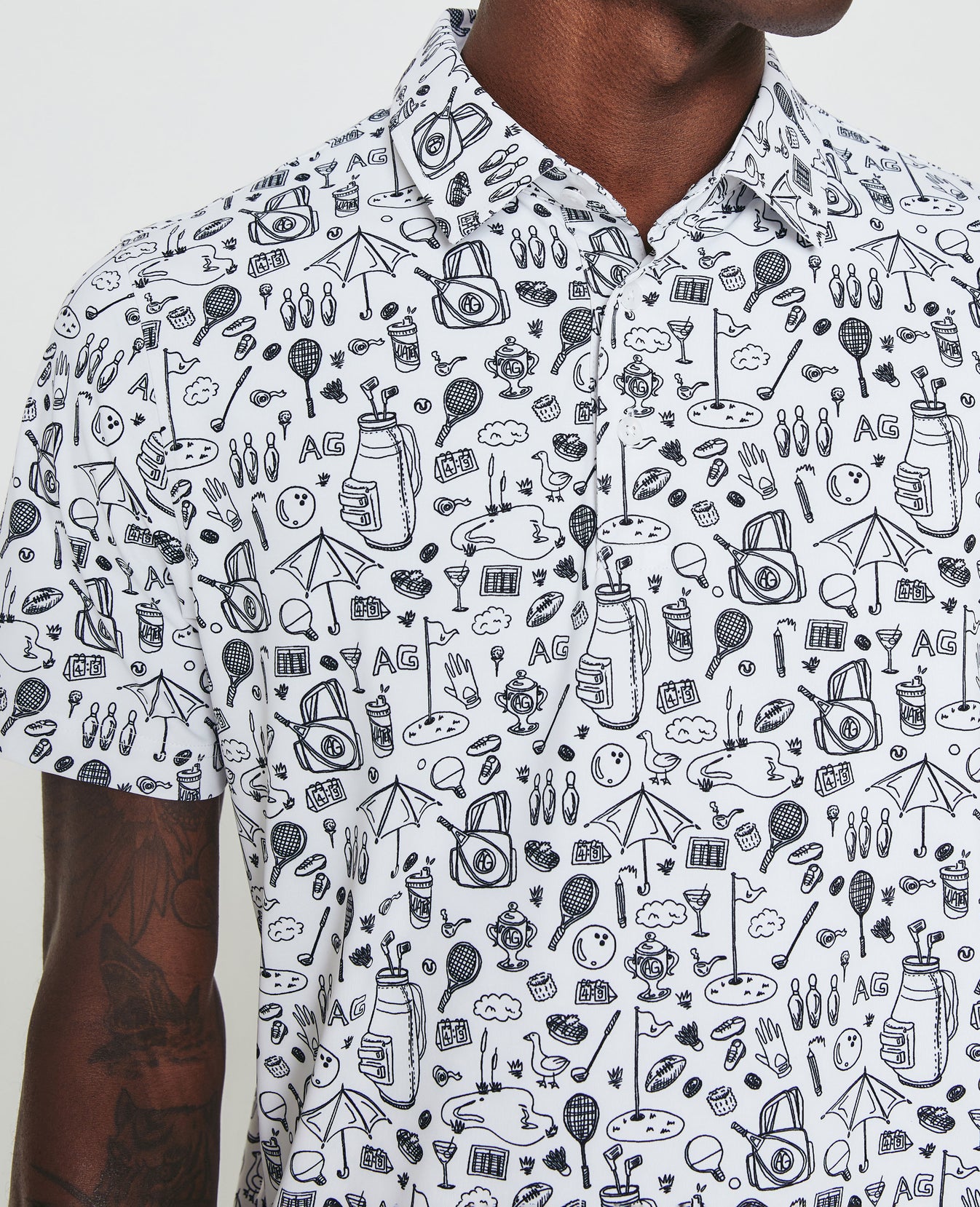 A sporty hand-drawn doodle print brings a lighthearted mood to the Bryce Short Sleeve Polo shirt in white. If you look a little closer, you'll notice AG lettering sketched into the design. The style is cut for a classic fit in a stretch-blend performance knit to keep you cool, dry, and comfortable, whether you're hitting the links or enjoying post-round cocktails. Complete with a self-collar, button placket, and the AG logo embroidered at one sleeve.