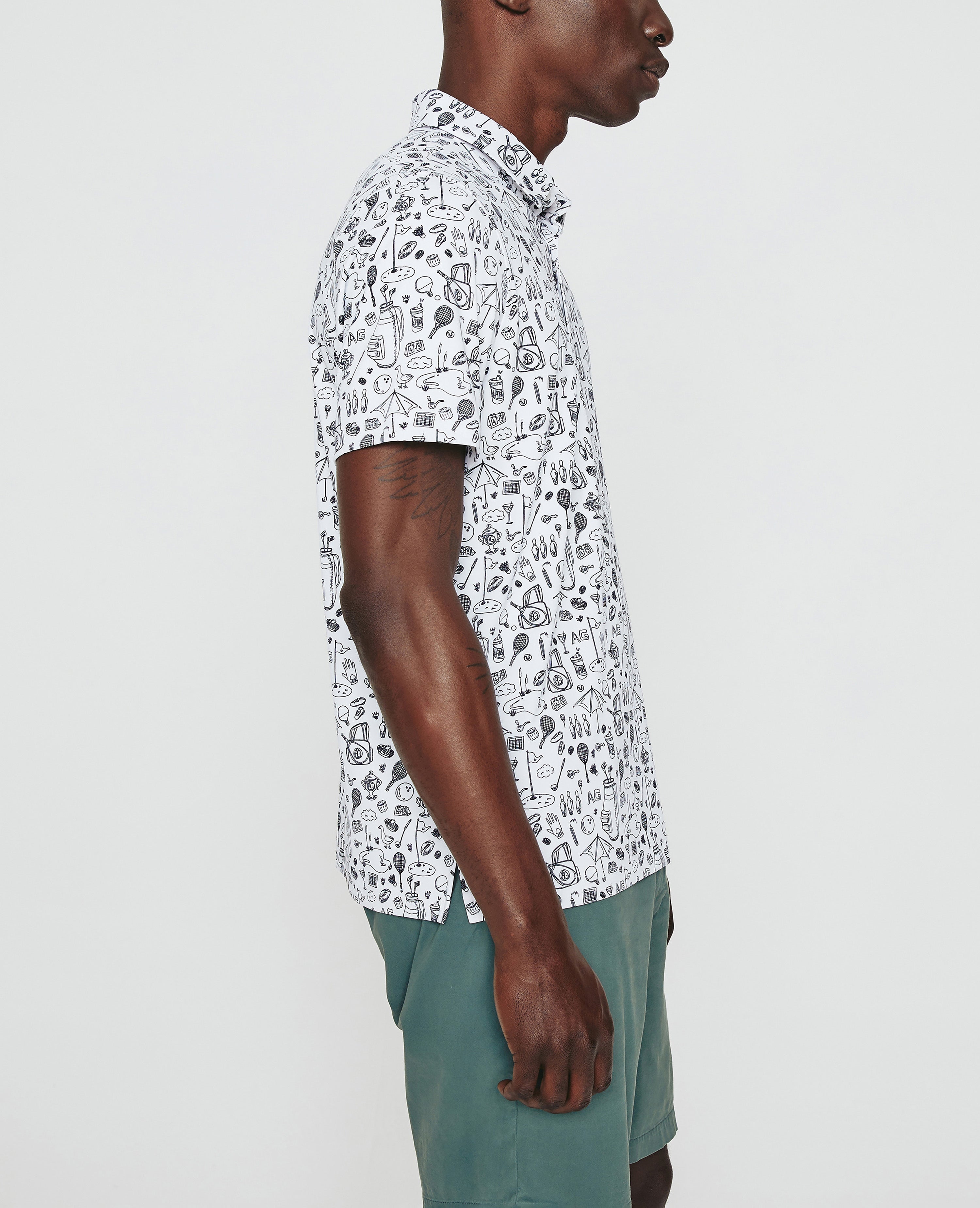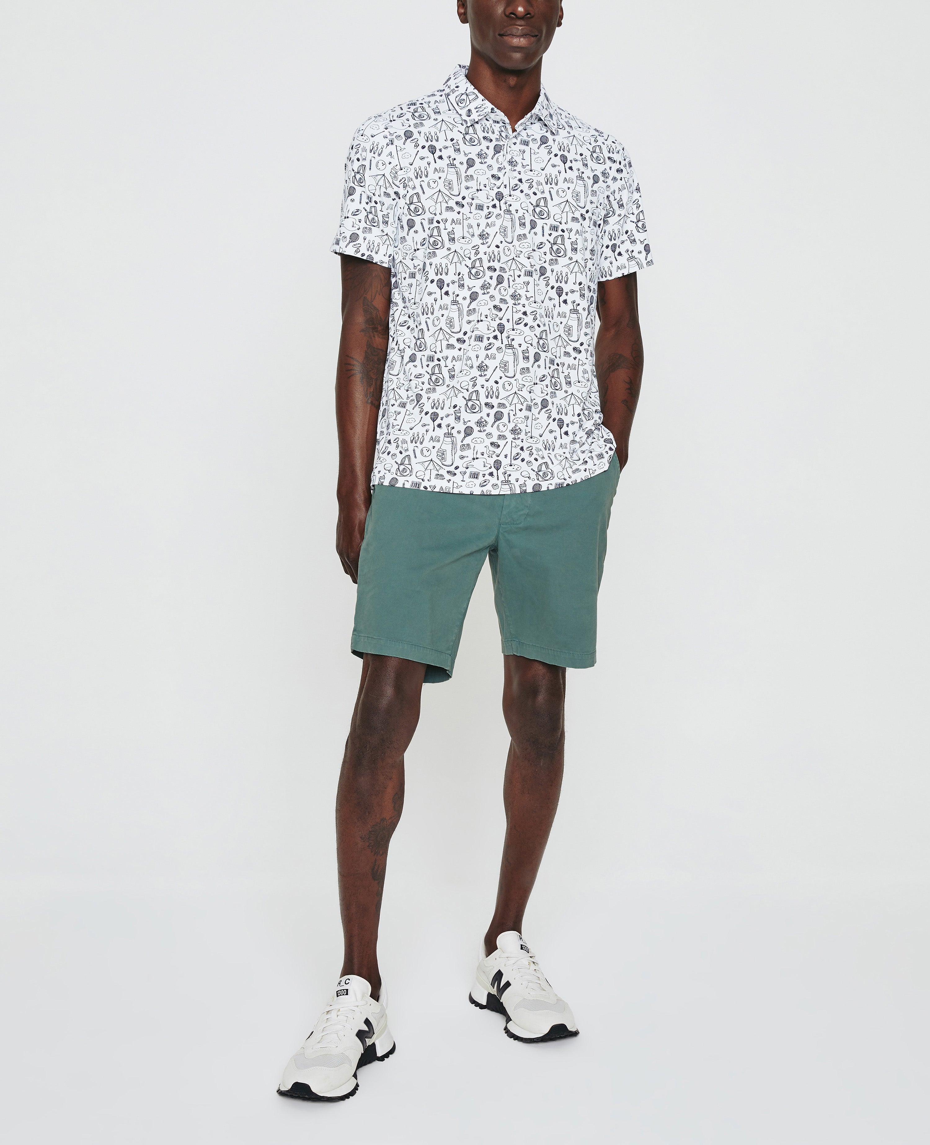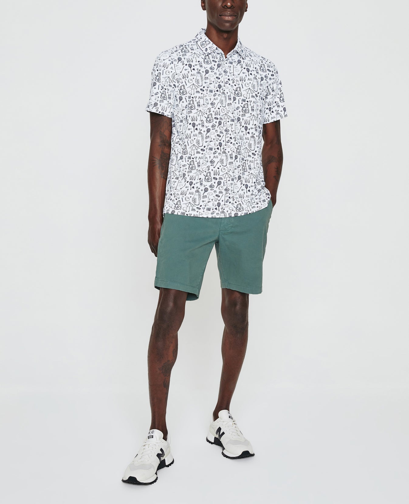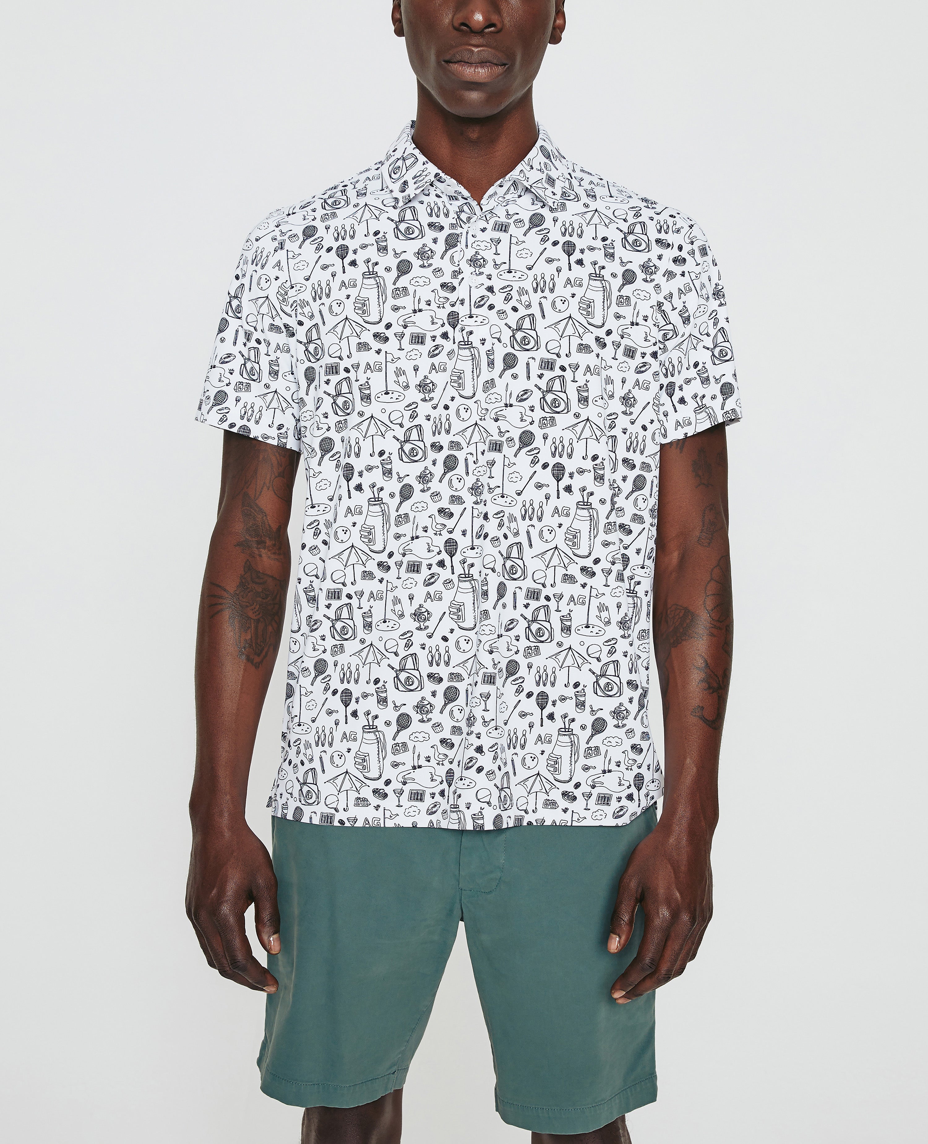 A sporty hand-drawn doodle print brings a lighthearted mood to the Bryce Short Sleeve Polo shirt in white. If you look a little closer, you'll notice AG lettering sketched into the design. The style is cut for a classic fit in a stretch-blend performance knit to keep you cool, dry, and comfortable, whether you're hitting the links or enjoying post-round cocktails. Complete with a self-collar, button placket, and the AG logo embroidered at one sleeve.