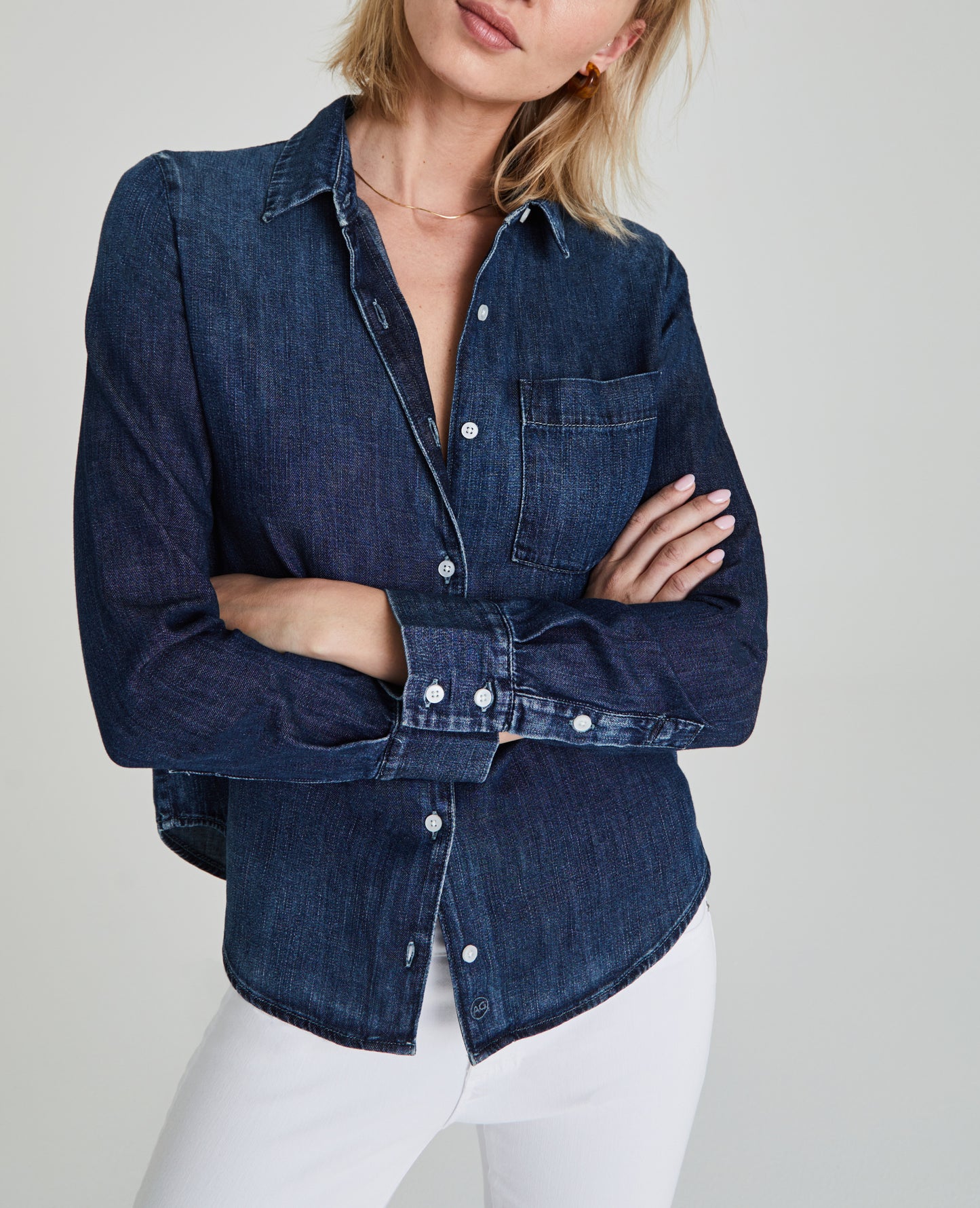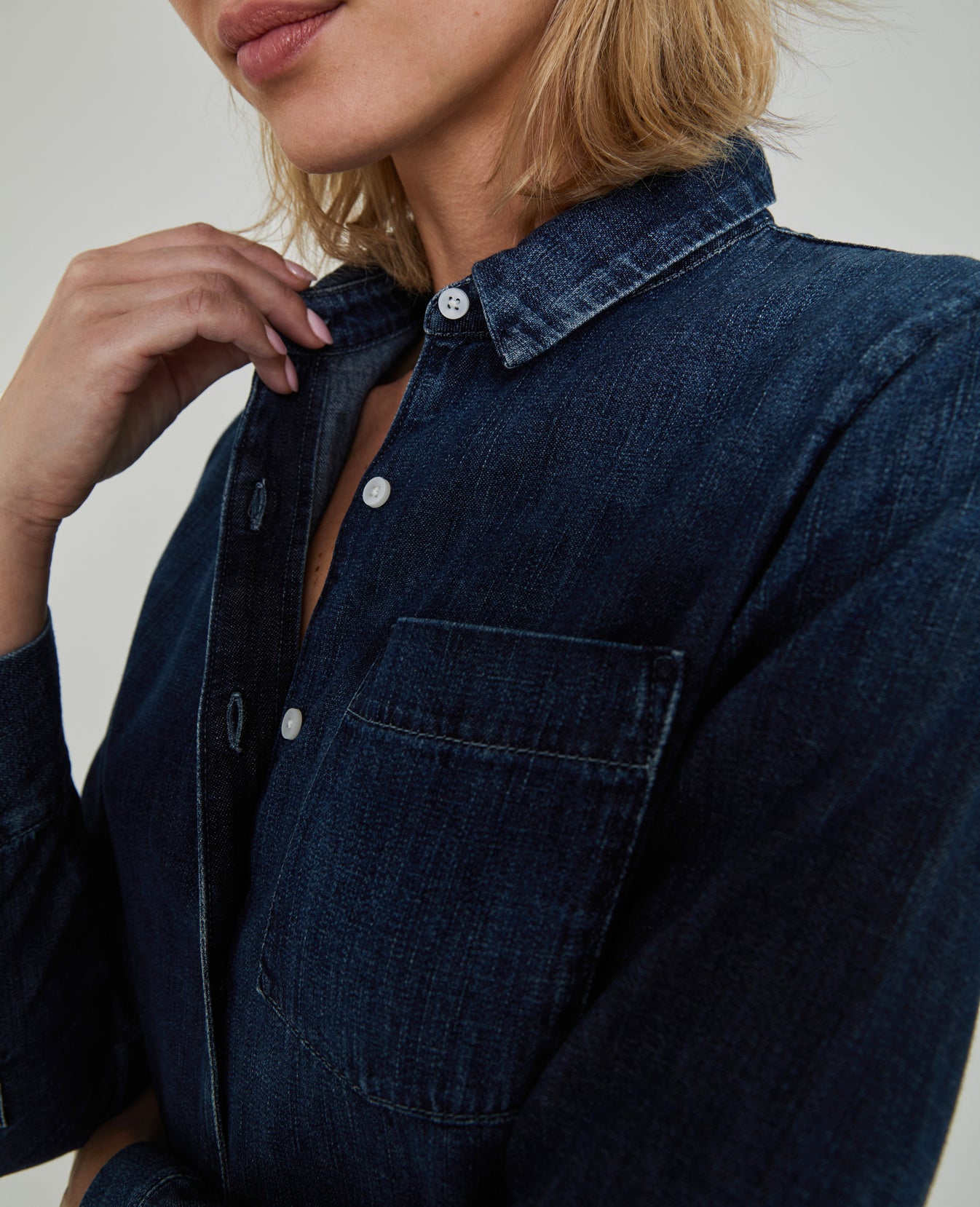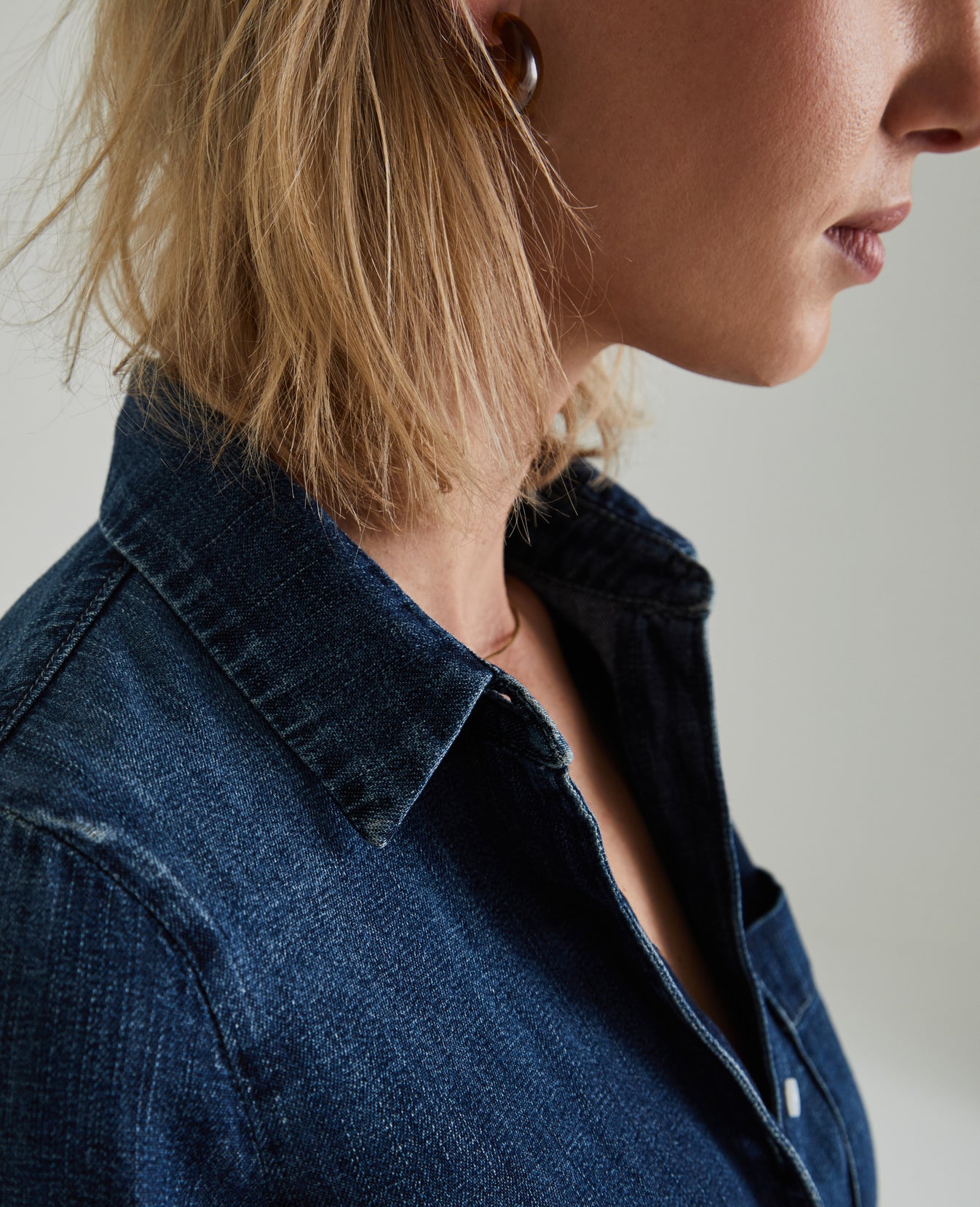 The Cade Shirt for women features a faded indigo denim wash with subtle vintage-inspired fading, classic button-down construction, dolphin hem, cuffed sleeves, and a slim fit. This women's button-up shirt is designed in non-stretch crosshatch denim with lightweight fabrication and finished with an authentic slub character.
