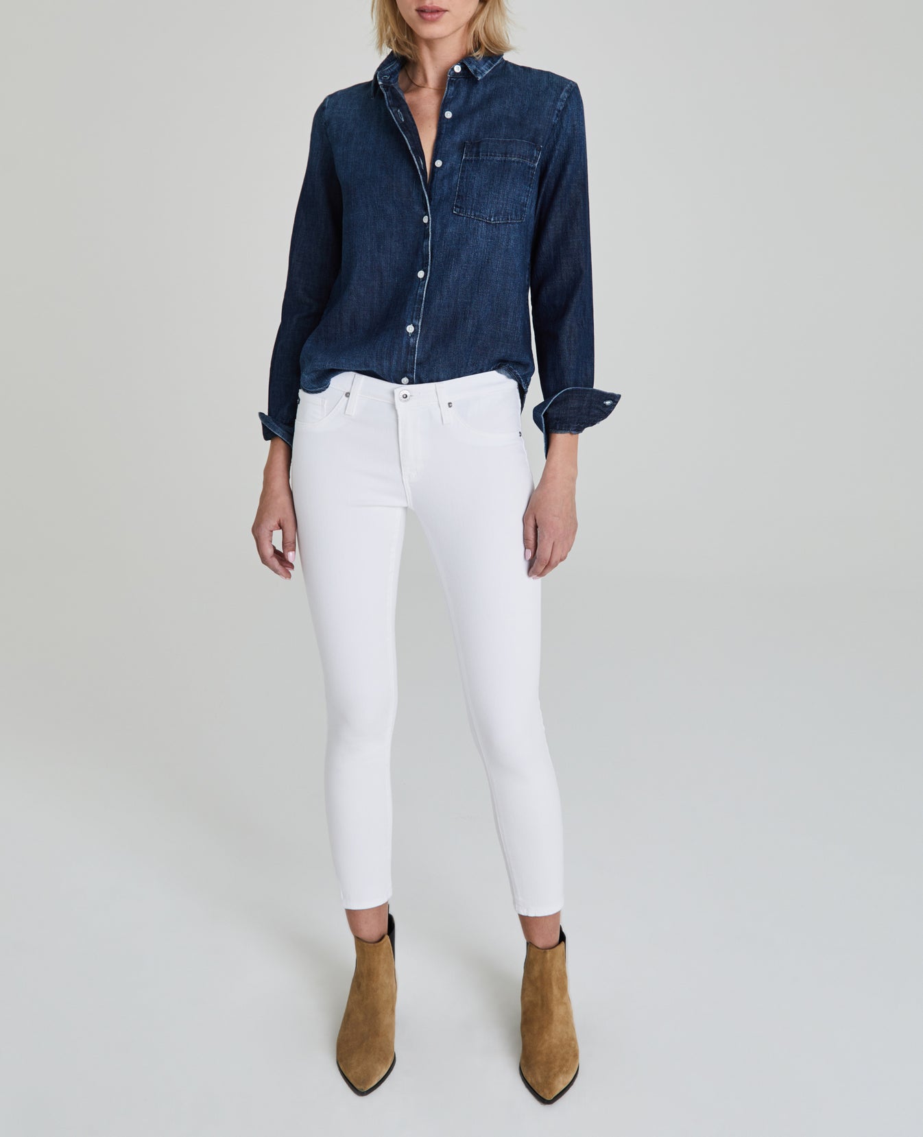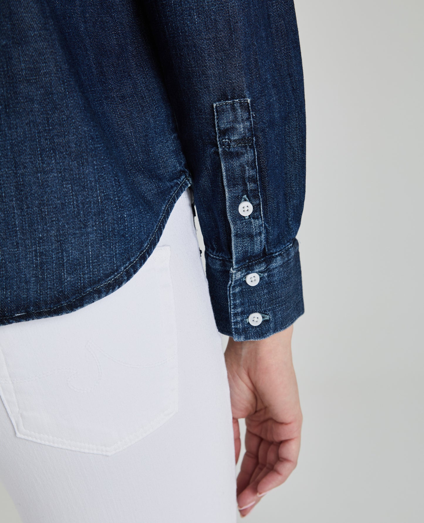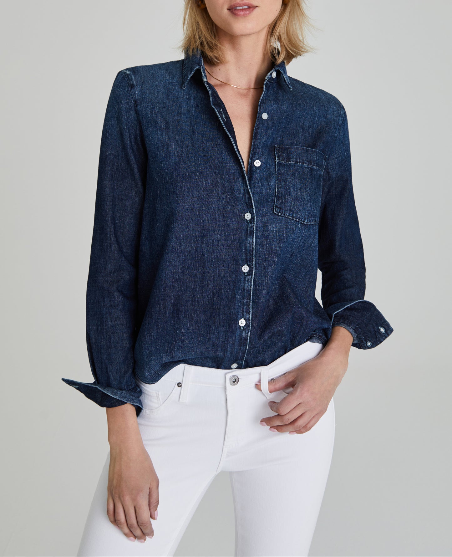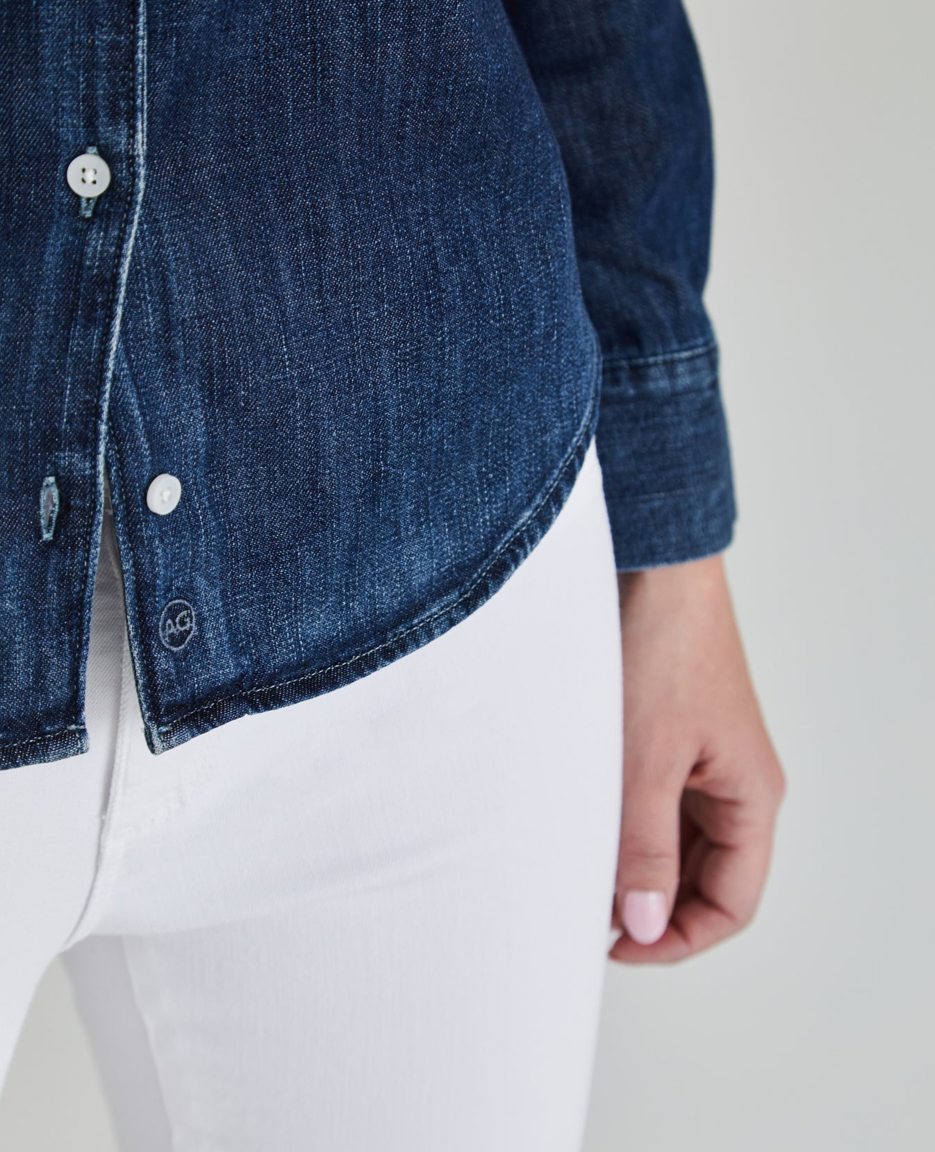 The Cade Shirt for women features a faded indigo denim wash with subtle vintage-inspired fading, classic button-down construction, dolphin hem, cuffed sleeves, and a slim fit. This women's button-up shirt is designed in non-stretch crosshatch denim with lightweight fabrication and finished with an authentic slub character.