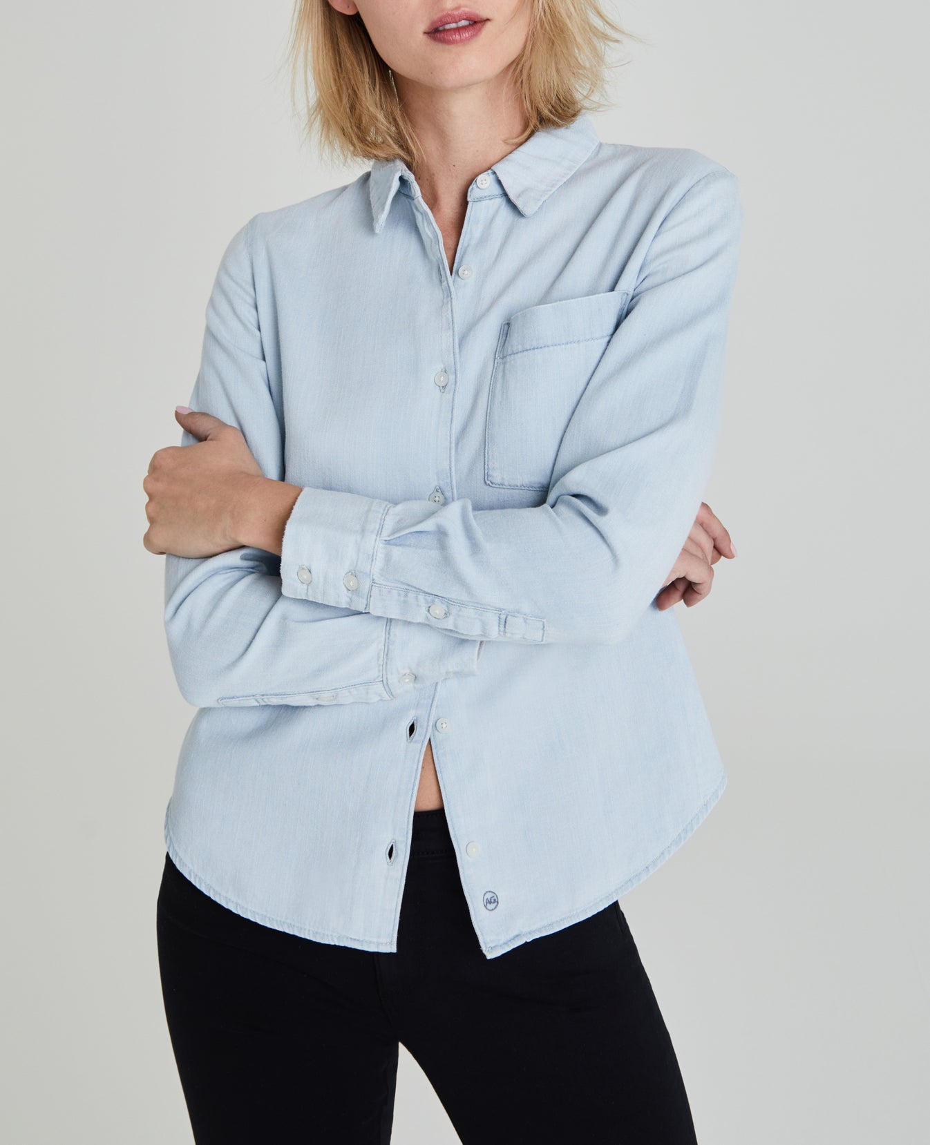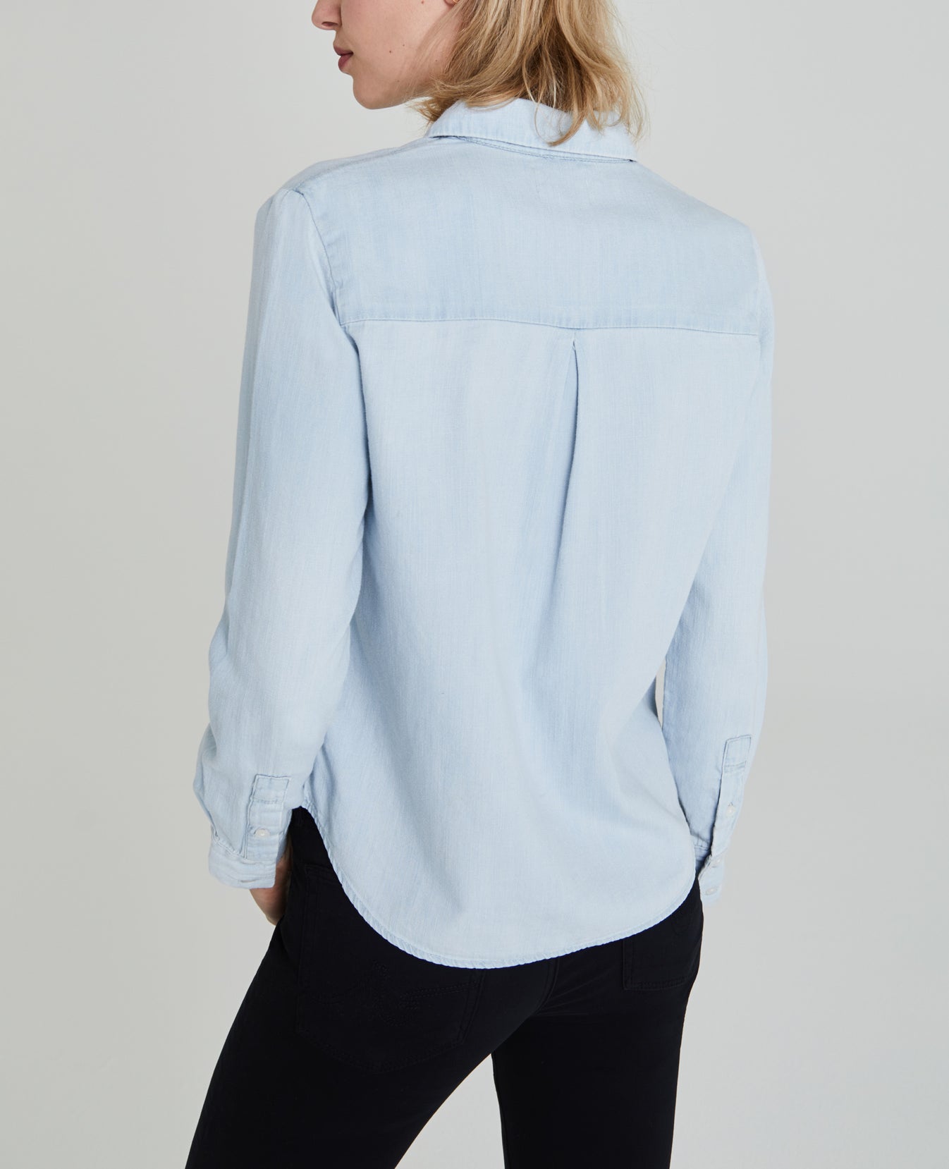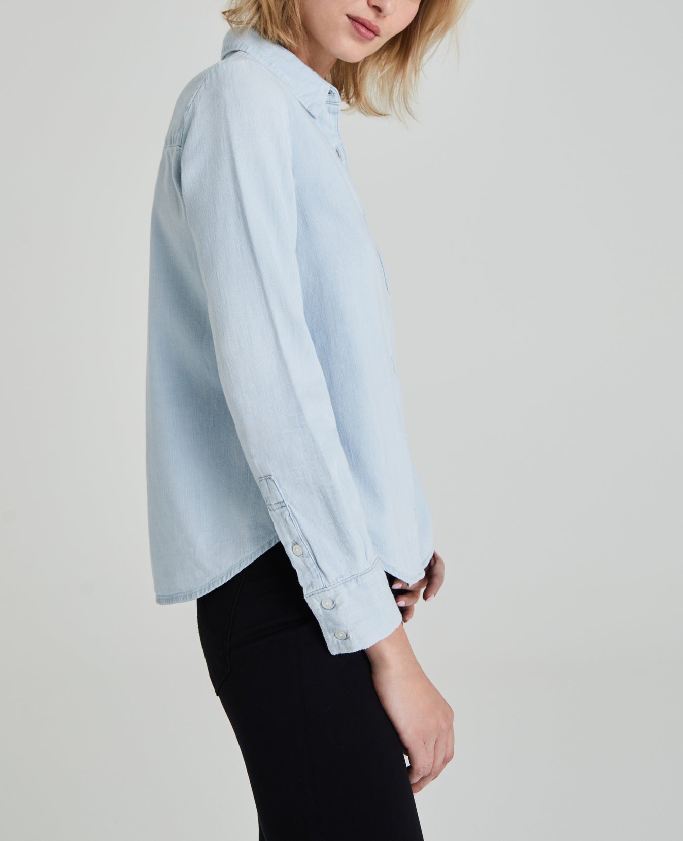 The Cade Shirt for women features a minimal light denim wash with subtle vintage-inspired fading, classic button-down construction, dolphin hem, cuffed sleeves, and a slim fit. This women's button-up shirt is designed in non-stretch crosshatch denim with lightweight fabrication and finished with an authentic slub character.