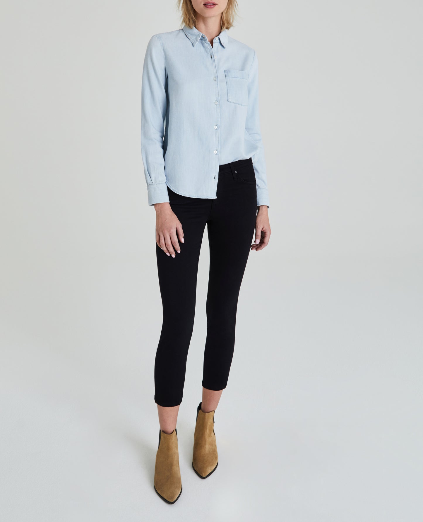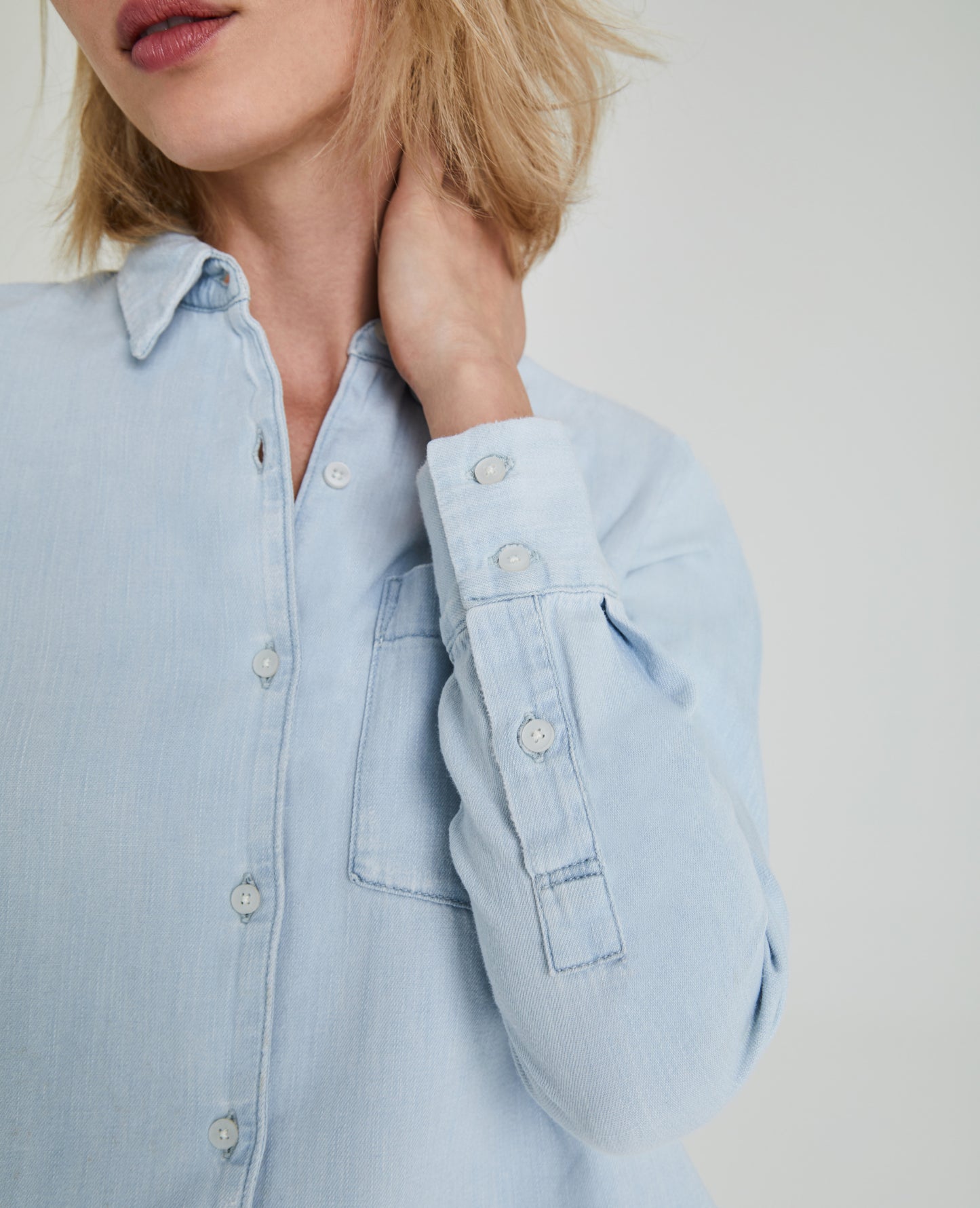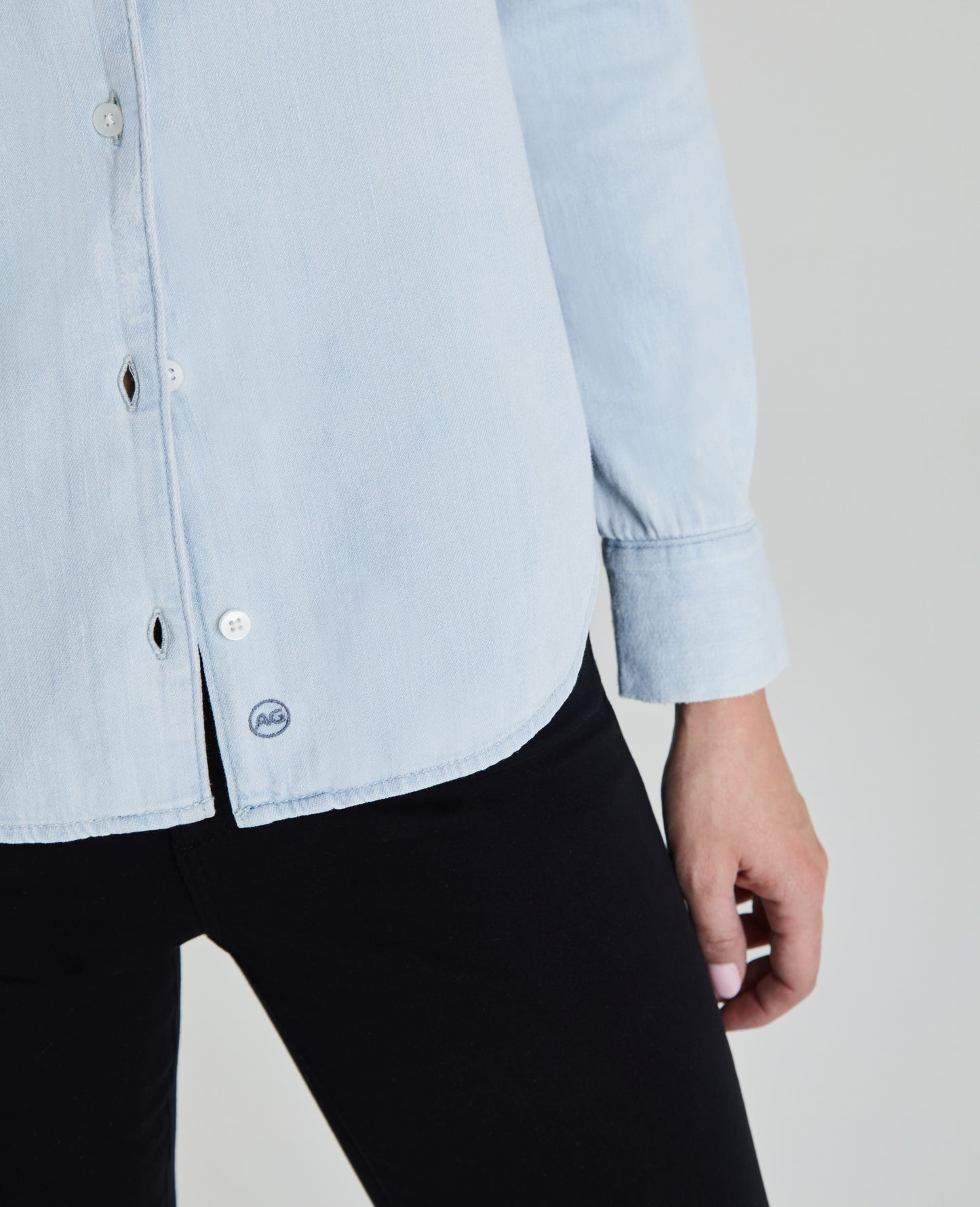 The Cade Shirt for women features a minimal light denim wash with subtle vintage-inspired fading, classic button-down construction, dolphin hem, cuffed sleeves, and a slim fit. This women's button-up shirt is designed in non-stretch crosshatch denim with lightweight fabrication and finished with an authentic slub character.